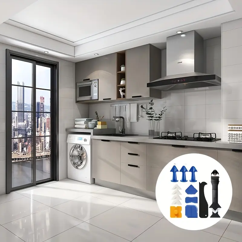 This versatile tool kit is perfect for various home improvement tasks. It includes a caulk remover, grout removal tool, caulk finger, and glass adhesive angle scraper. Ideal for bathroom flooring, kitchen, window, sink joint, and frames seal. Each tool is designed to handle different sealing and removal needs.