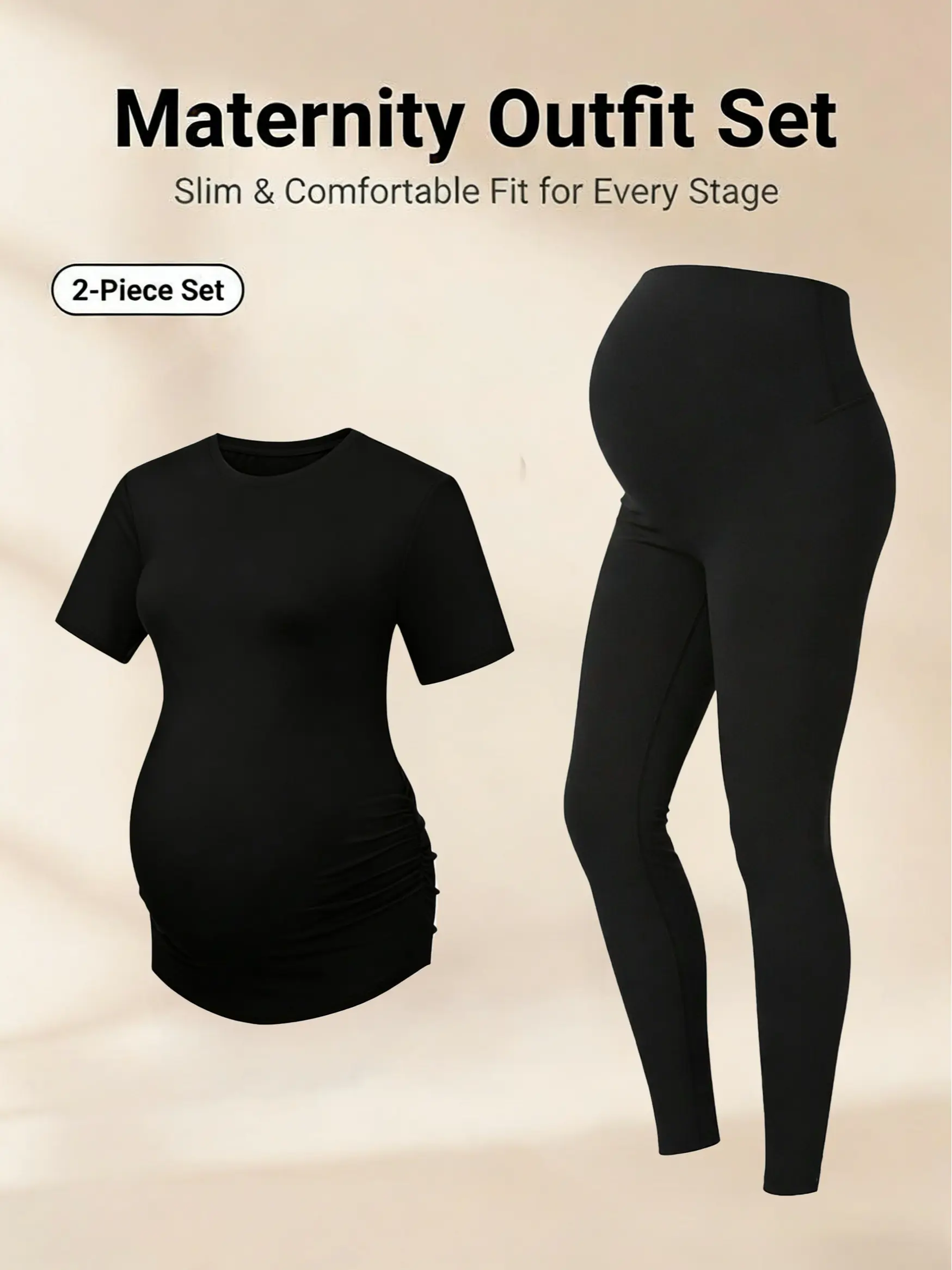 ·2-Piece Set (Top + Leggings): Ruched Short Sleeve Top + High Waist Maternity Leggings