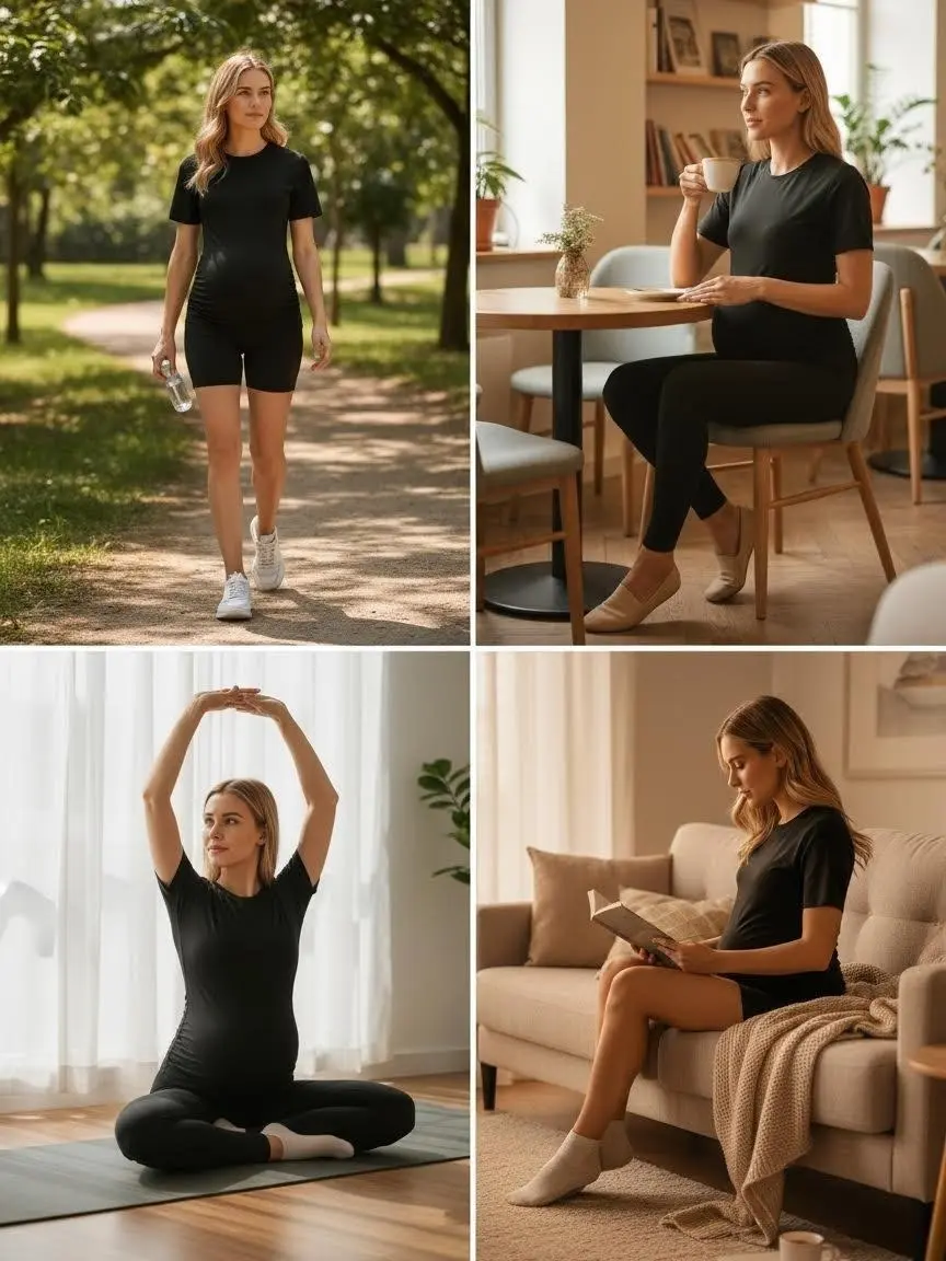 The side-ruched design of the top gently hugs your growing belly without tightness, while the high-waisted bottoms provide full abdominal support, smooth your silhouette, and stay in place all day long. No sagging, no rolling, just a sleek, confident look from first trimester to postpartum.