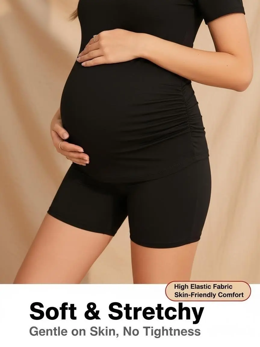 ·3-Piece Set: Ruched Short Sleeve Top + High Waist Maternity Leggings + Maternity Biker Shorts
