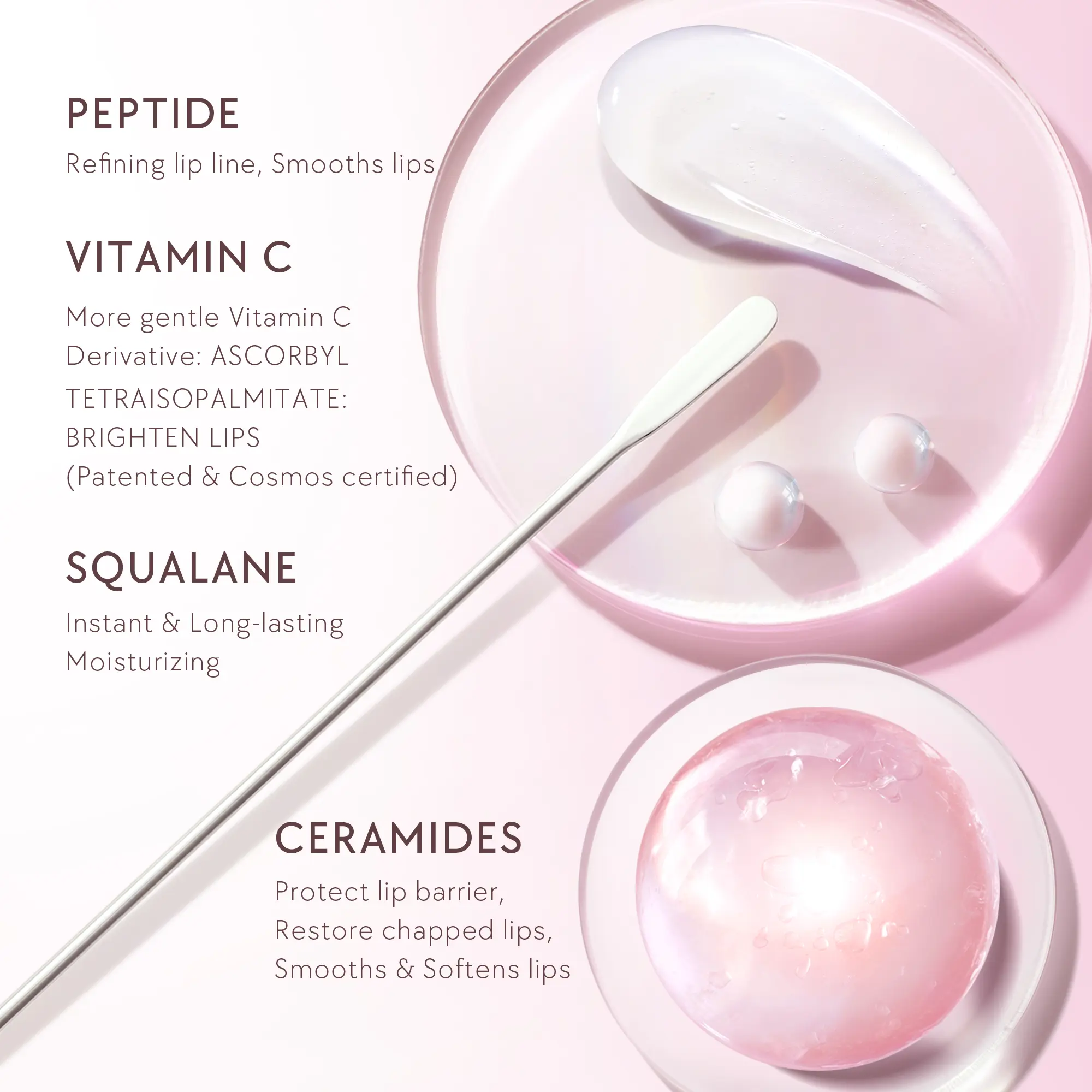 ·Enriched with Peptide, Vitamin C, and Squalane. Works simultaneously to brightens dark lips, moisturizing and smoothen lips