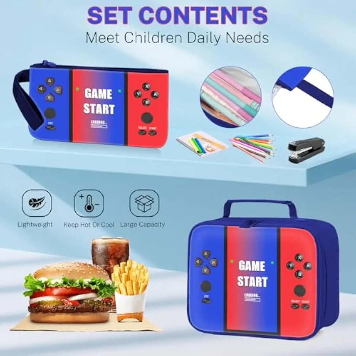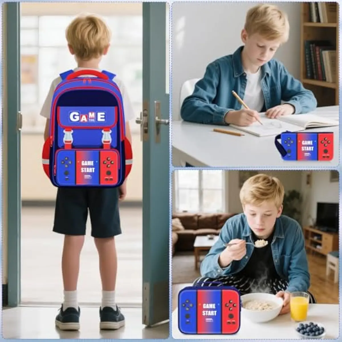 3-IN-1 BOYS BACKPACK SET This 3-in-1 school backpacks set is perfect for school! The kids backpack is 12.2"(l)x17"(h)x5.9"(w), the lunch bag is 9.8"(l)x6.9"(h)x3.7"(w), and the pencil pouch is 8"x4.3". It features vibrant patterns that add fun and personality to your child's school year.