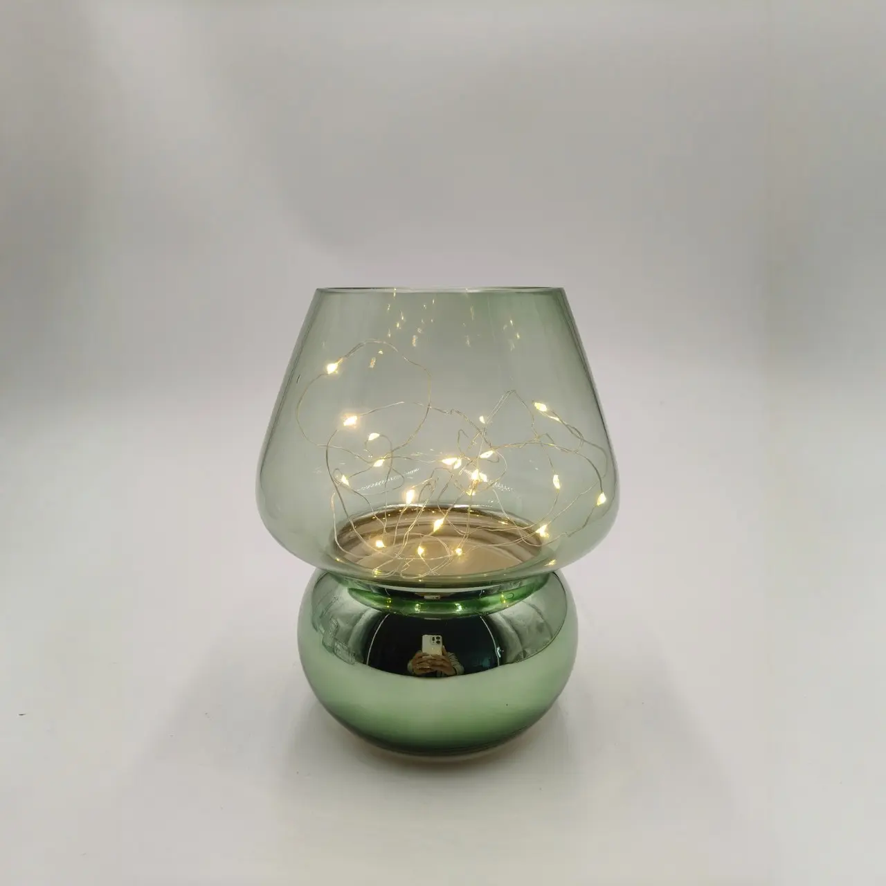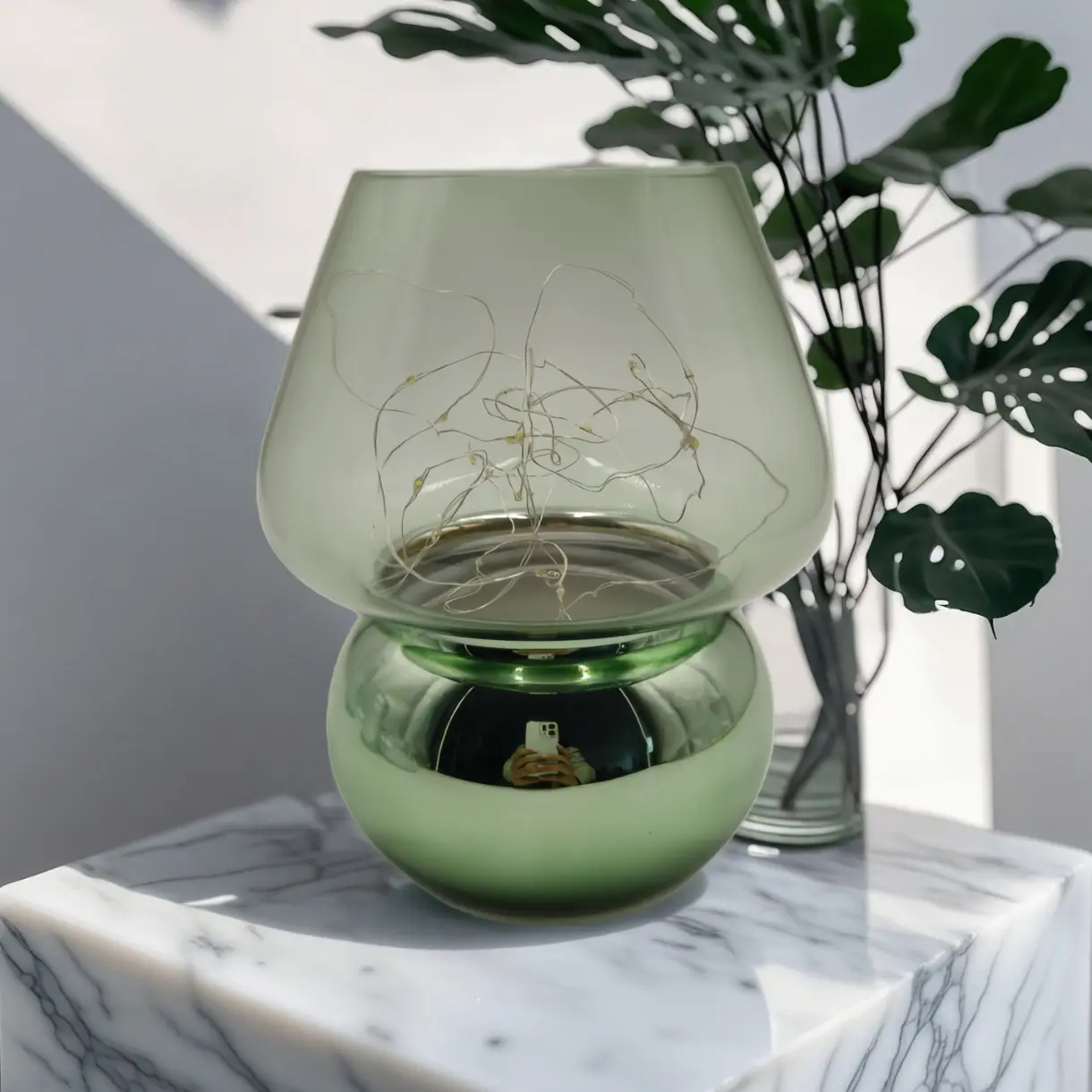 Transform any space into a cozy, dreamy sanctuary with this stunning glass LED night light. Crafted with a sleek, smoke-green glass shade and a polished, reflective metallic base, this lamp blends modern elegance with timeless charm, making it the perfect decorative accent for your bedroom, living room, or workspace.
