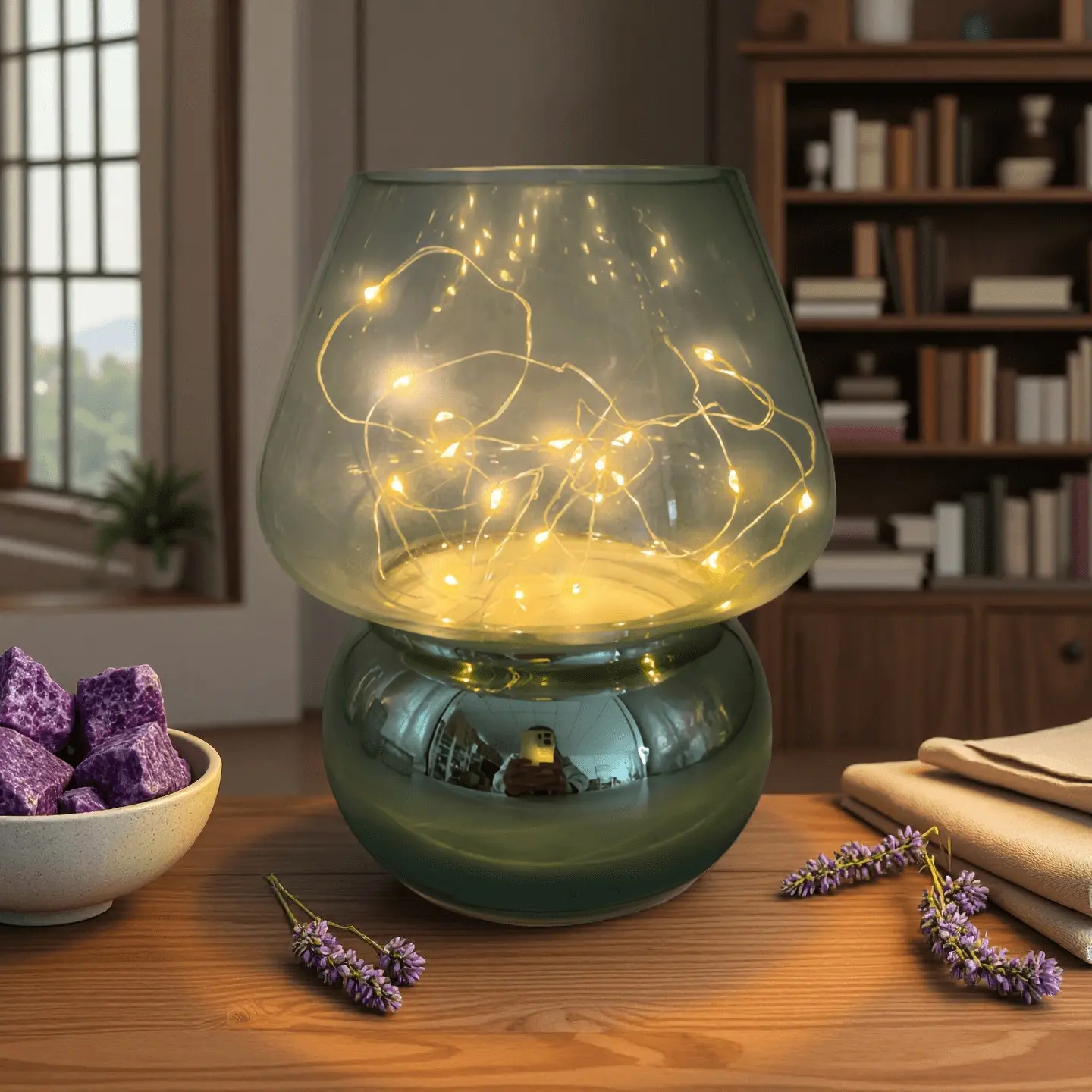 Inside the hand-blown glass dome, delicate copper wire fairy lights twinkle like a sky full of stars, casting a warm, soft golden glow that instantly creates a relaxing, inviting atmosphere. The unique, bulbous design not only amplifies the light’s beauty but also adds a sophisticated, artistic touch to your decor, elevating any shelf, nightstand, or tabletop.