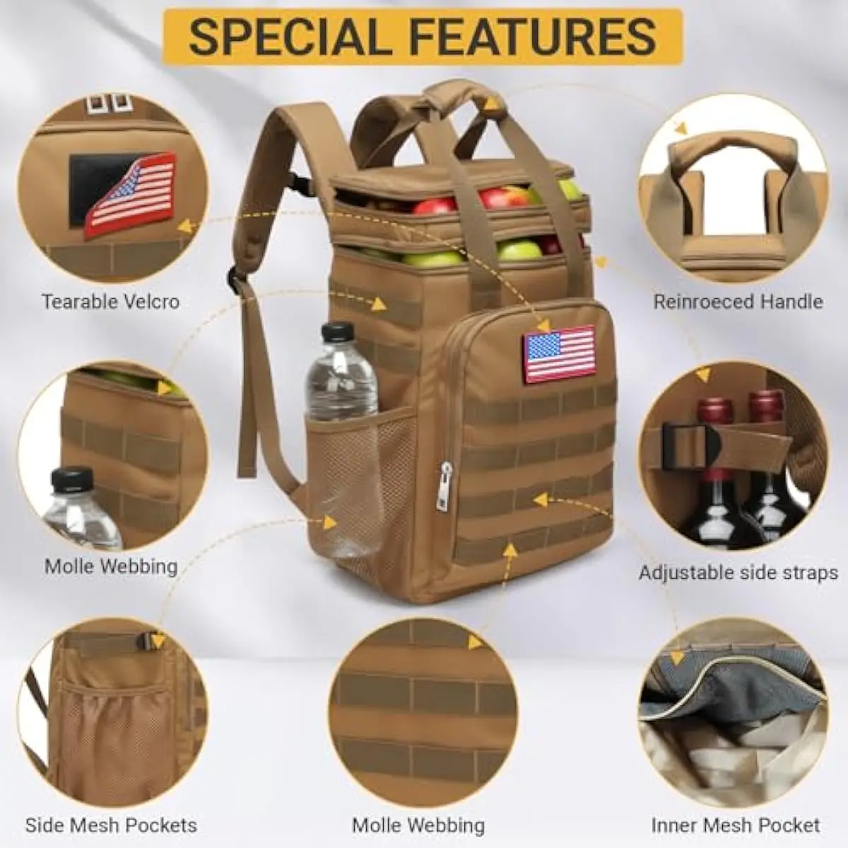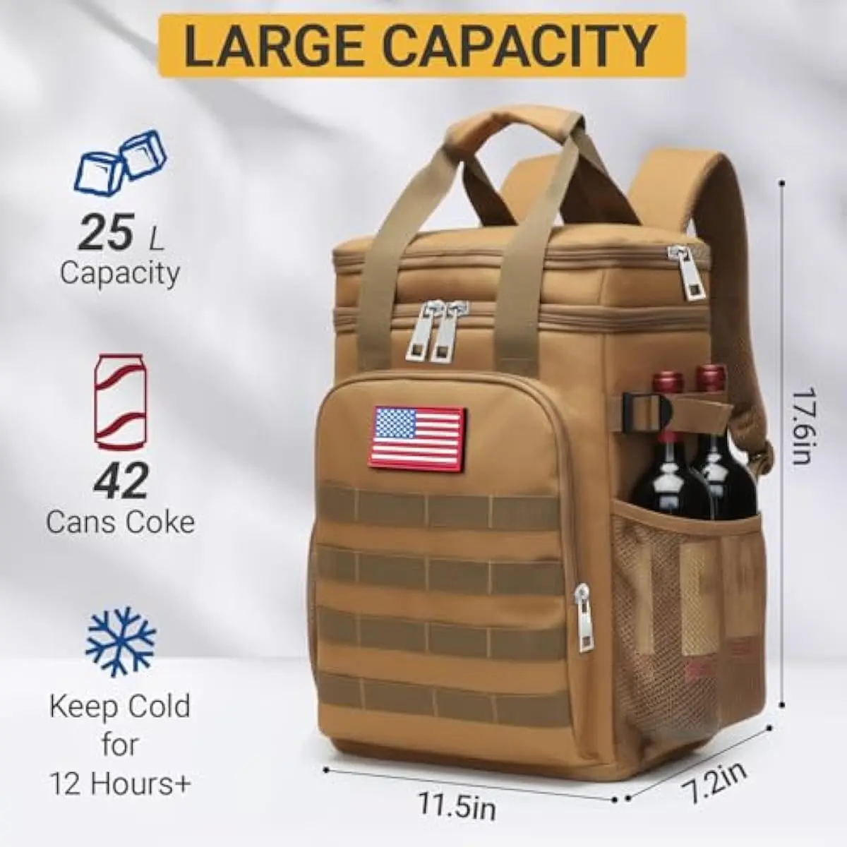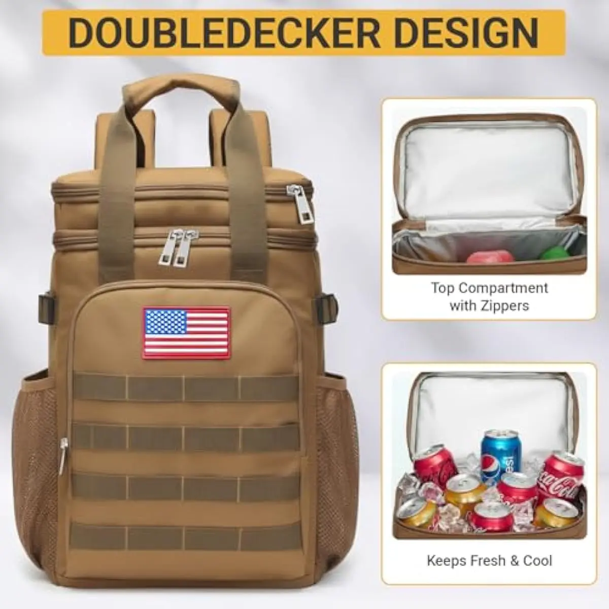READY FOR ANY ADVENTURE This waterproof backpack coolers is perfect for any outdoor activity. It includes a flag patch, a carabiner, and a removable bottle opener. This tactical lunch bag for men blends outdoor and tactical elements, looking super tough. Its an excellent insulated backpack for work, picnics, travel, beach, hiking, camping, road trips, and more!