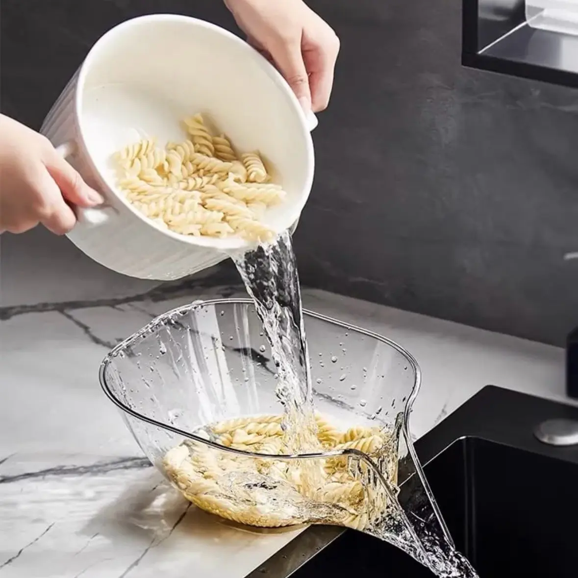 Enhance your kitchen experience with our modern, multifunctional tool, designed for the contemporary cook. Its sleek hollow-out design not only accelerates water drainage but also keeps your fruits and vegetables safe from sinking into the sink. This isn't just a strainer; it's also a stylish salad bowl, ready to use directly from rinsing to serving. Ideal for a wide range of kitchen tasks including draining pasta, washing leafy greens, or rinsing canned foods, this tool is a must-have for anyone who values efficiency and elegance in their culinary endeavors. Perfect for the modern kitchen, it's a stylish, practical solution for all your washing,straining,and rinsing needs.