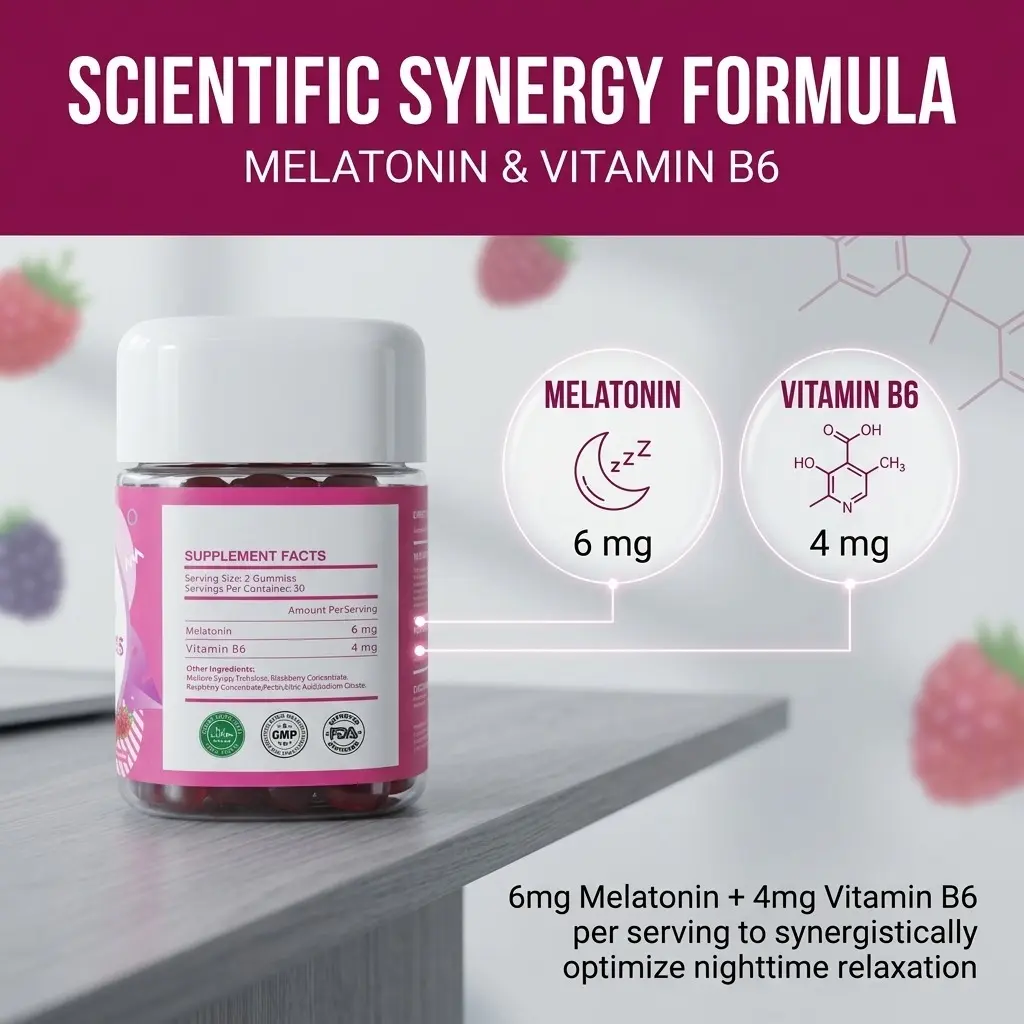 WHY YOU'LL LOVE IT: • Knock Out Faster: The synergistic blend of 6mg pure Melatonin and Vitamin B6 helps quiet the noise of the day, allowing you to sink into a deep, uninterrupted slumber. • Wake Up Rejuvenated: A perfectly balanced formula for natural recovery. No morning grogginess—just fresh energy! • Calming Berry Blend: Formulated to help you decompress after a long day. Tastes like a treat, works like a dream. • 100% Premium & Clean: Absolutely NO artificial colors, flavors, or preservatives. Non-habit forming.