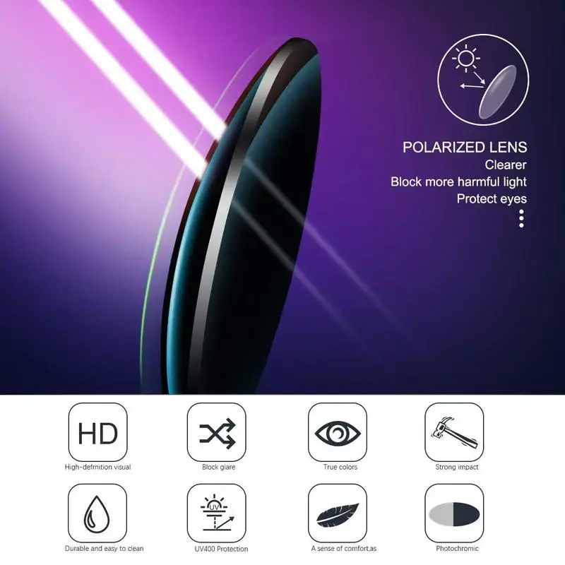 ·Anti-Glare Polarized Lenses: These lenses feature specially treated lenses that provide anti-glare and polarization protection, reducing glare from roads, bodies of water, snow, and other horizontal surfaces.