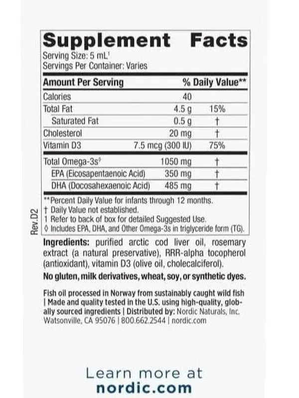 Nordic Naturals DHA Liquid Supplement is provided in a 4 oz bottle with an unflavored formula. This product offers a convenient liquid format for those who prefer flexible daily use. The formula includes omega-3 and vitamin D3 in a simple, easy-to-use option.