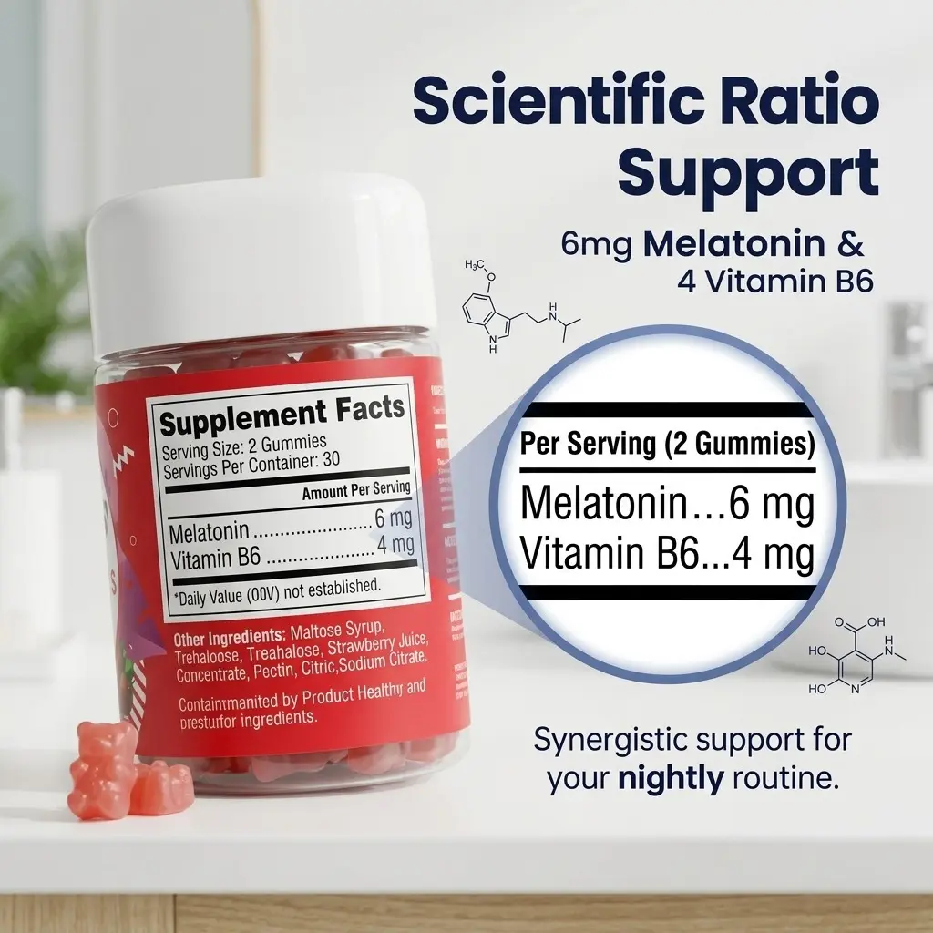 WHY CHOOSE OUR STRAWBERRY GUMMIES? • 6mg High Potency Melatonin: Reliable strength to help reset your internal clock. Perfect for jet lag or occasional sleeplessness. • Pectin-Based (Vegan Friendly): A healthier, plant-based alternative to traditional gelatin gummies. No sticky teeth! • America's Favorite Flavor: Bursting with natural, juicy strawberry taste. You'll actually look forward to taking them. • Laboratory Tested & Trusted: GMP-certified quality. Free from artificial dyes and harsh chemicals.