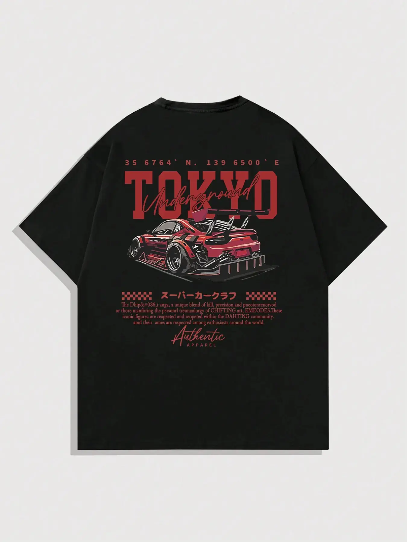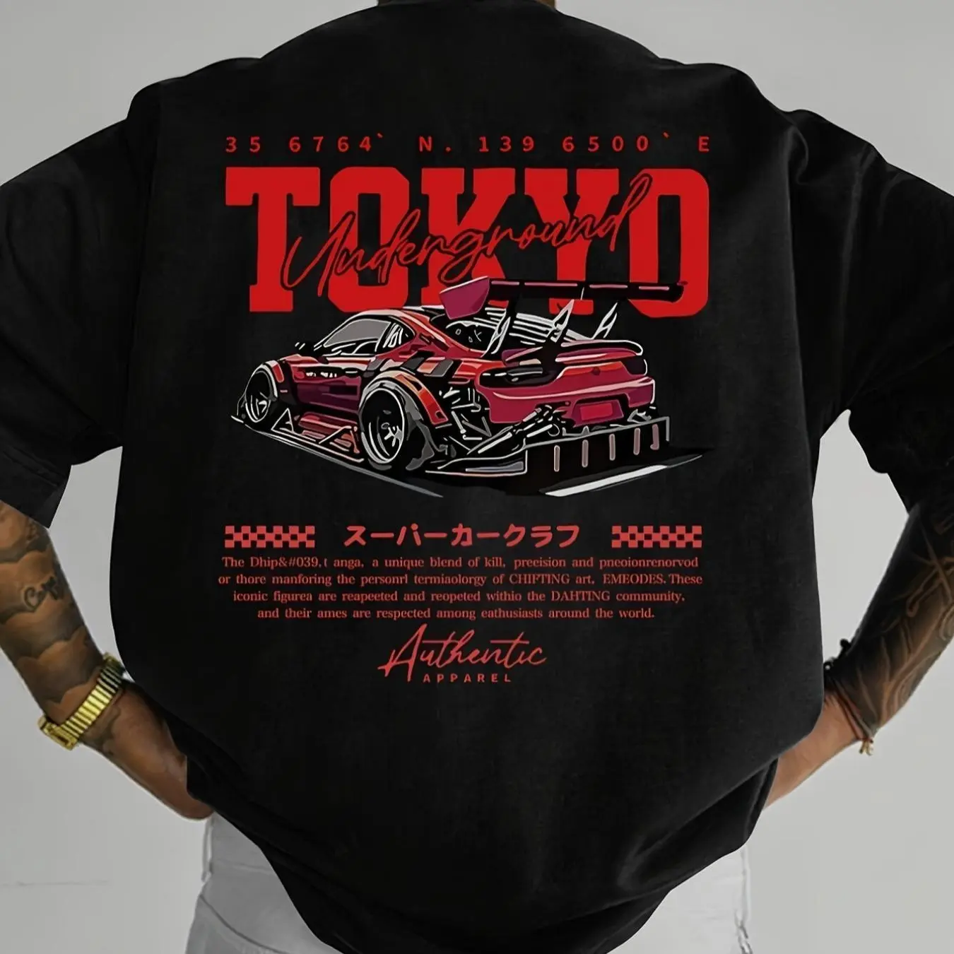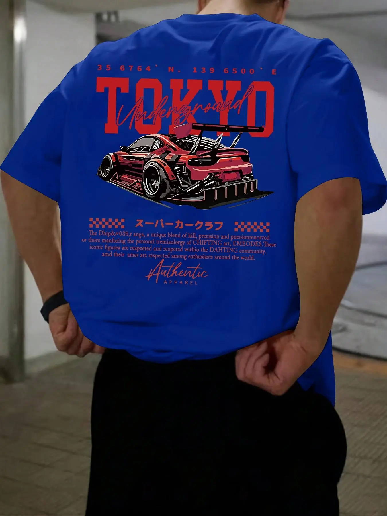 Men's Regular Fit Car & Letter Print Round Neck Tee, Street Fashion Casual Short Sleeve T-shirt for Daily Wear, Men's Top for All Seasons, Tropical, Streetwear