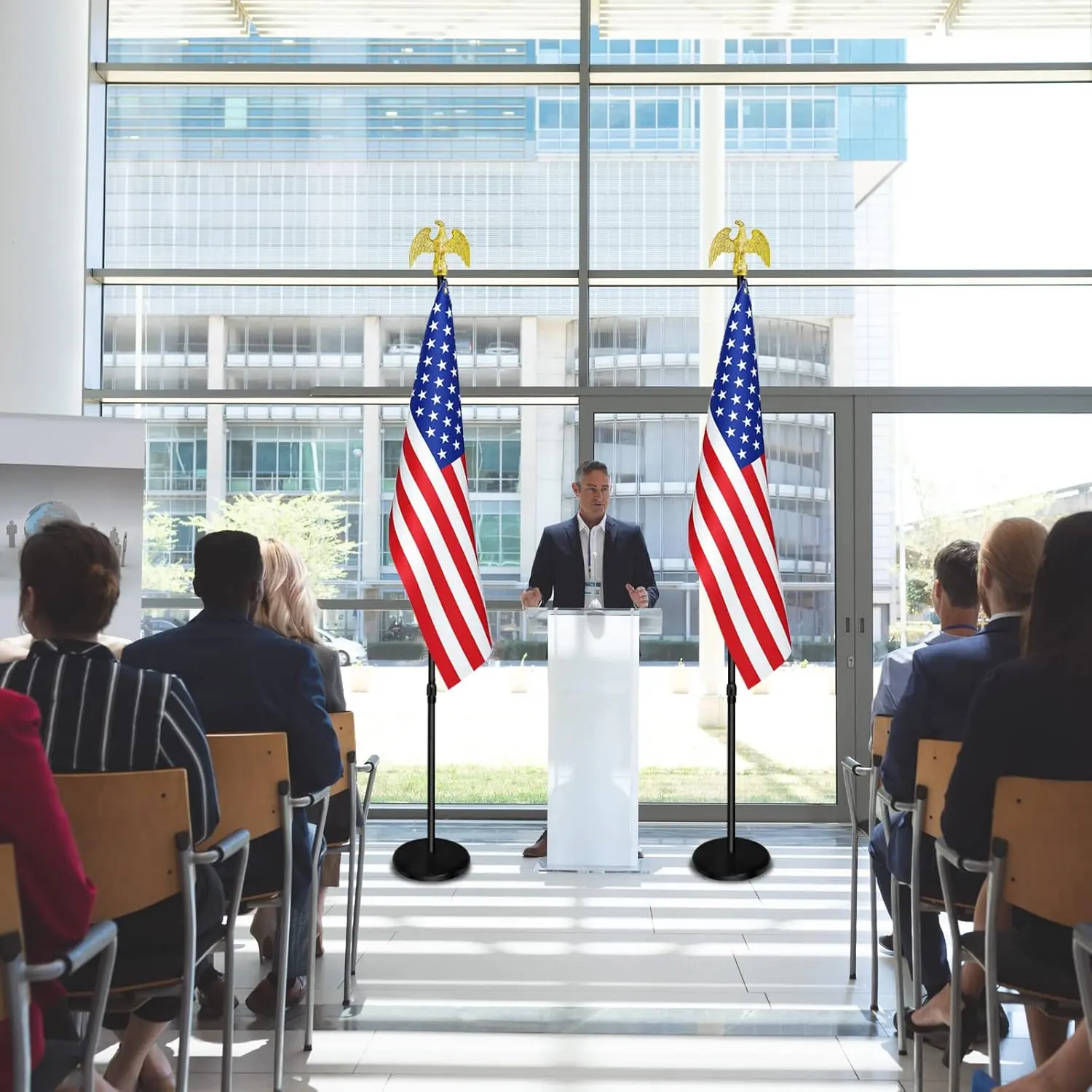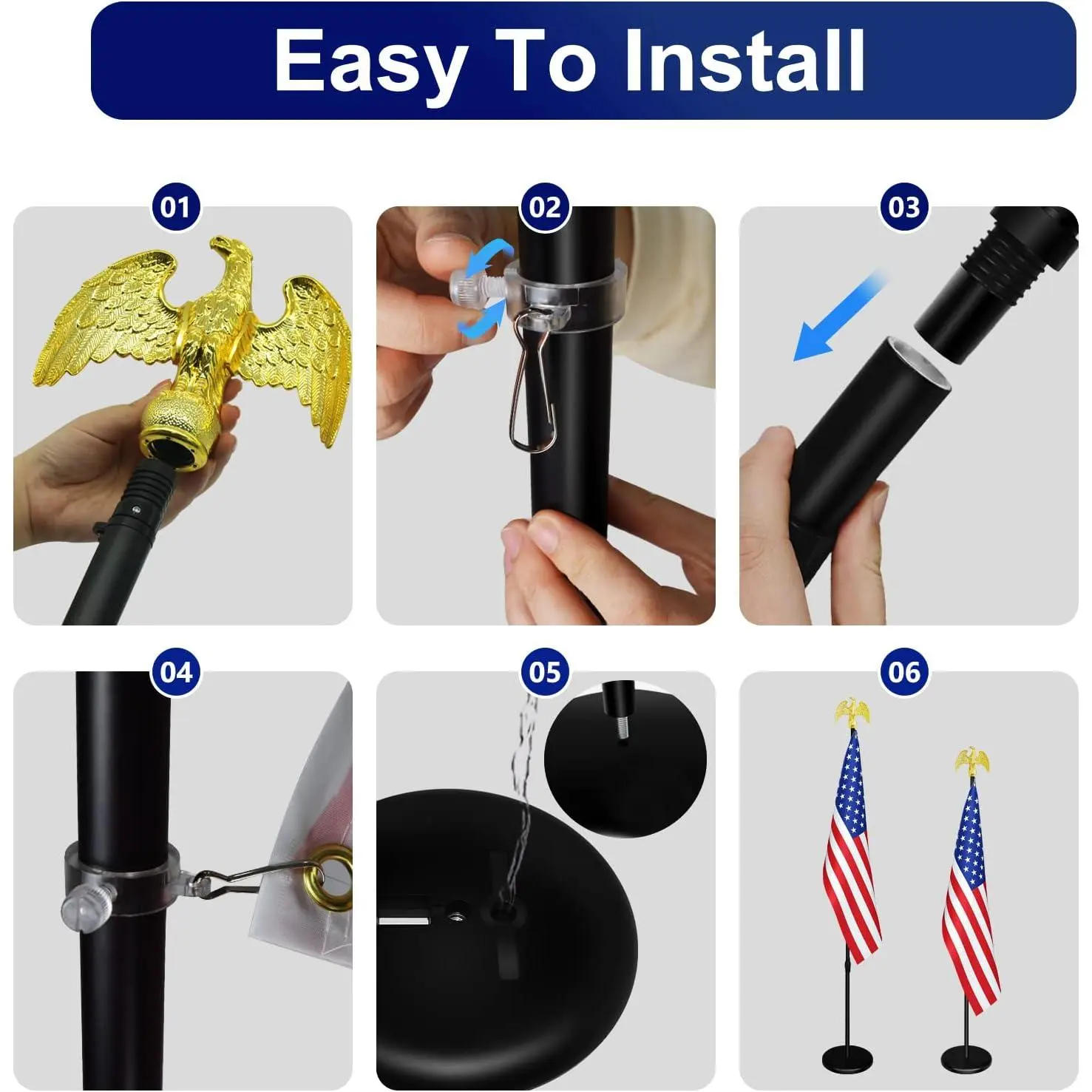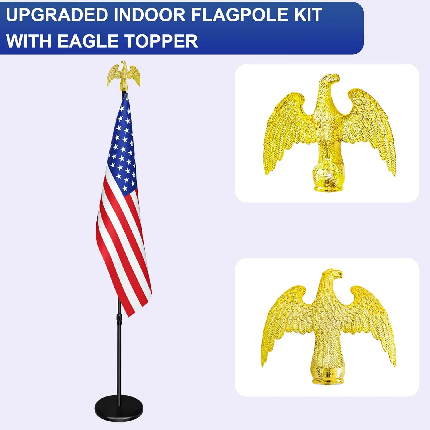 EVERYTHING YOU NEED PROVIDED It comes with an 8FT extendable aluminum indoor flag pole with eagle topper, a FREE 3x5 FT durable American flag and a floor stand base with premium quality.Everything you need is provided and you do not have to take many time to look for the correct size of the flag, flag pole or the floor stand baseHIGH PREMIUM MATERIAL If you want to free yourself from the hassle of cleaning and maintaining the flagpole, then aluminum is the suitable option for you.Telescopic flagpoles made of aluminum are durable,stable and lightweight and don’t need maintenance to keep it looking newMORE STABLE BASE The floor stand thickened and weighted metal base weight 1.6lbs of 10 inch diameter is heavy enough to keep the flagpole stable, and an opening at the bottom of the pedestal base allows you to add water or sand into the base for extra weight for added stabilityEASY TO INSTALL & ADJUST Adjust the pole's telescoping sections to any height from 6"to 8"with a quick and easy twist-lock setting that ensures an easy installation which allows you finish the installation in minutesTANGLE-FREE FLAGPOLES The pole comes with a 360°self-rotating and tangle-free design with a rotatable ring to effectively reduce tangling