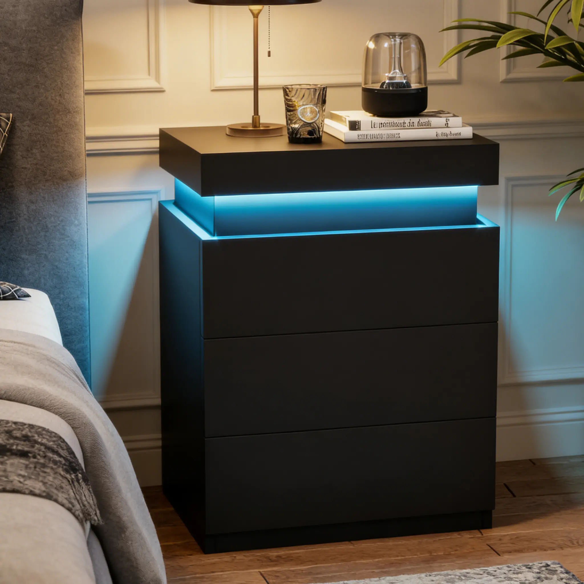 This LED nightstand is made of good quality MDF, durable and stable. It's with a top drawer and three bottom storage drawers, which provide sufficient storage options for customers. Its elegant appearance adds so much charm to the bedroom.