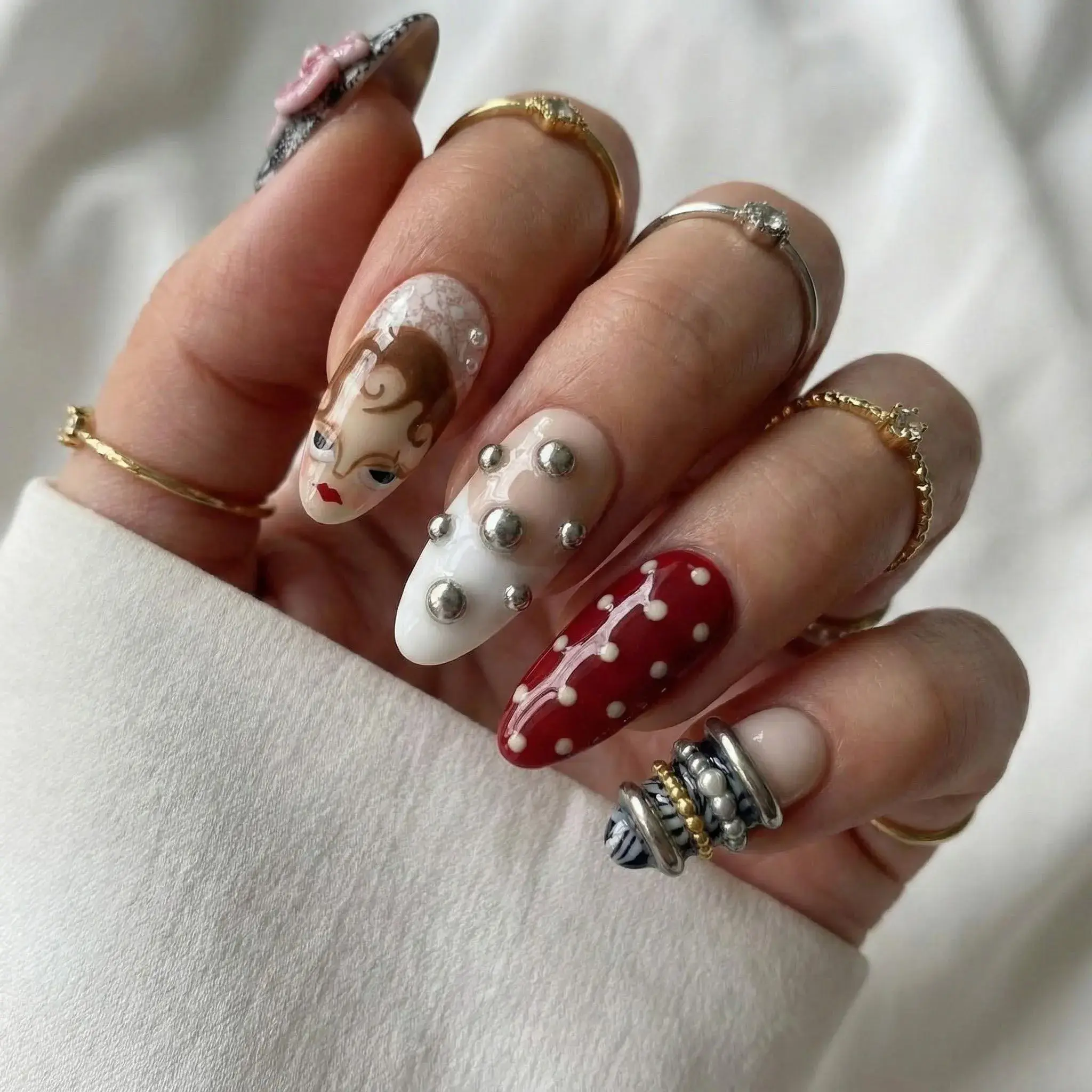 Vintage Doll Press On Nails | Retro Polka Dot & Leopard Nail Art | 3D Sculpted Character Nails | Statement Long Almond Nails