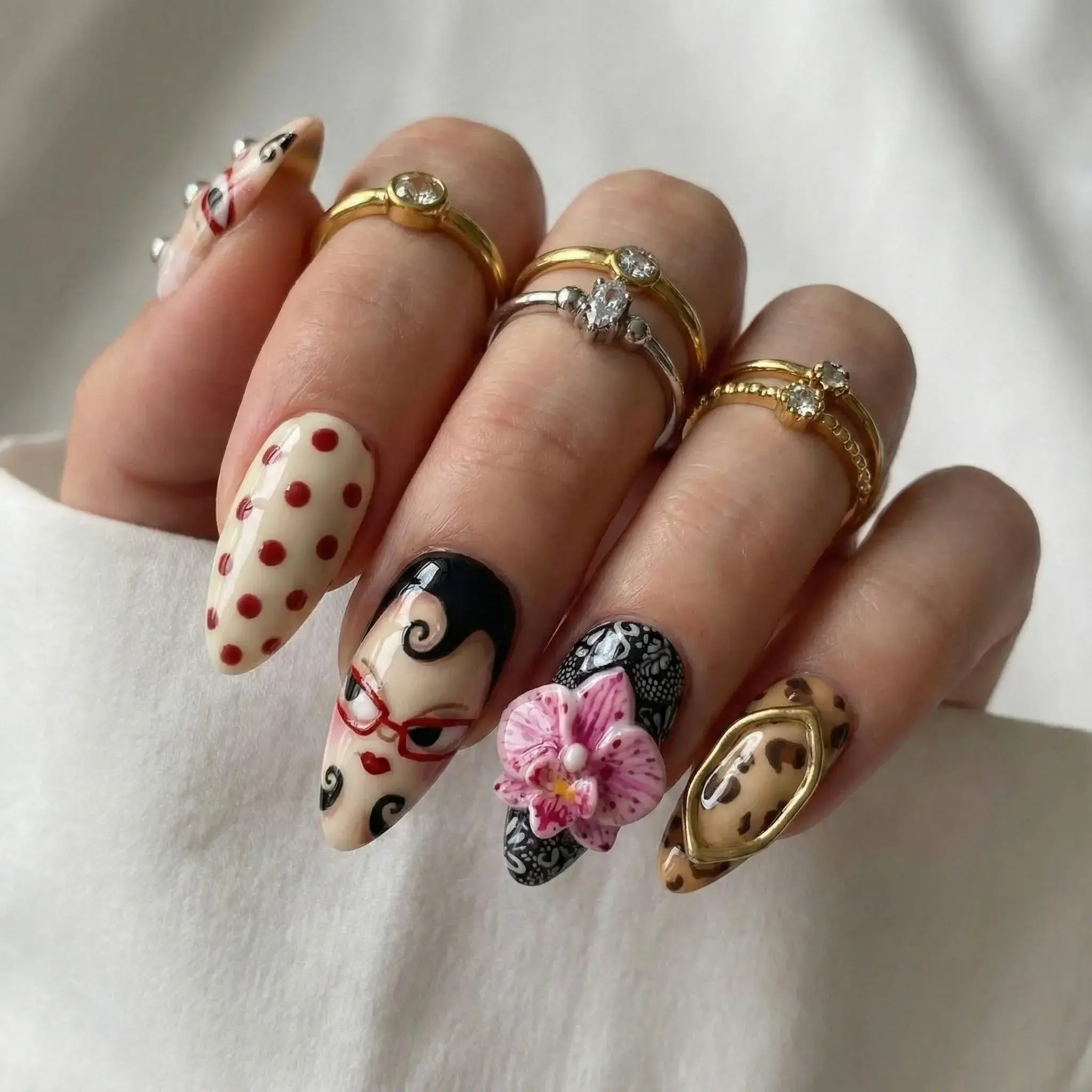 Choose from polka dot and leopard patterns. These designs are perfect for those who love retro aesthetics. The 3D sculpted characters add an extra layer of detail. Express your personality with these eye-catching nails.