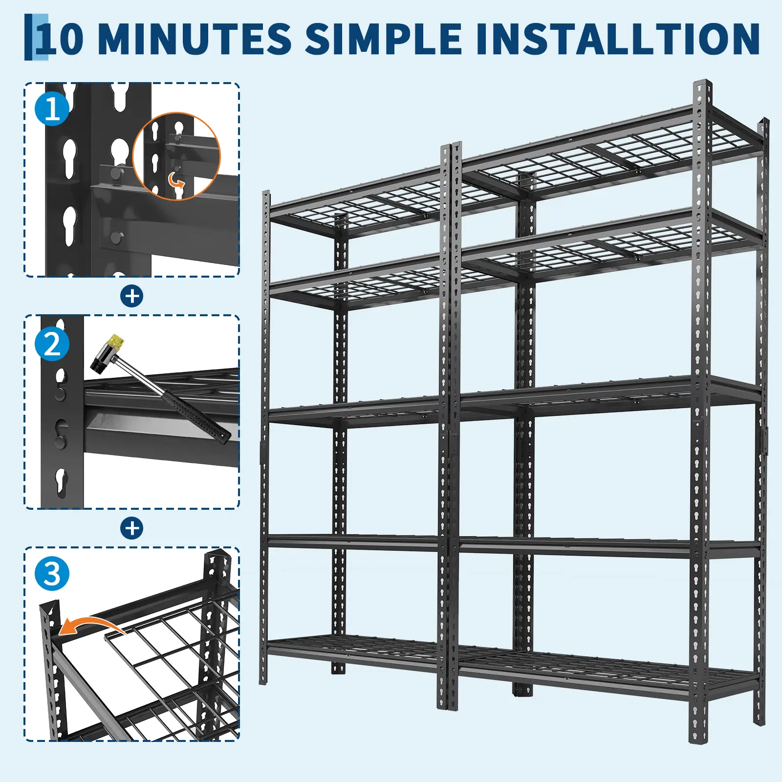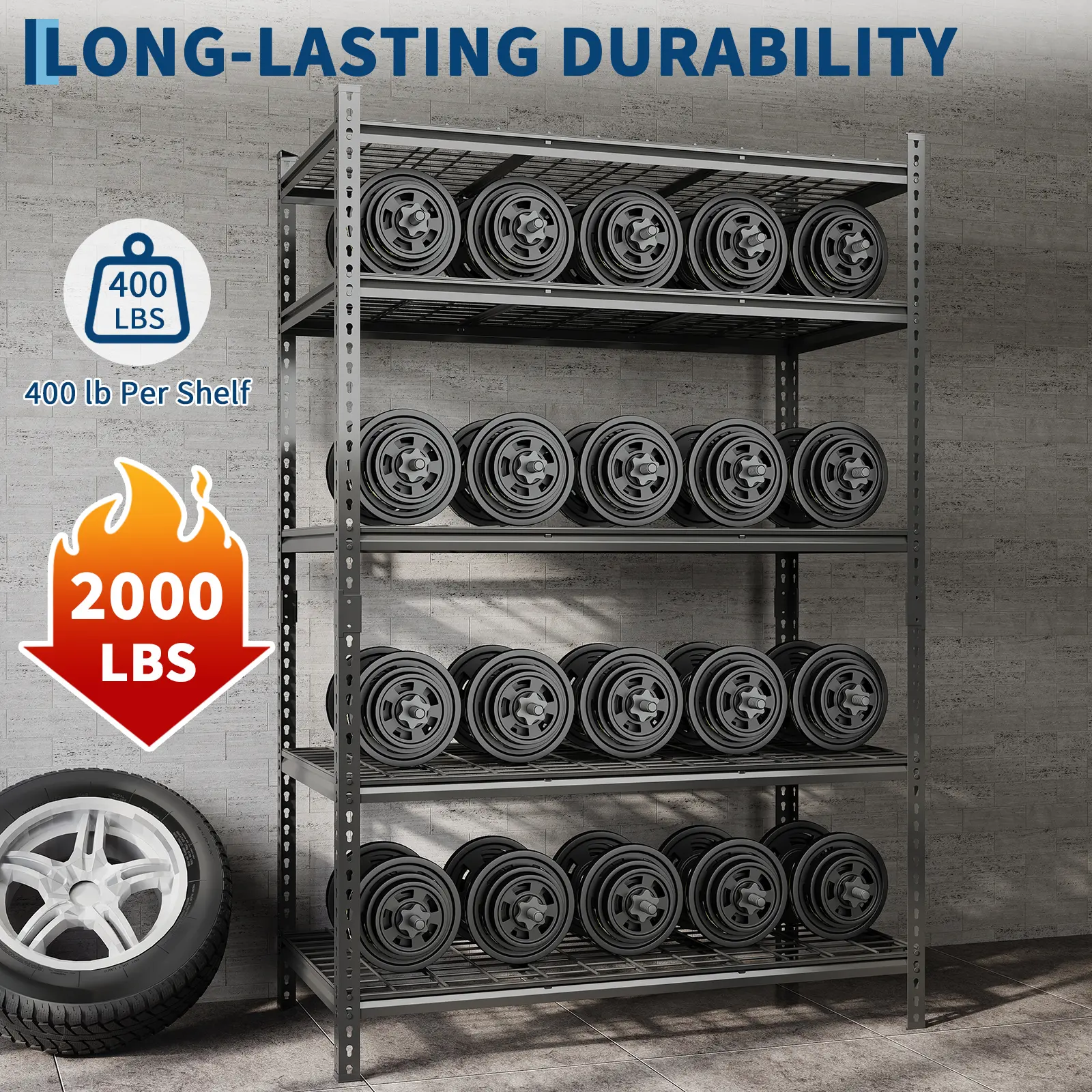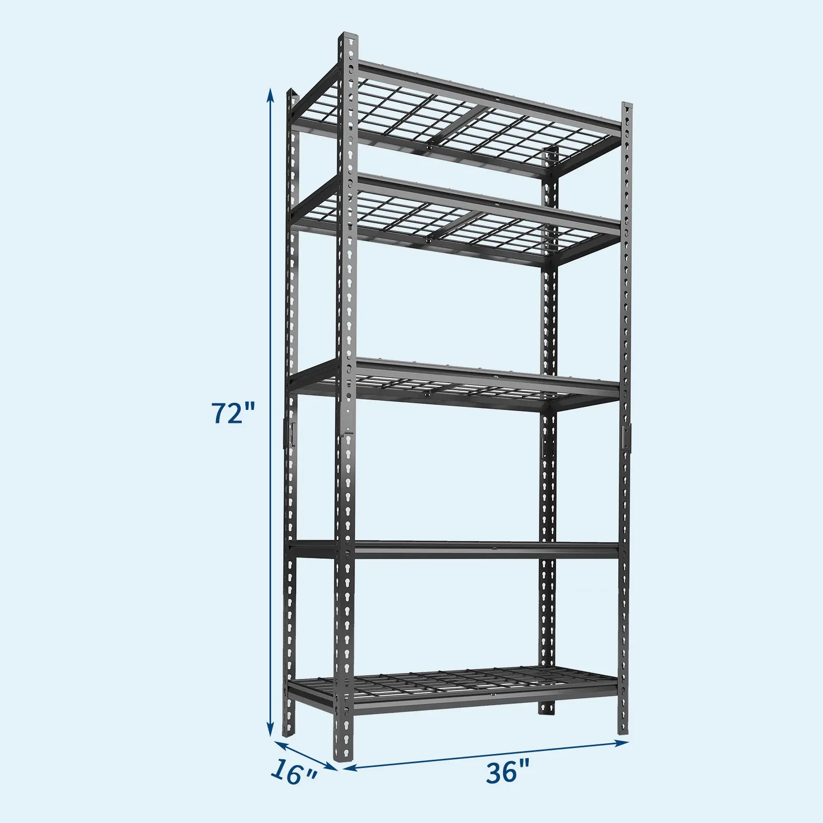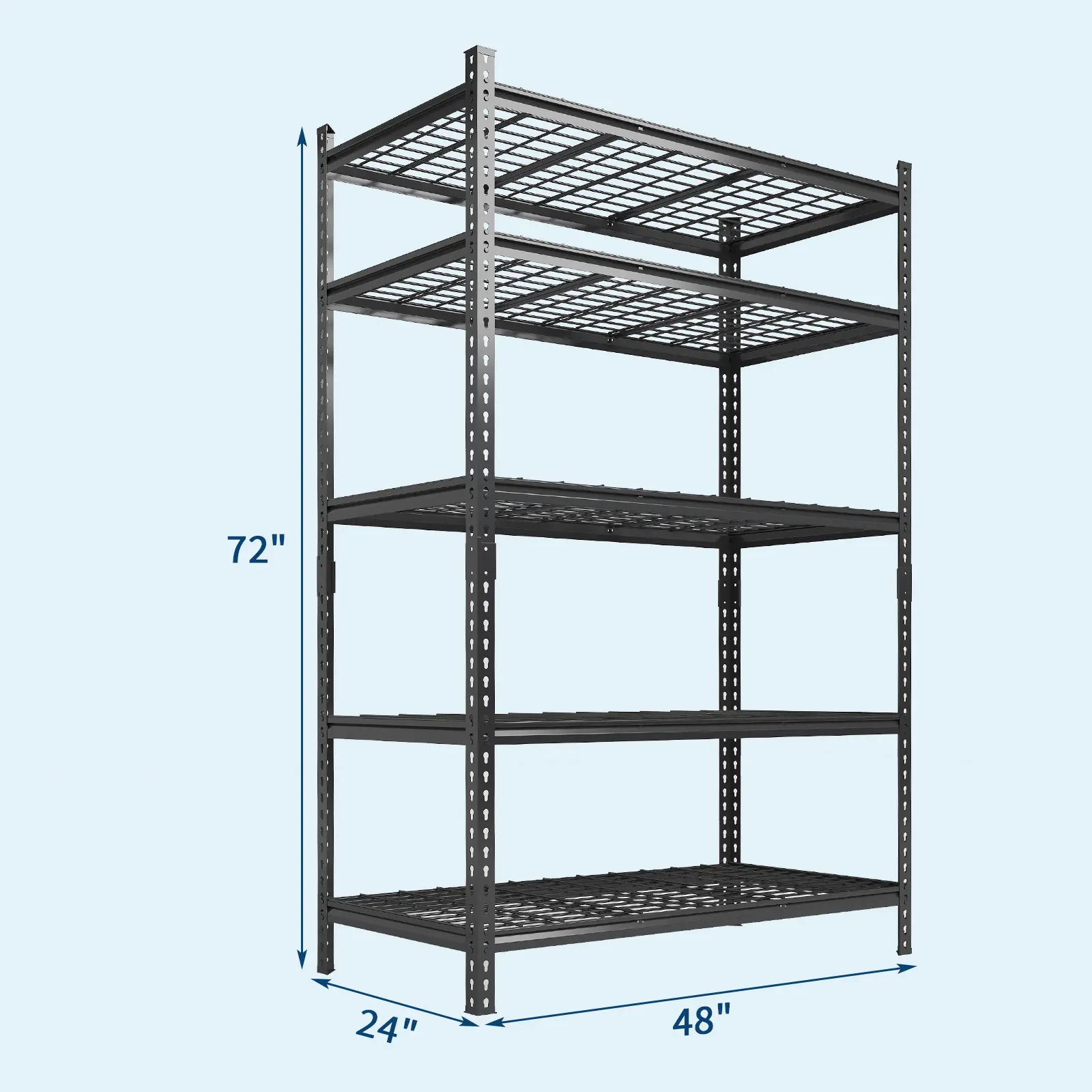 Restore your garage, basement, or workspace with this robust 5-tier metal shelving unit. Engineered for heavy duty performance, each shelf is built from high-quality steel and features an anti-rust black finish for long-lasting durability. With a maximum weight capacity of up to 2000 lbs, this shelving rack easily supports power tools, bins, and bulky equipment, making it ideal for garage, kitchen, pantry, warehouse, or basement organization.