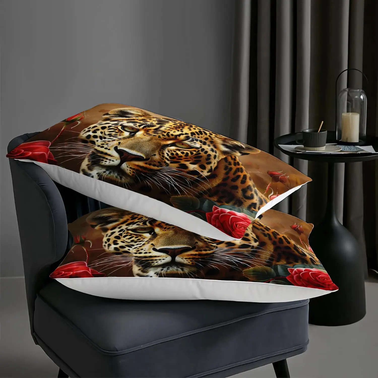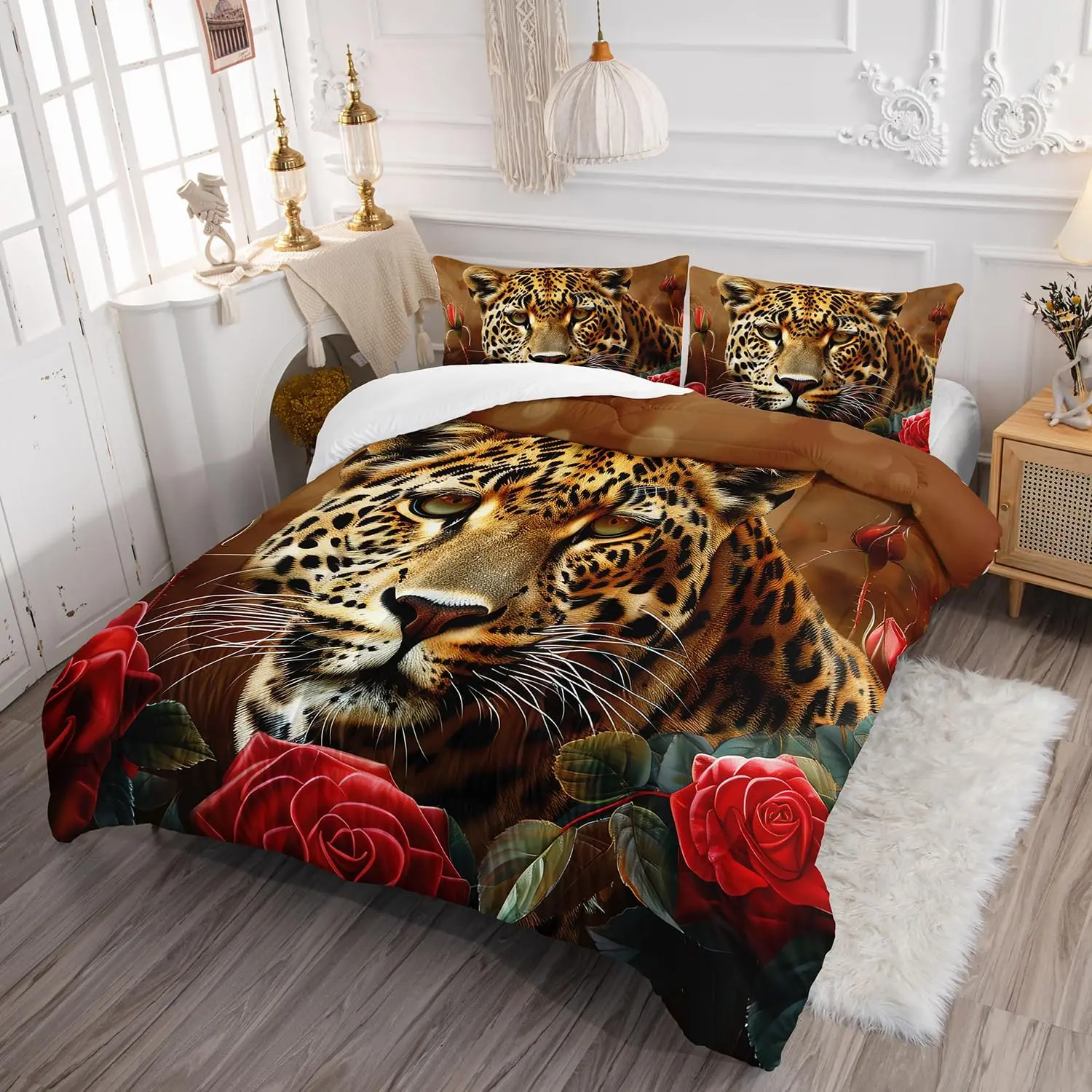 3D Leopard Comforter Set Queen Size, Red Rose Flower Bedding Set for Boys Teens,Wild Animal Leopard Print Duvet Set for Bedroom,1 and 2 Pillowcases,3 Pieces