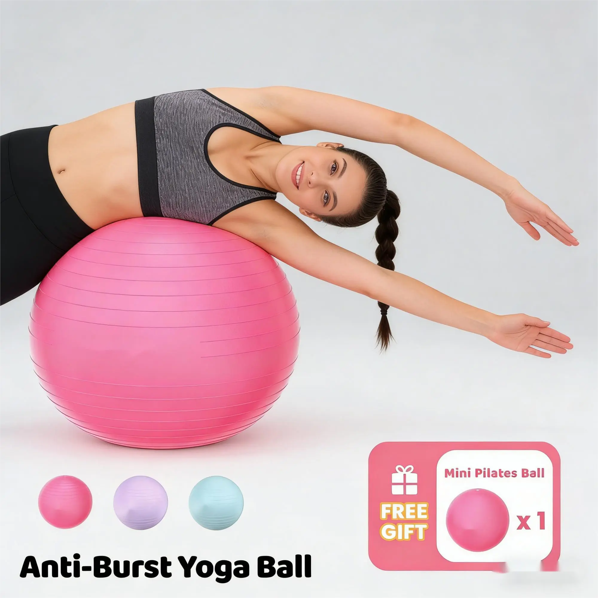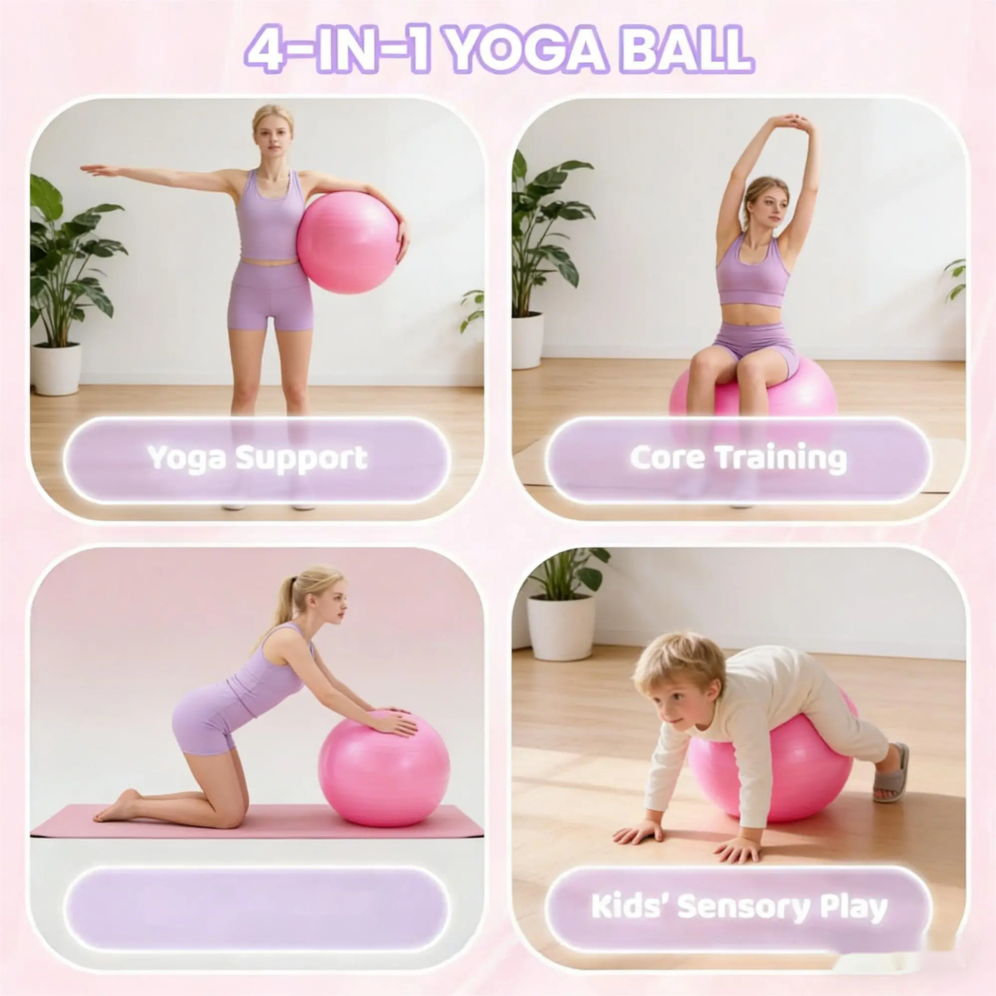 A versatile essential for home workouts, this ball supports yoga & Pilates practice, core & strength training, posture improvement, and kids' sensory play, catering to users of all ages and fitness levels.