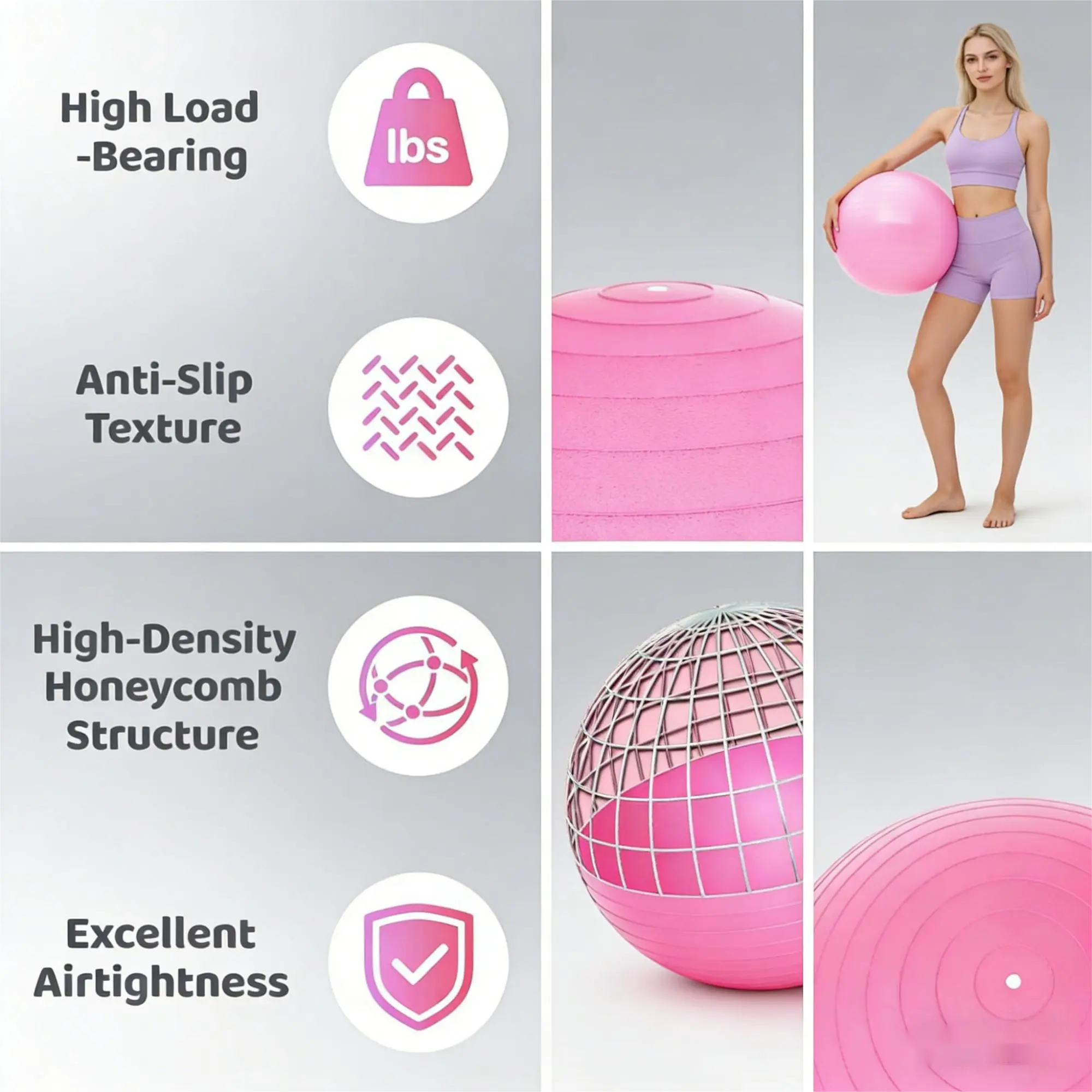 Crafted with thickened anti-burst PVC and reinforced honeycomb mesh structure, this exercise ball delivers exceptional durability and a maximum load capacity of 440 lbs. It ensures slow, controlled deflation under pressure for maximum safety during all workouts.