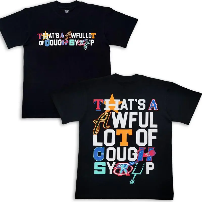 Bold Letter Mosaic Graphic Tee – Oversized Black T-Shirt with 'That’s a Awful Lot of Cough Syrup’ Patchwork Typography and Playful Icon Motifs, Unisex Streetwear Statement Tee for Fashion funny shirt shirts men