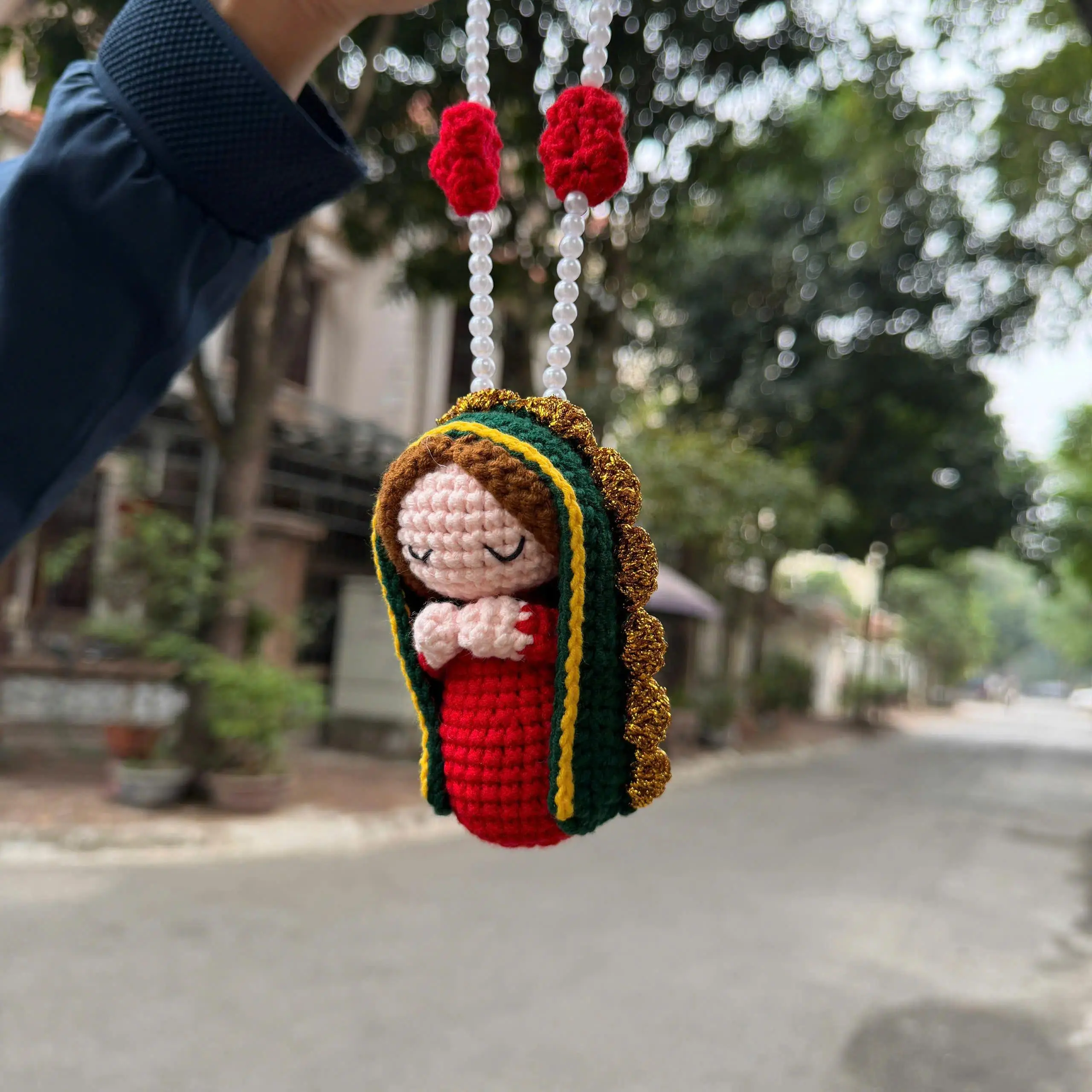 Handmade Crochet Virgin Mary Car Hanging Ornament Faith Car Charm Christian Gift for Driver Rearview Mirror Decor Cute Mary Statue Car Interior Decoration