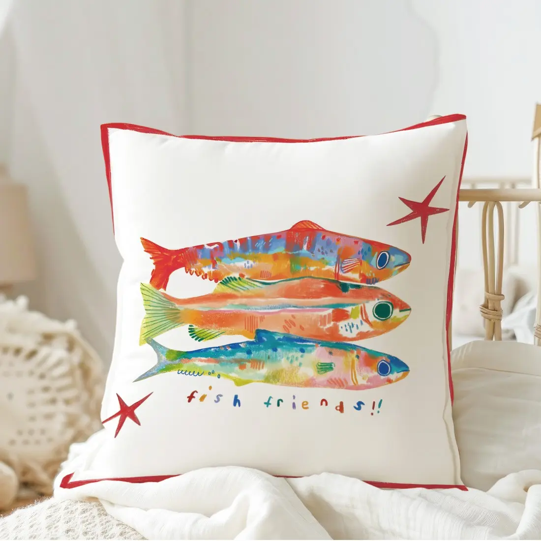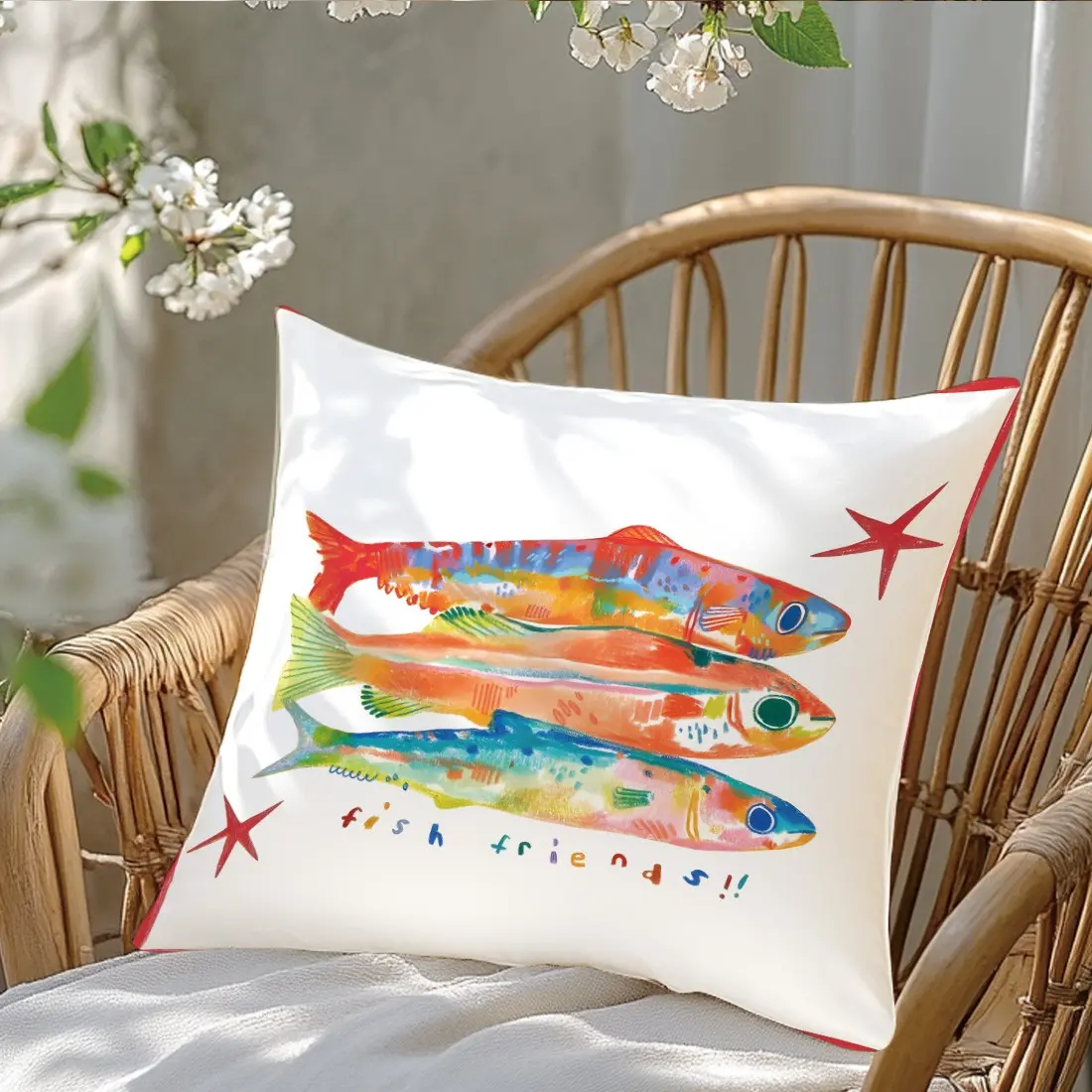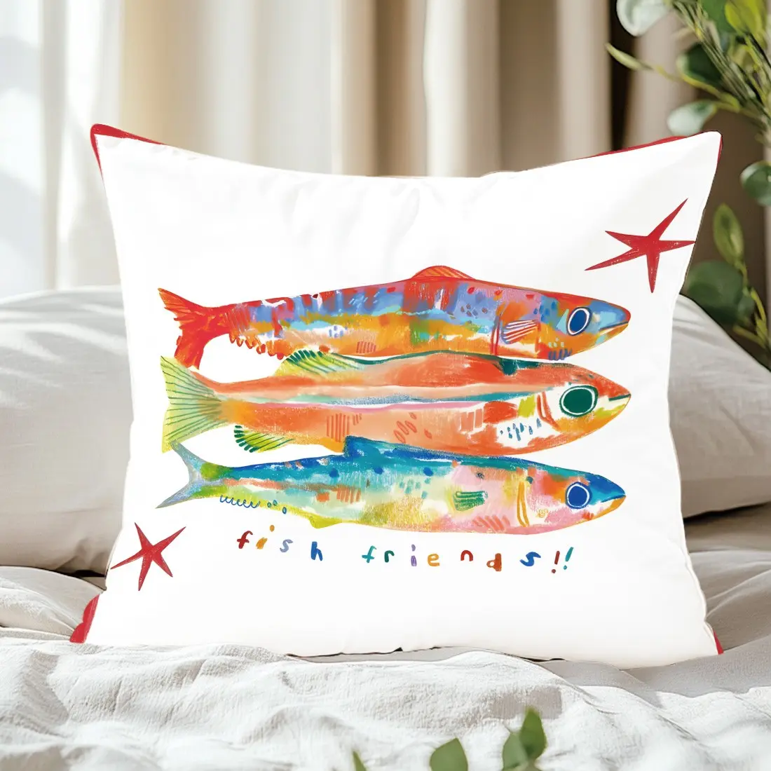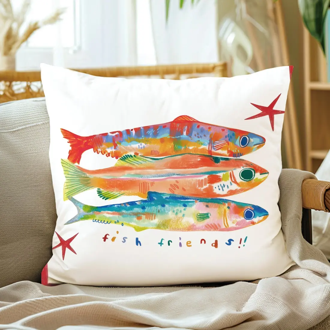 Three Fish Colorful Illustration Pillow Cover, Single-Sided Print, Home Decor for Living Room Bedroom, No Insert Included