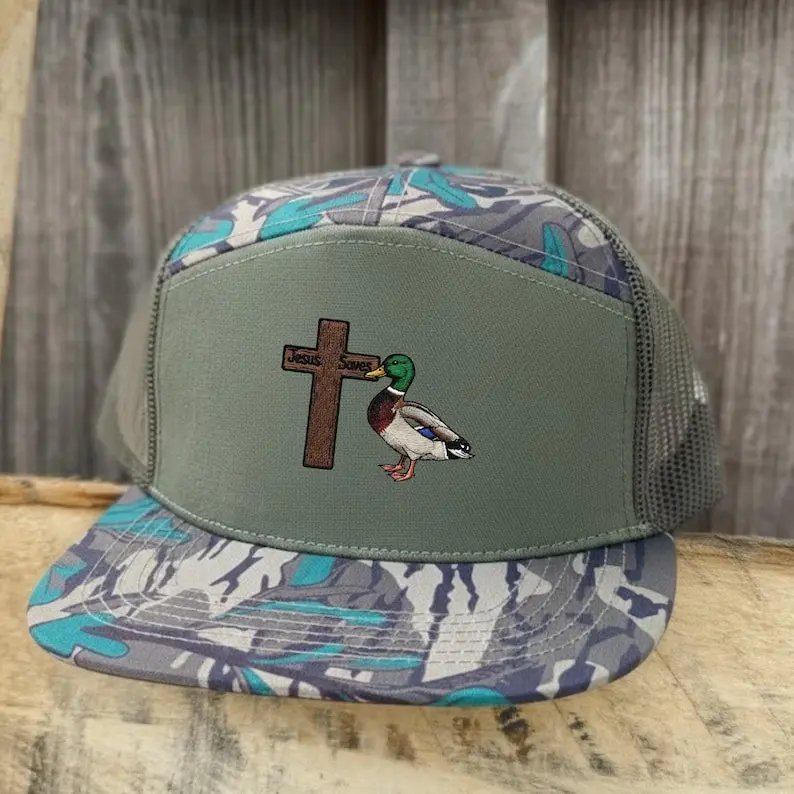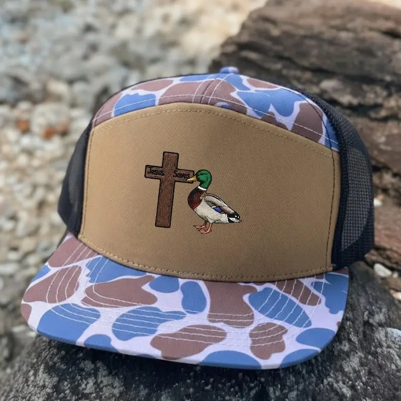 The camouflage pattern blends naturally with hunting environments while the detailed embroidered design on the front panel creates a bold centerpiece. It is a great choice for duck hunters, waterfowl enthusiasts, and anyone who enjoys the traditions and camaraderie of the hunting community.