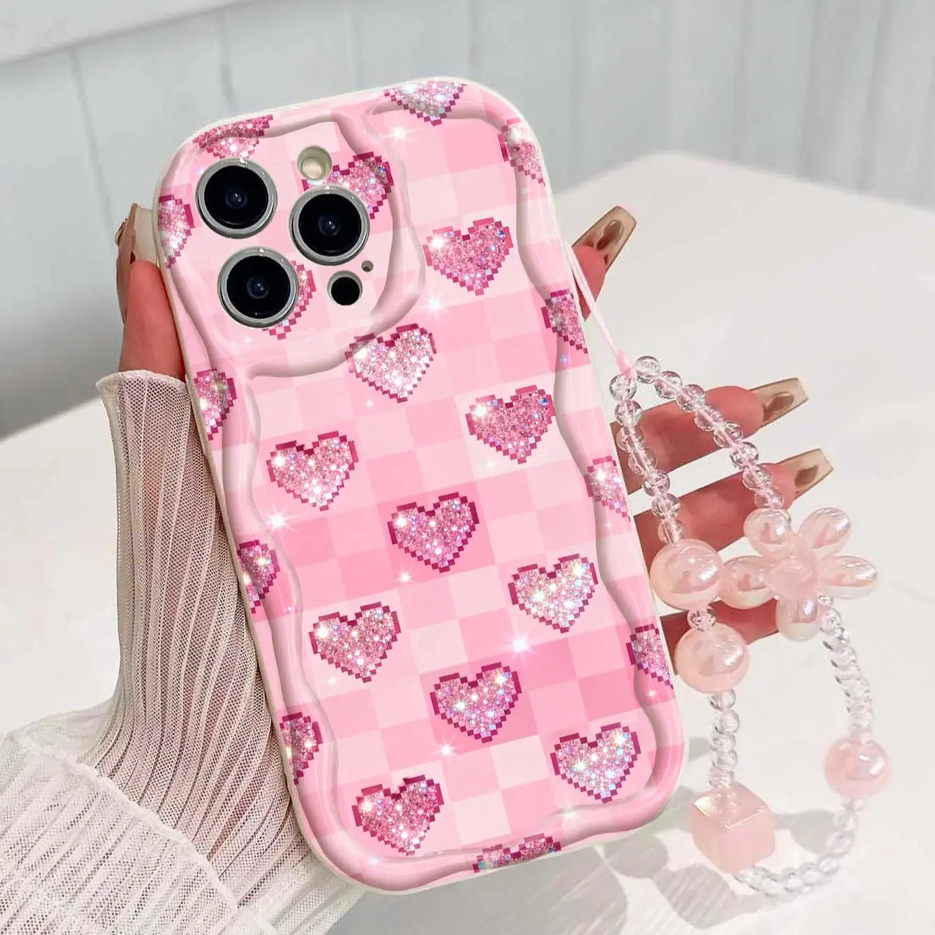 Grid Glitter Heart Lanyard Pattern Tpu Wave Edge Anti-Drop Phone Case for Apple iPhone 17 Pro Max/16/16 Pro Max/11/13/14/15, Girl's Gift