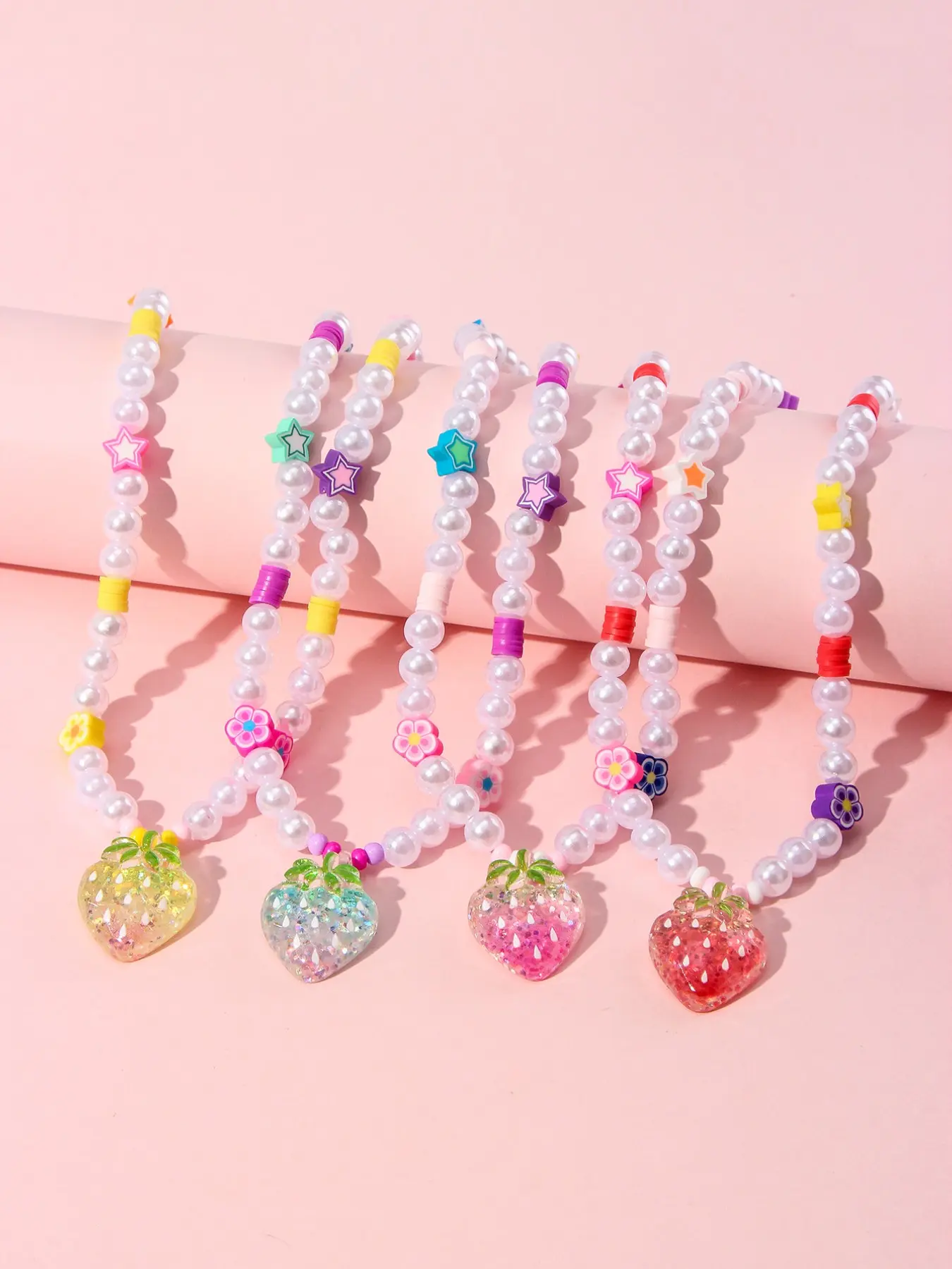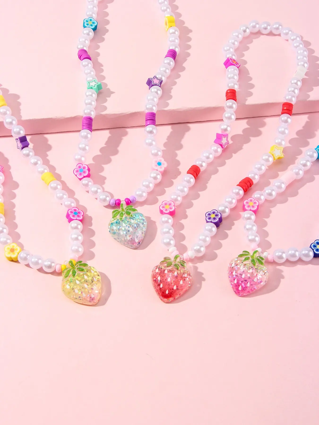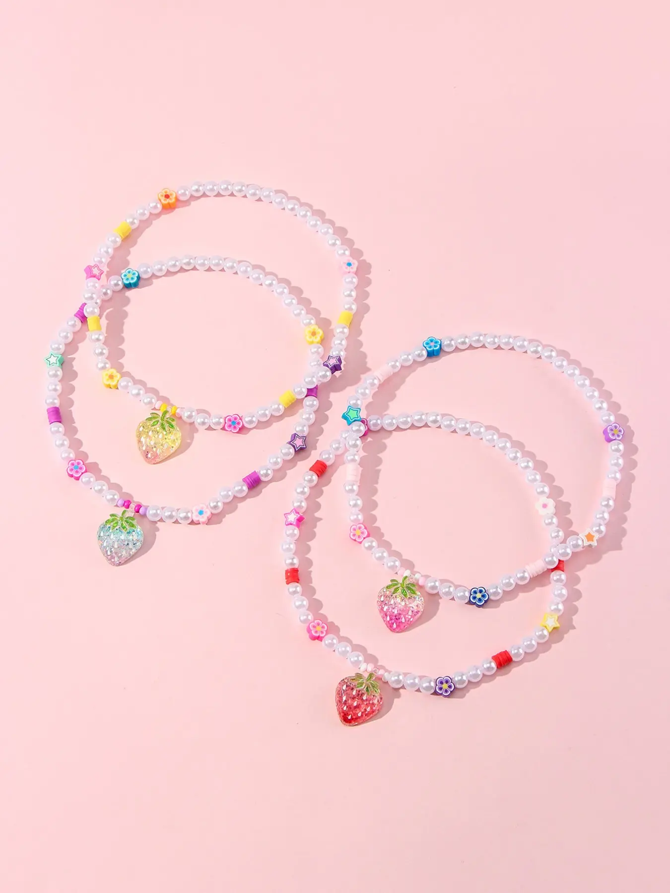5. 4pcs/set Acrylic Strawberry Pendant Bracelet Set, Cute Floral Design, Perfect for Girls' Birthday Parties, Casual Wear, All Seasons