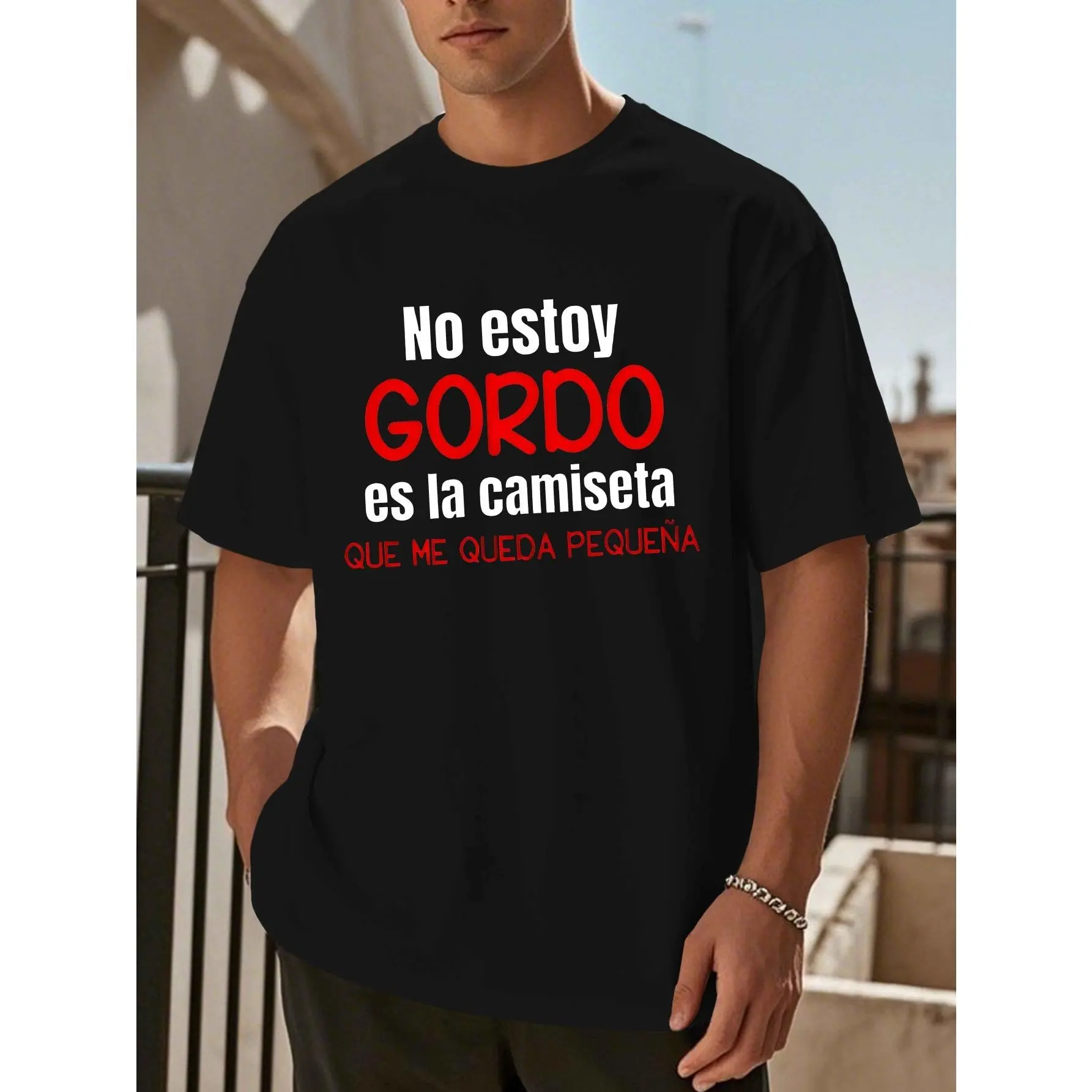 This men’s T-shirt features the playful Spanish quote "No Ey Stay Gordo," paired with a geometric print. It blends fun personality with casual fashion, perfect for summer. The classic crew neck and regular fit offer a relaxed, comfortable experience. Ideal for daily outings, street walks, and casual meetups.