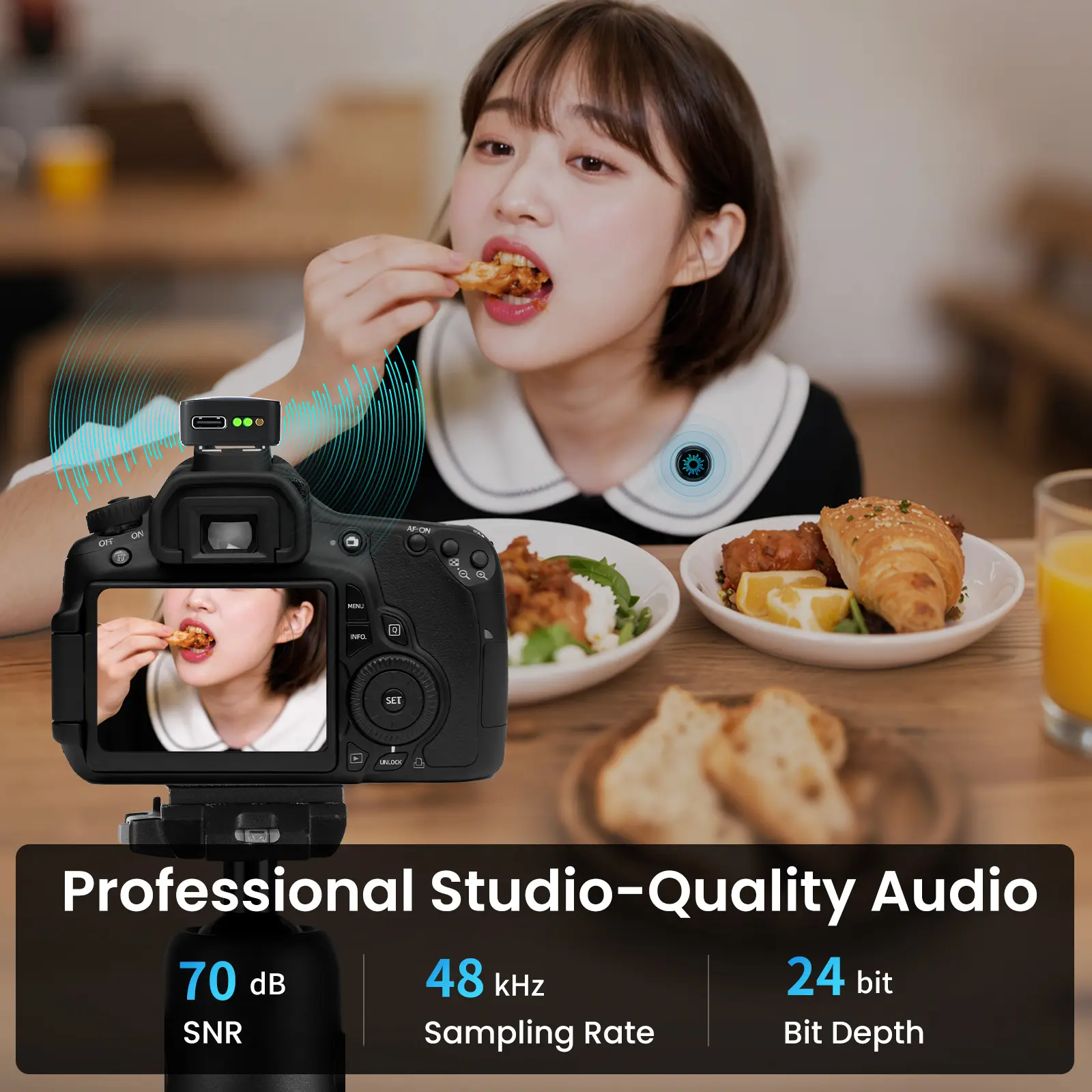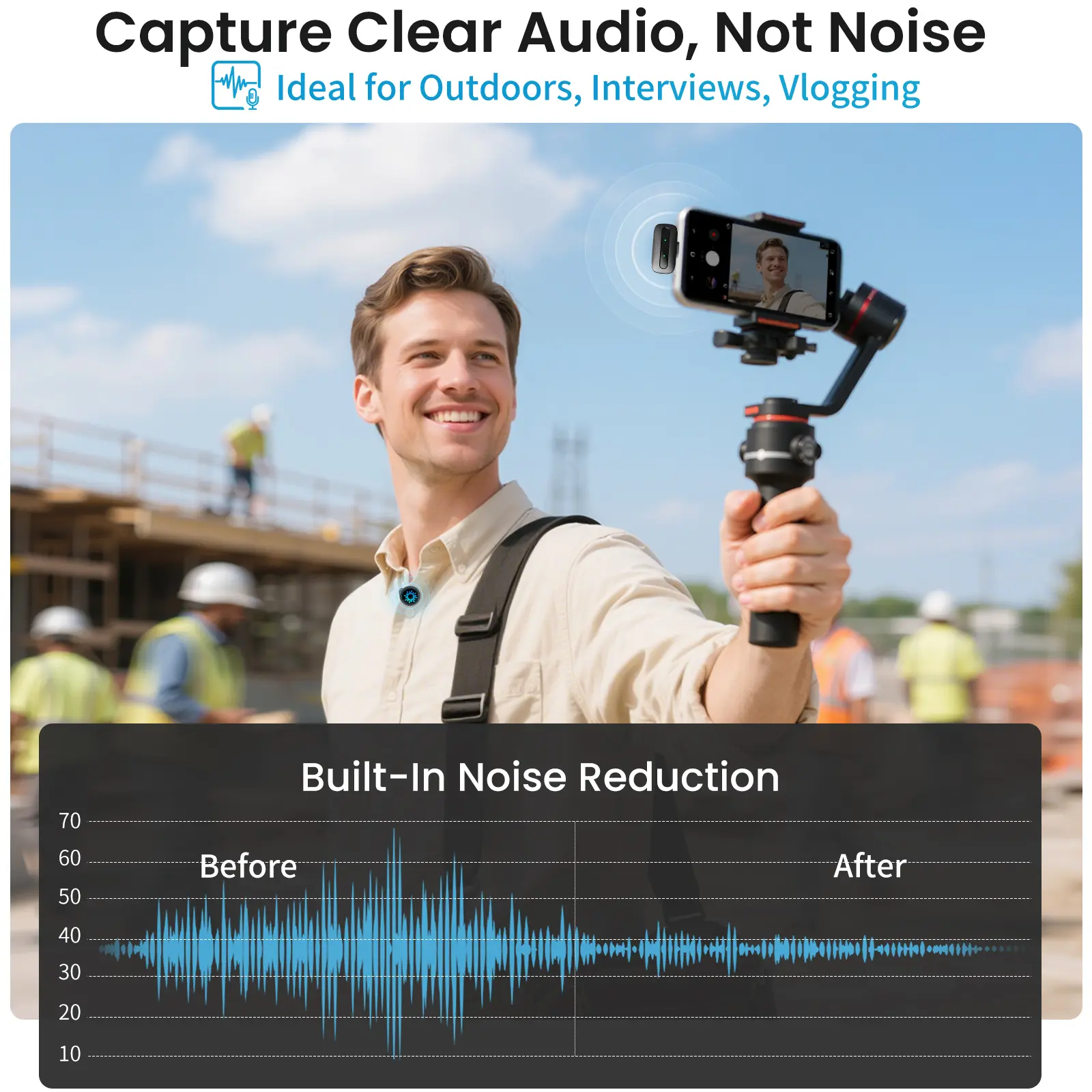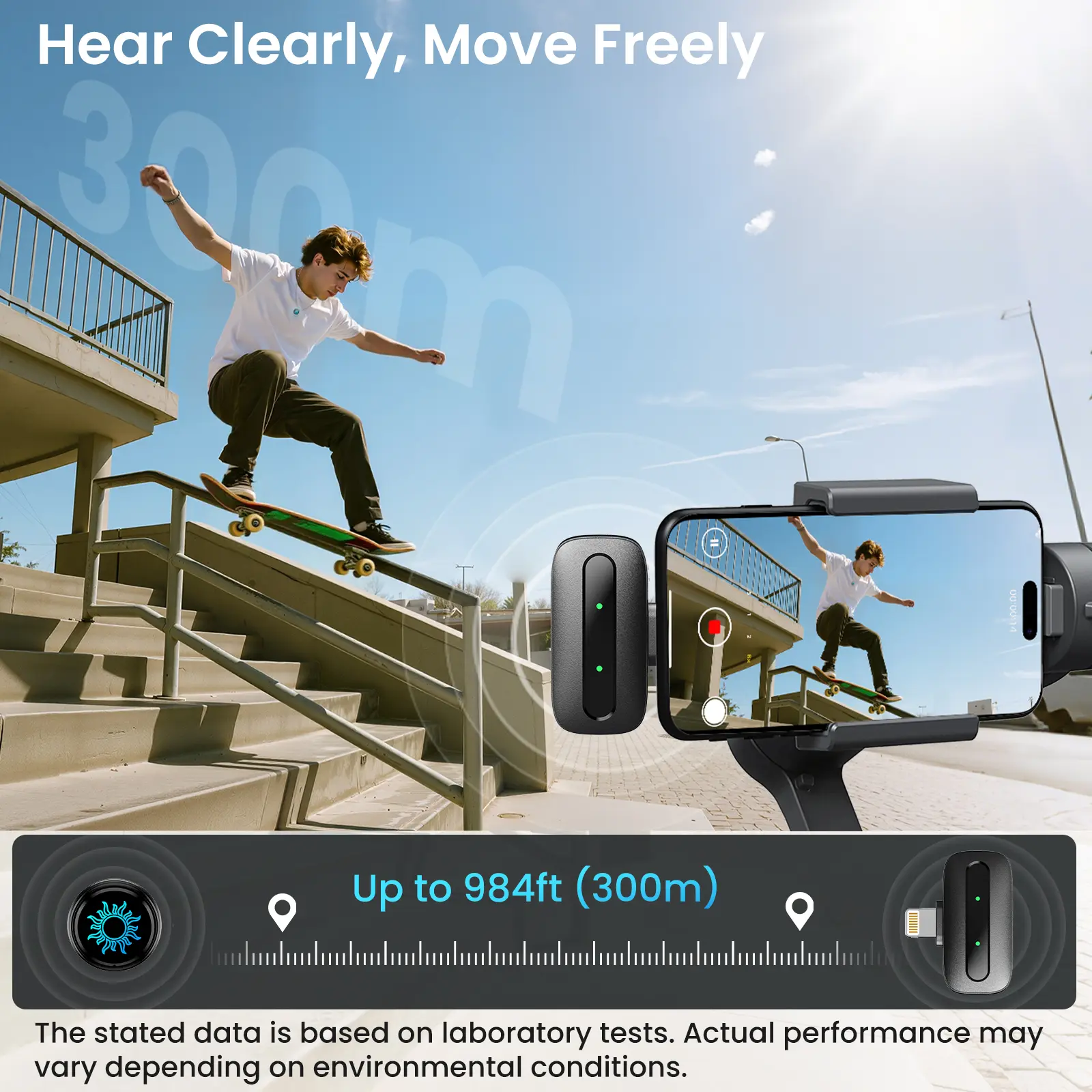 Maintain crystal-clear audio up to 984ft with stable 2.4GHz transmission. Record uninterrupted in open outdoor environments. The stable transmission ensures your audio remains clear and consistent, no matter the setting.