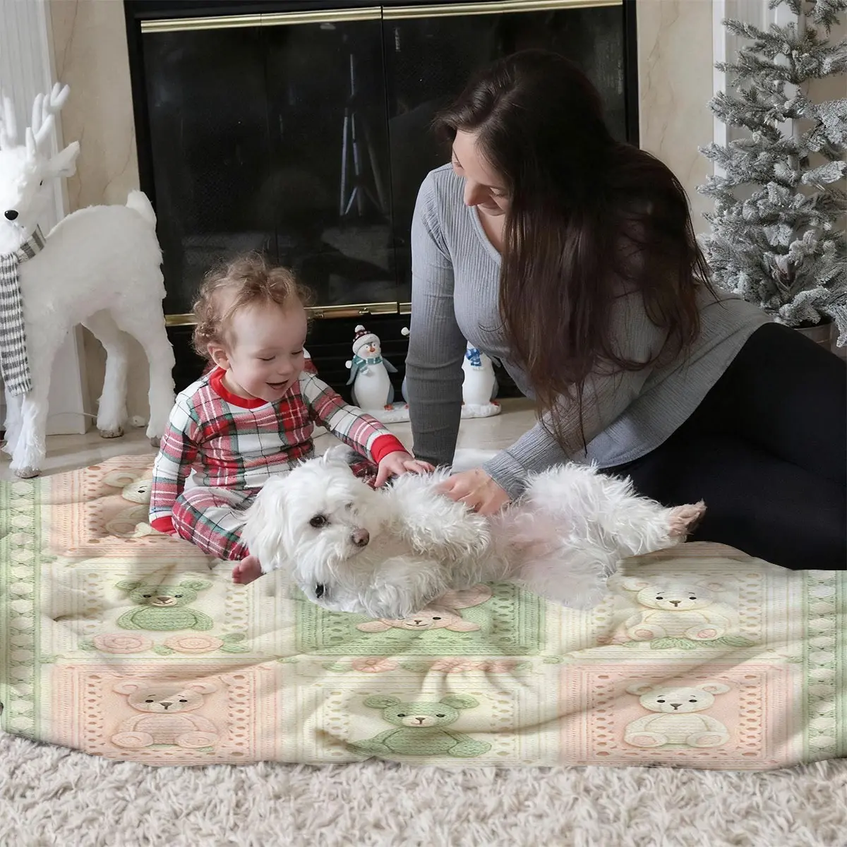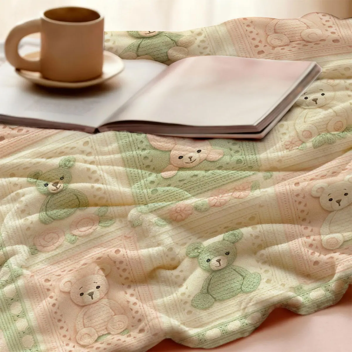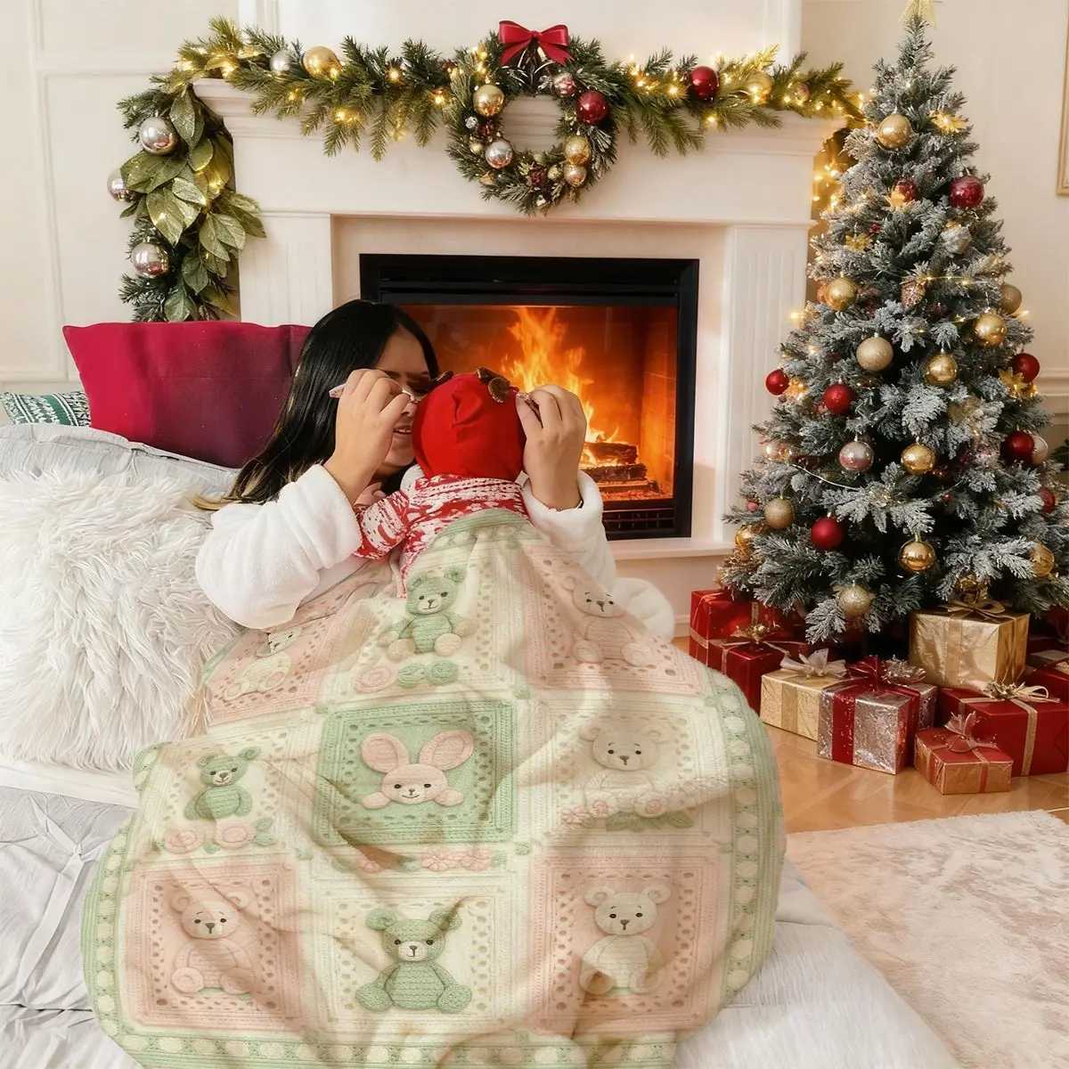1pc Grandma'S Square Magritte Crochet Print Flannel Blanket | Soft and Comfortable Throw with Teddy Bear and Floral Design, Lightweight All-Season Blanket for Sofa, Bed, Travel, Office, Home Decor