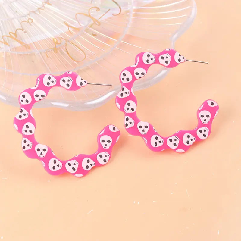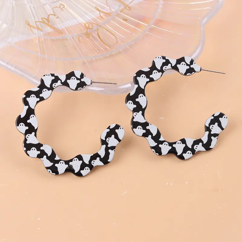 This C-shaped earring features a wavy lace design, printed with pumpkin, skull, ghost, and other fun elements, with bright and rich colors