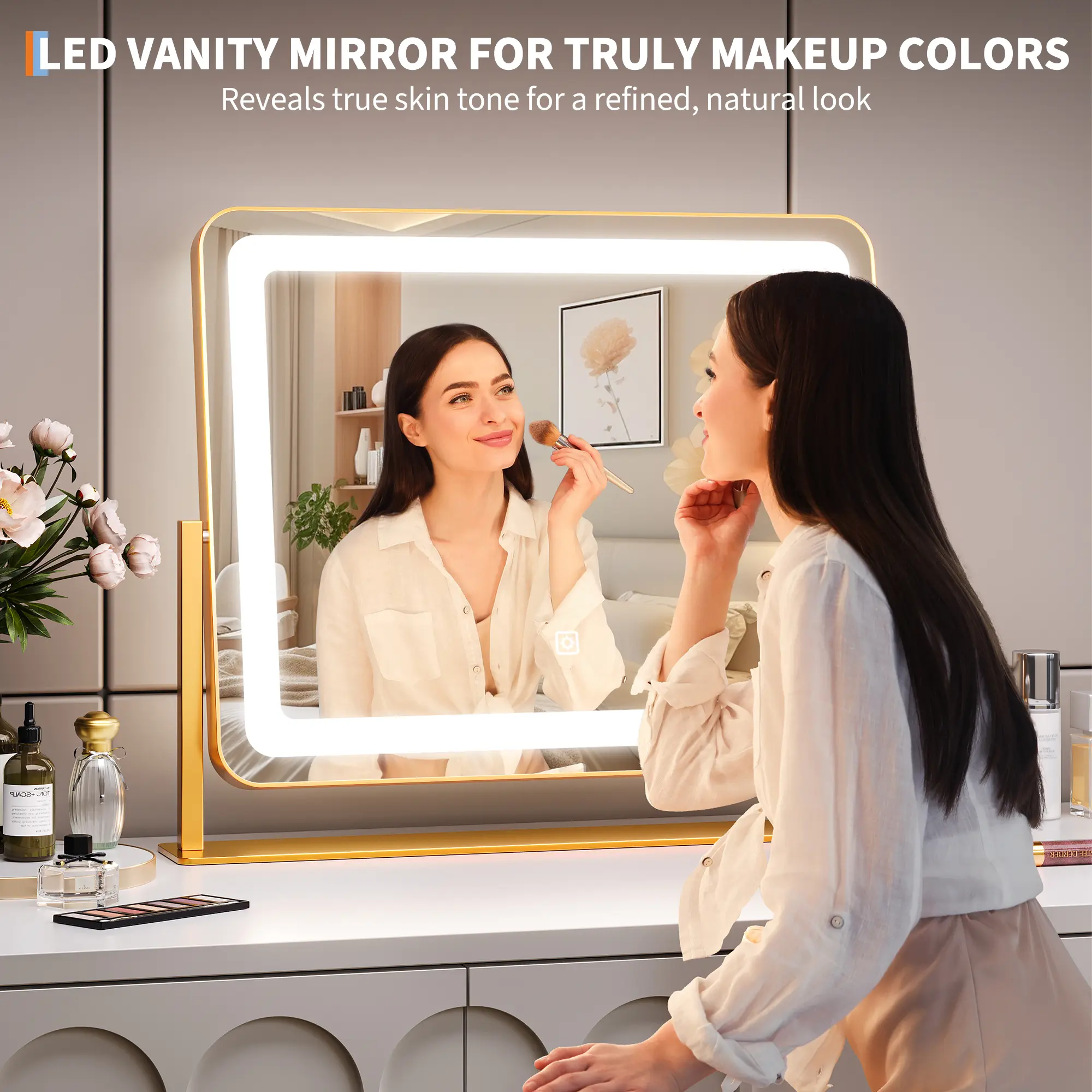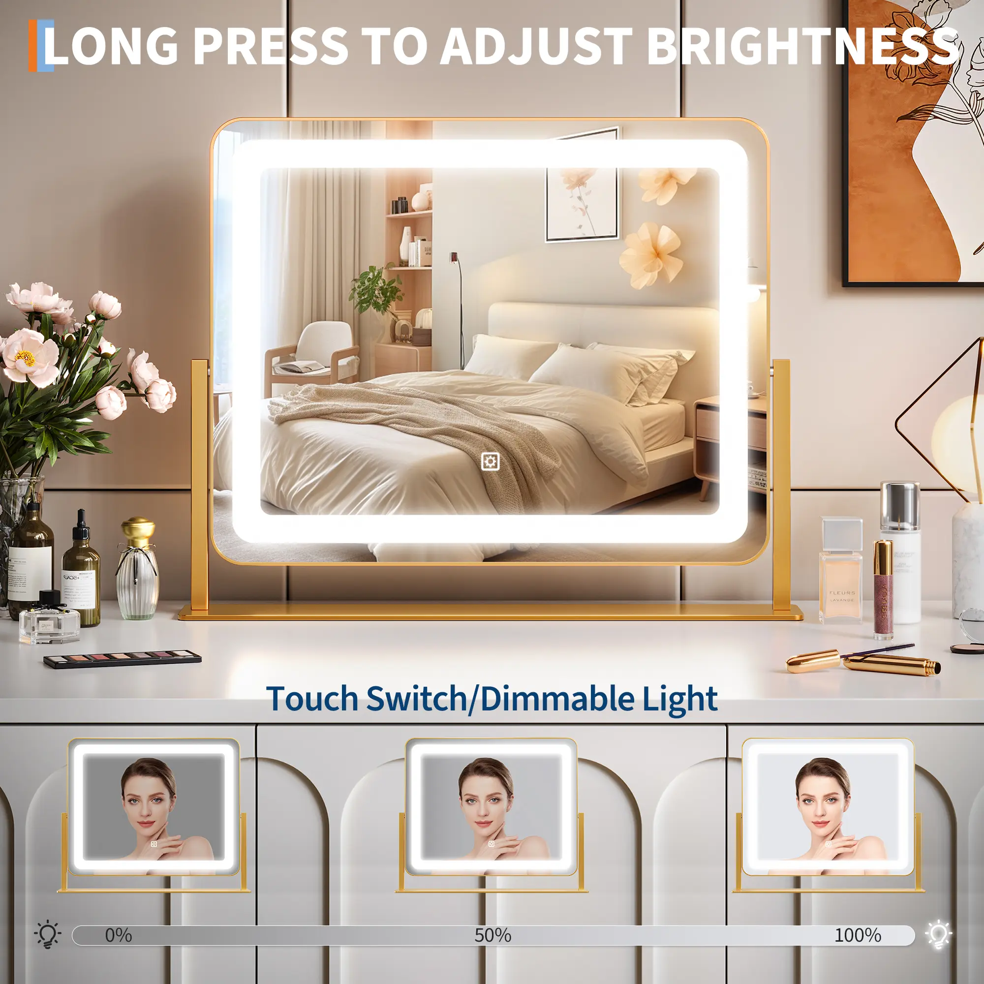 ·【Smart Touch Control】Featuring intuitive smart touch controls, this LED mirror makes adjusting settings easy. Simply touch to power on/off, change lighting modes, or adjust brightness to your liking. Enhance your beauty routine with a mirror for desk that integrates cutting-edge technology for an effortless and personalized experience.