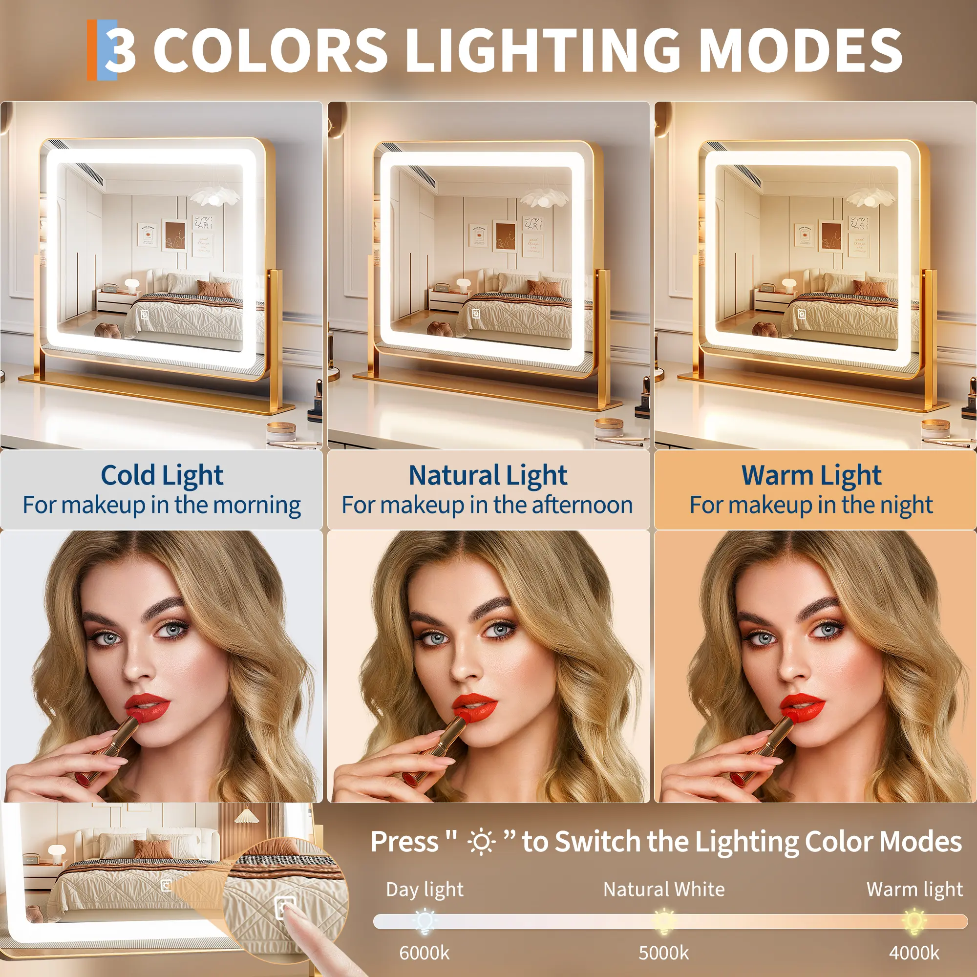 ·【Adjustable Lighting】Customize your experience with this vanity mirror with lights that offers adjustable brightness and three color modes. Effortlessly switch between cool, warm, and natural light settings to suit any occasion, ensuring flawless makeup application every time. Ideal for those who want precision and versatility in a makeup mirror with lights.