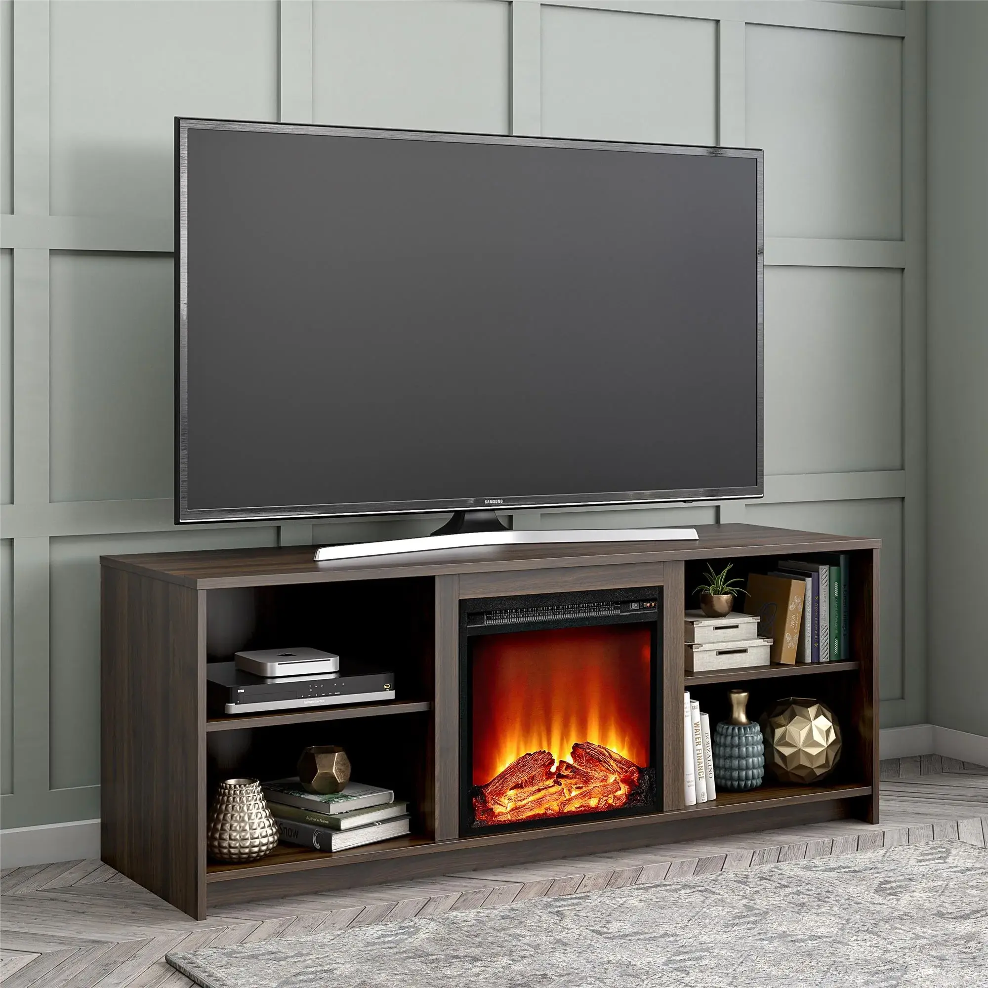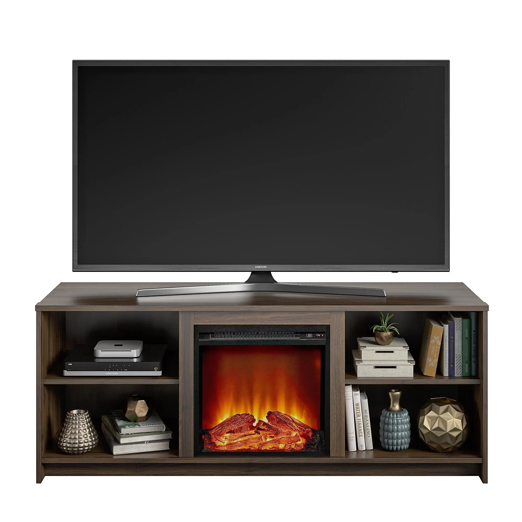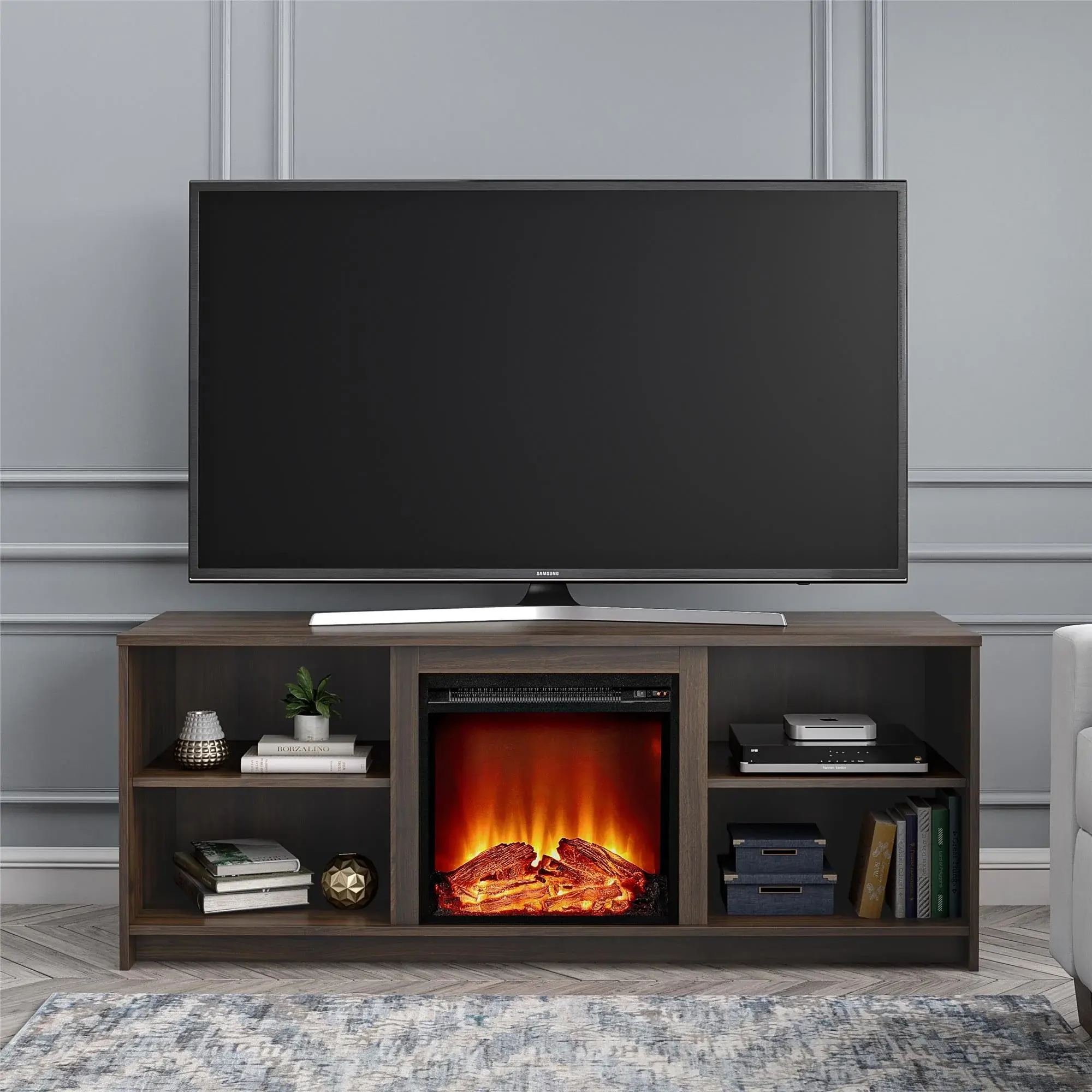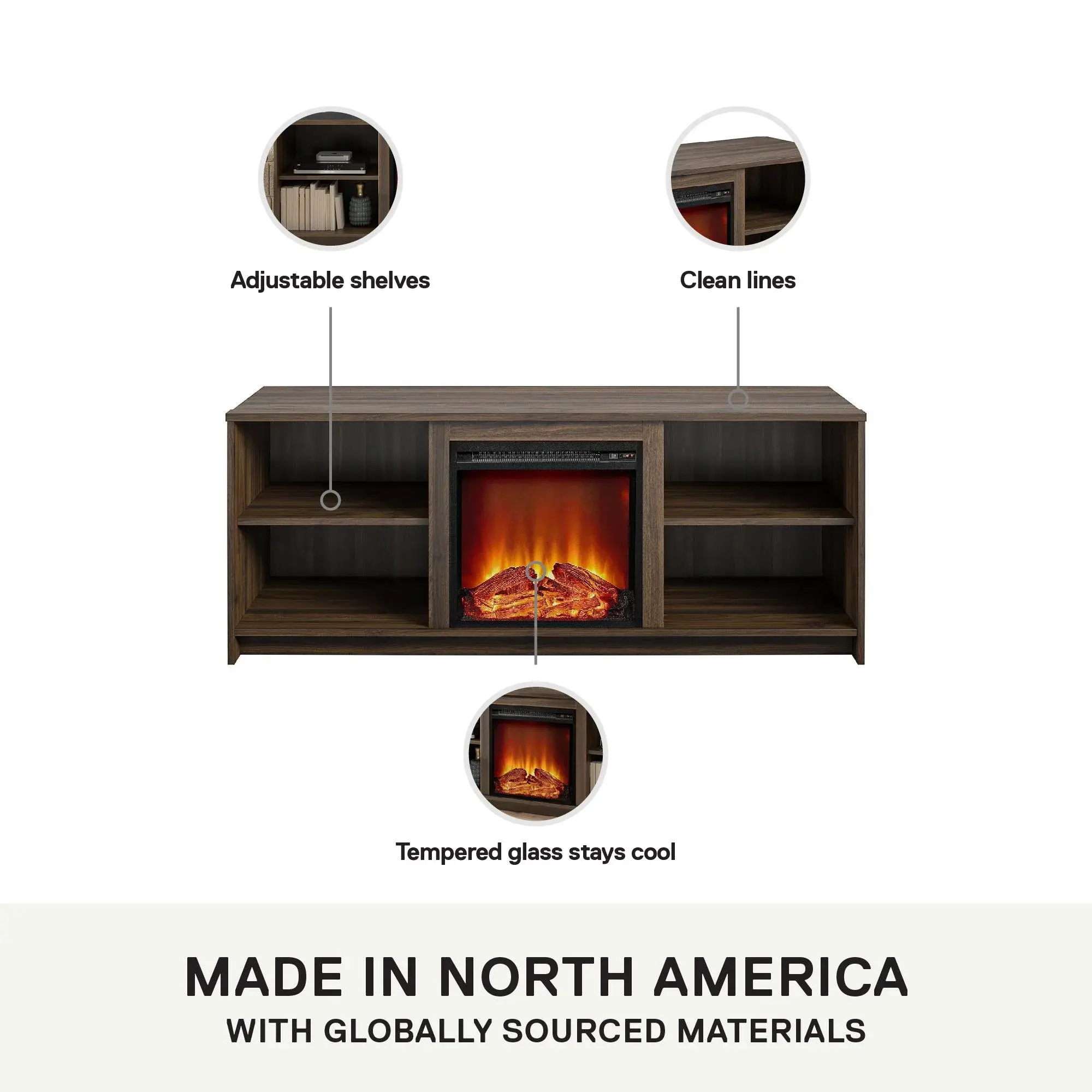 Get the warm and relaxing ambiance of a crackling fireplace minus the maintenance with the PYLADIES Courtland Electric Fireplace TV Stand. This TV stand with fireplace can accommodate most TVs up to 65" wide or up to 120 lbs. The neutral finish on the laminated engineered wood will coordinate seamlessly with your existing decor. The 18" electric fireplace heater insert can heat a room up to 400 sq. ft. and plugs into a standard 120V outlet. The flame effect can be used with or without heat so you can enjoy the fireplace all year long. A cool-touch tempered glass front guarantees safety for both children and pets. On each side of the fireplace insert are two shelves, one adjustable so you can organize your media components and video game consoles. The wire management makes it easy to plug in your devices and keeps cords tangle-free. The TV Stand ships flat to your door in one box and requires assembly by two adults upon opening. Parts are conveniently labeled for easy assembly. Assembled dimensions: 59.69" W x 19.69" D x 23.43" H.
