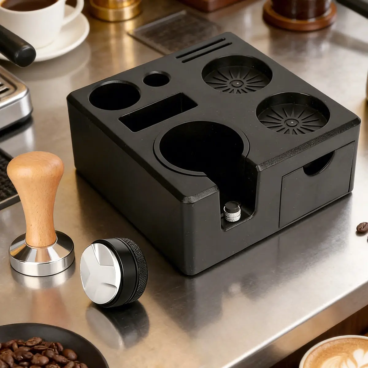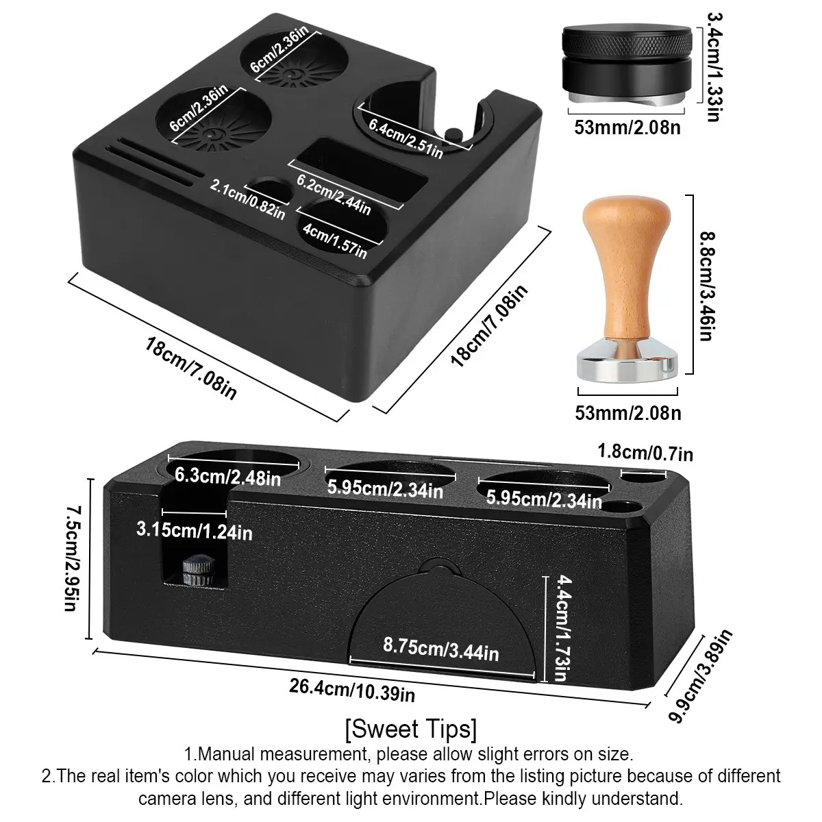 【 High Quality Material 】Our espresso tamper station is made of ABS material , ensuring durability, water resistance, and easy to clean. Non-slip pads are installed at the bottom to enhance friction, making compaction operations more stable and effortless. Compared to wooden tamping station, it can withstand long-term use and frequent cleaning while maintaining excellent performance over extended periods.