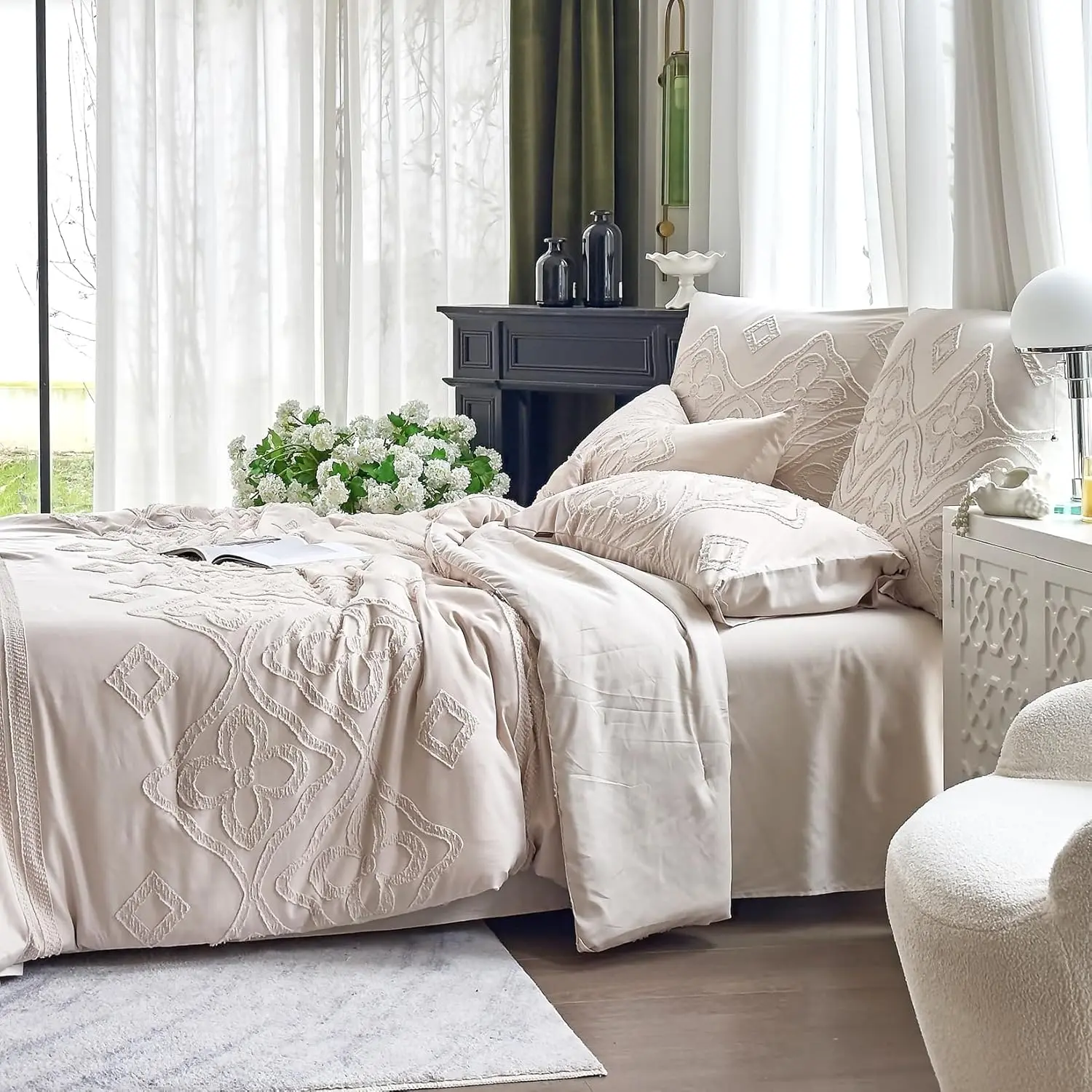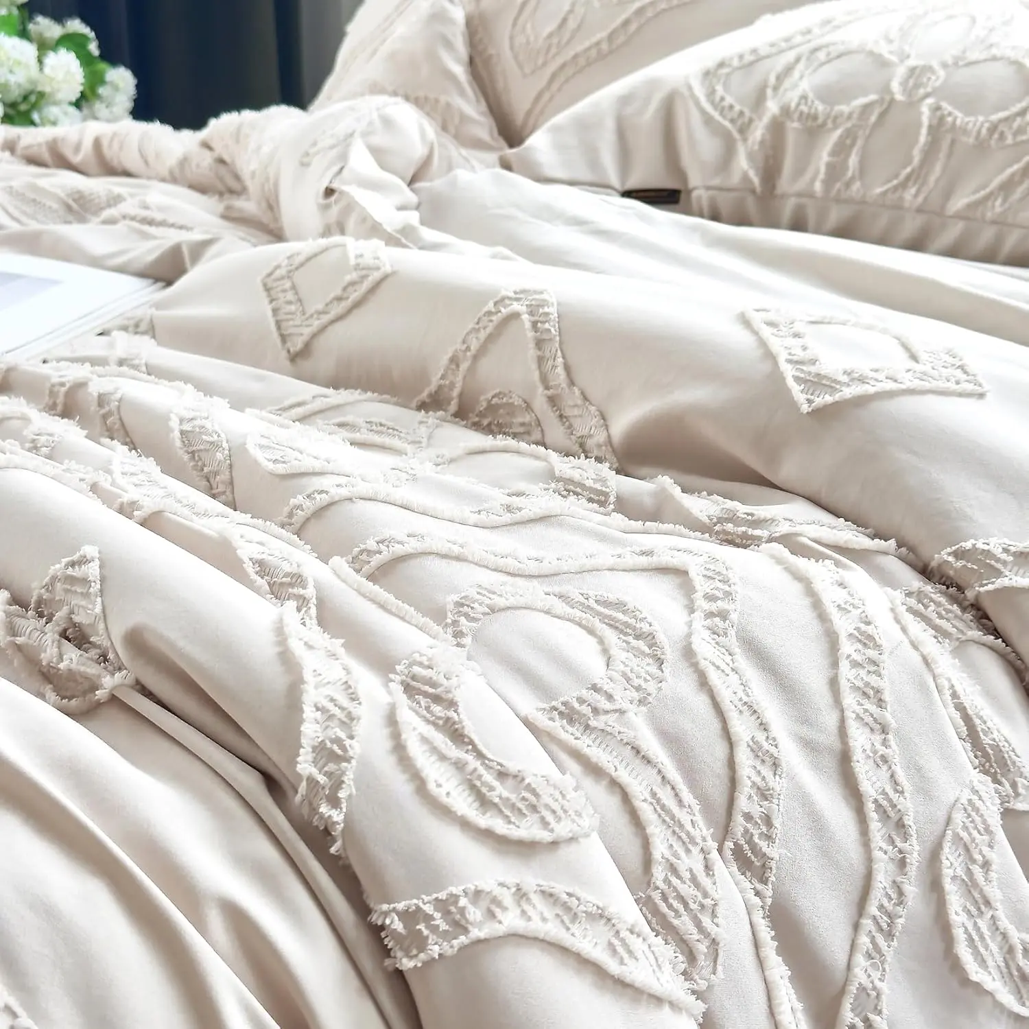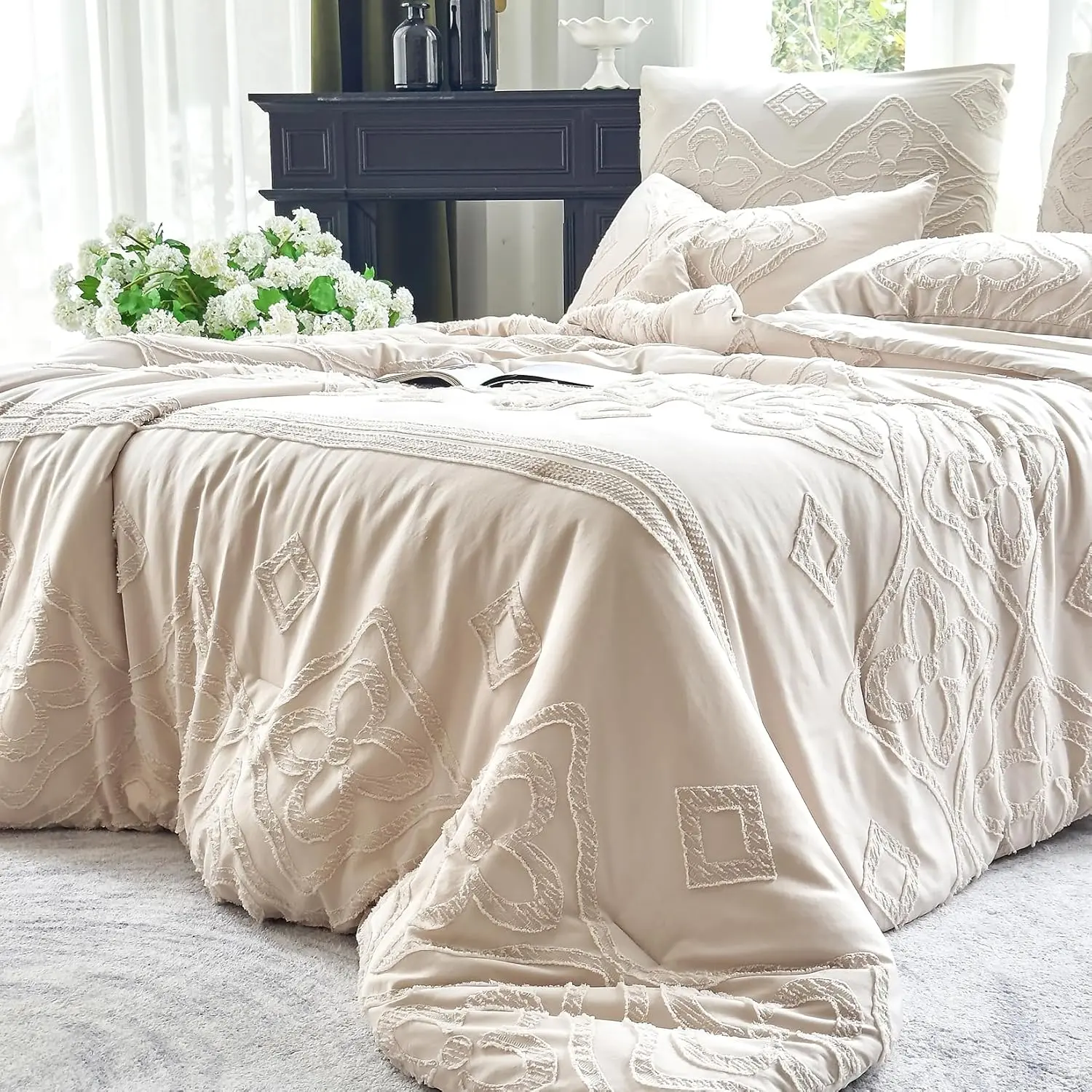 [Boho Textured Design] Elevate your bedroom with elegant tufted quatrefoil patterns on one side and brushed microfiber on the reverse.This lightweight comforter set blends bohemian flair with farmhouse charm, serving as standalone decor without a duvet cover.[All Seasons Cloud-Like Comfort]Filled with 220gsm 3D down alternative fiber, our lightweight king comforter balances warmth and airflow for year-round use.Hypoallergenic and noiseless, hidden neat stitching prevents filling from shifting or clumping, keeping you cozy through summer and winter.[Ultra-Soft Microfiber & Breathable Fabric]Crafted from 100% skin-friendly brushed microfiber, this fluffy bedding set offers velvety softness and breathability.The noise-free texture ensures a restful night’s sleep, ideal for sensitive skin and light sleepers.[Complete King Size Set & Easy Setup]Includes 1 beige comforter (104"x90") and 2 pillowcases (20"x36").Vacuum-sealed for shippingsimply wash and tumble dry low, or sun-dry and tap gently to re-fluff before first use.The neutral beige hue complements minimalist, vintage, or cottage decor.[Durable & Easy Care]Machine washable in cold water on gentle cycletumble dry low or sun-dry.Do not bleach, iron, or dry clean.This boho comforter set maintains softness and color vibrancy wash after wash, perfect for guest rooms or master bedrooms.