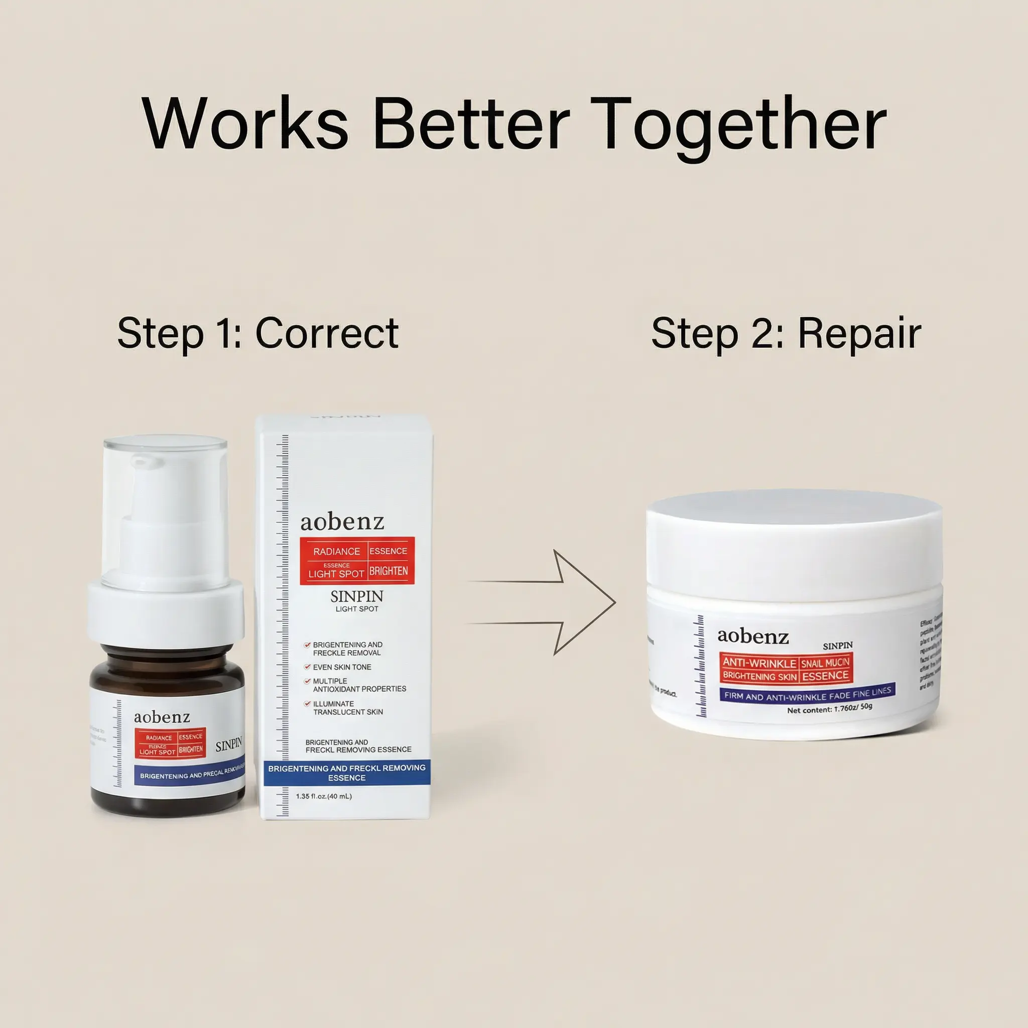 Use the serum to correct uneven tone, then follow with the cream to repair and seal in hydration. A simple routine designed for visible results.