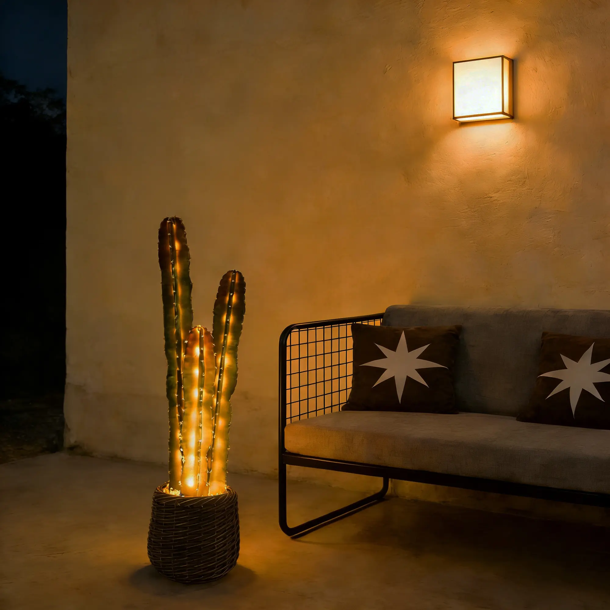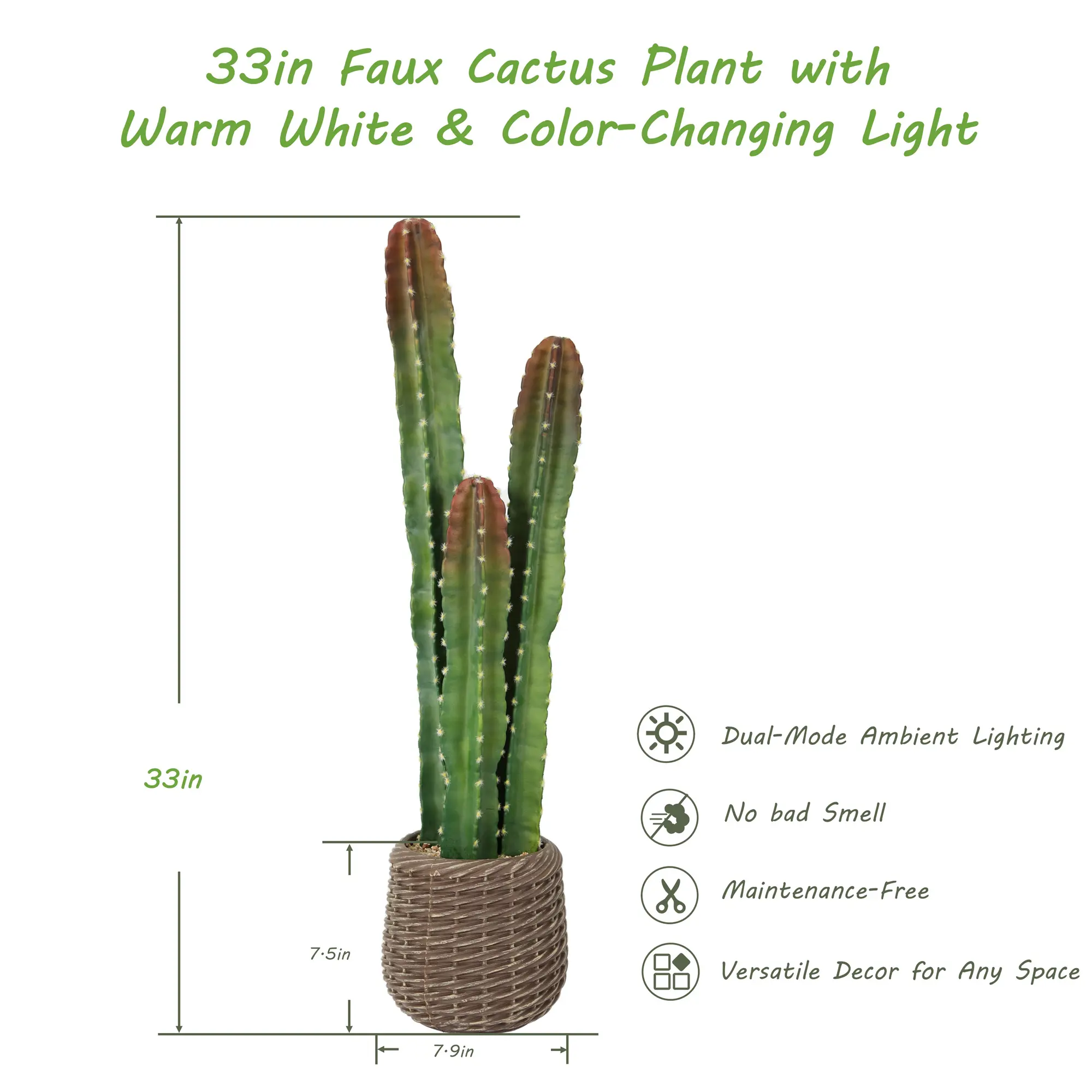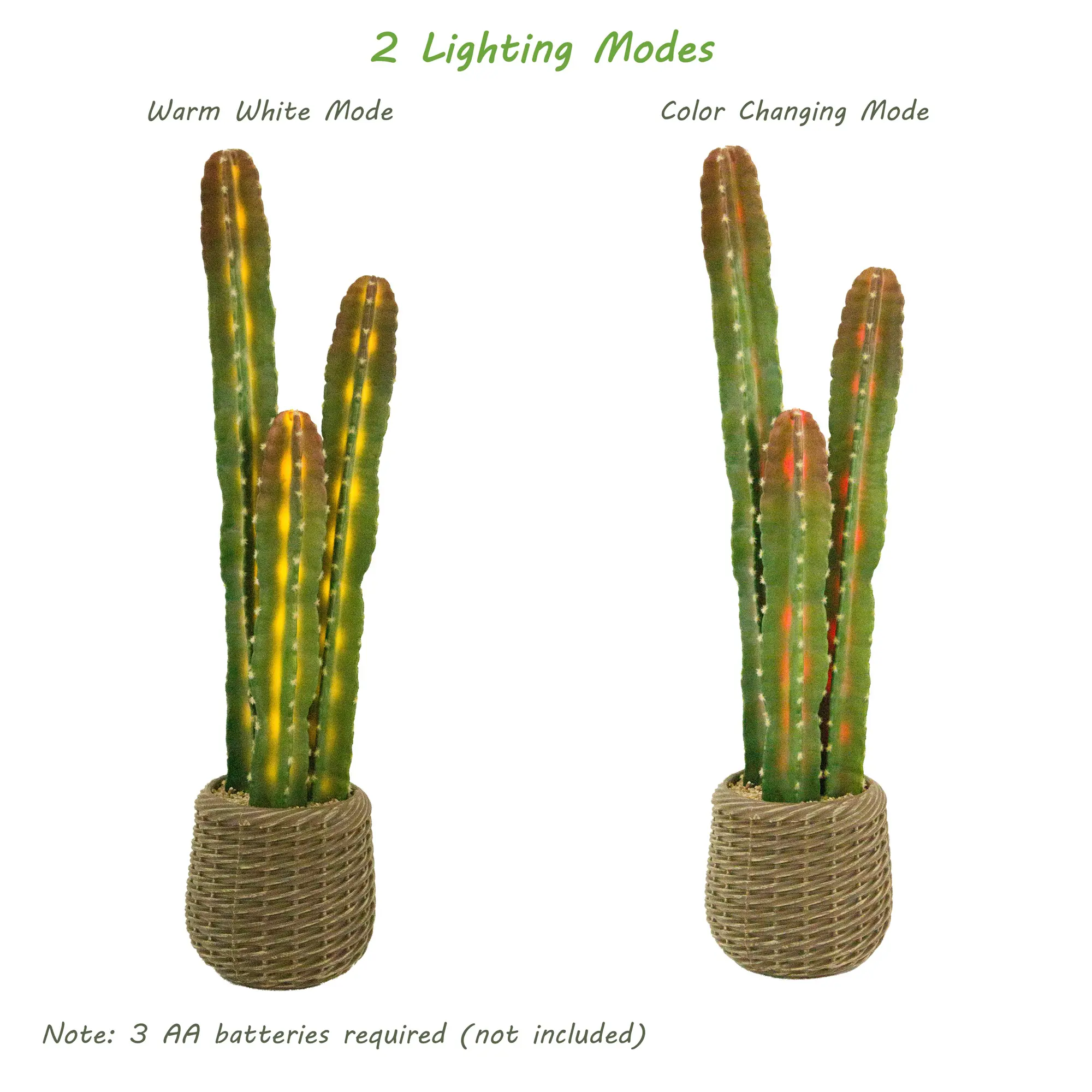 Switch between warm white glow for soft, relaxing mood lighting or color-changing mode to add a playful, dynamic touch. The built-in LED lights are seamlessly integrated into the cactus stems, creating a dreamy boho-inspired atmosphere for bedrooms, patios, or living spaces. (Note: Requires 3 AA batteries, not included)