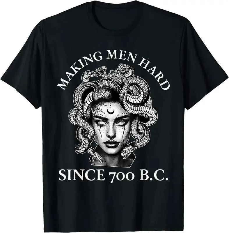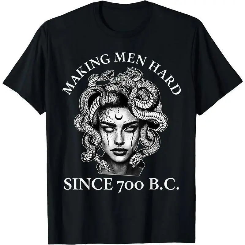 This tee features the hilarious slogan "Making Men Hard Since 700 B.C" paired with a vintage Medusa graphic, blending ancient Greek mythology with witty feminist vibes.The novelty and eye-catching design shows off unique personality, perfect for people who love funny statement tees and mythological themes.