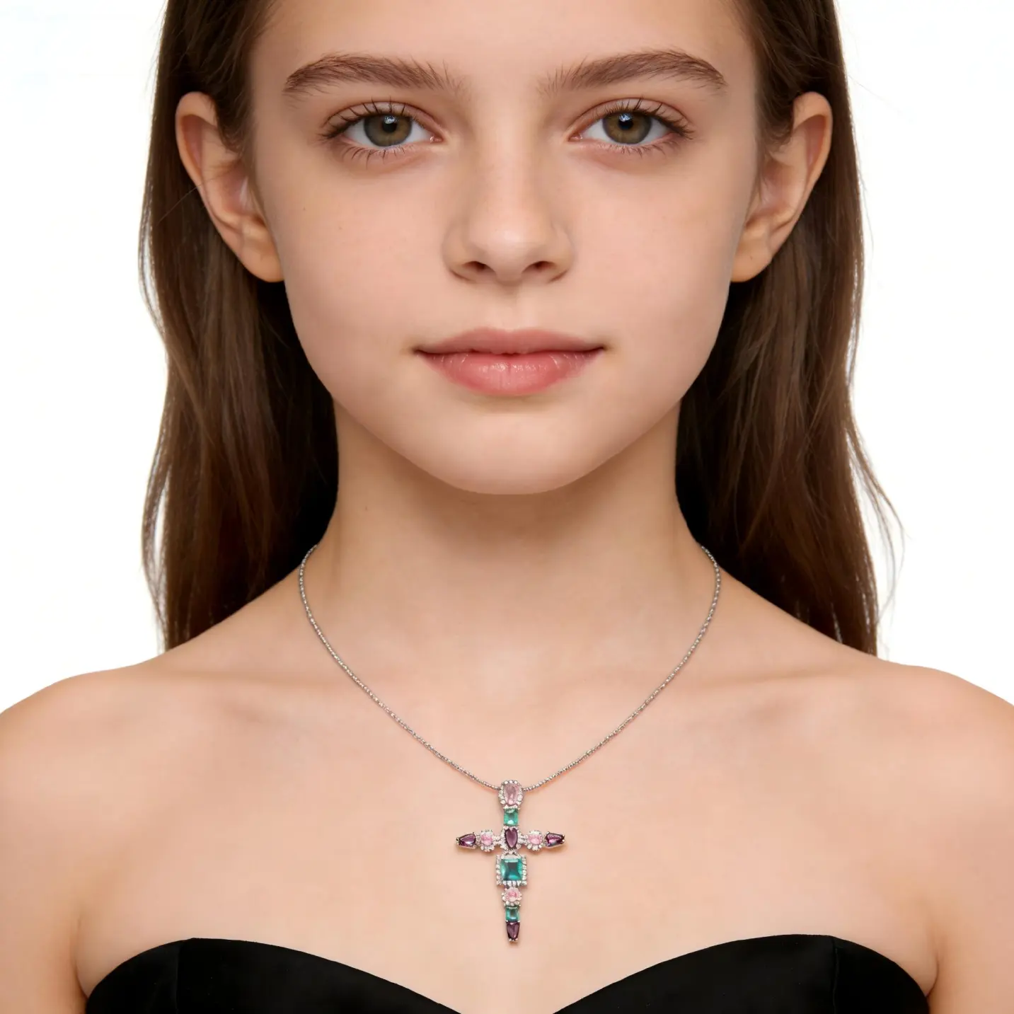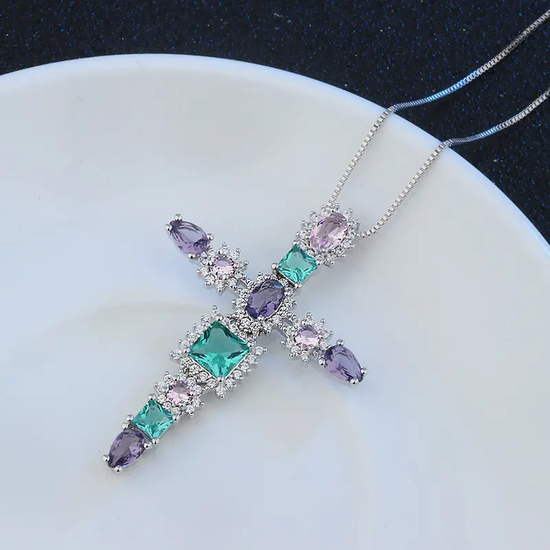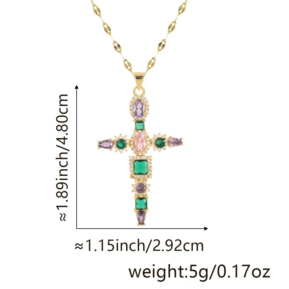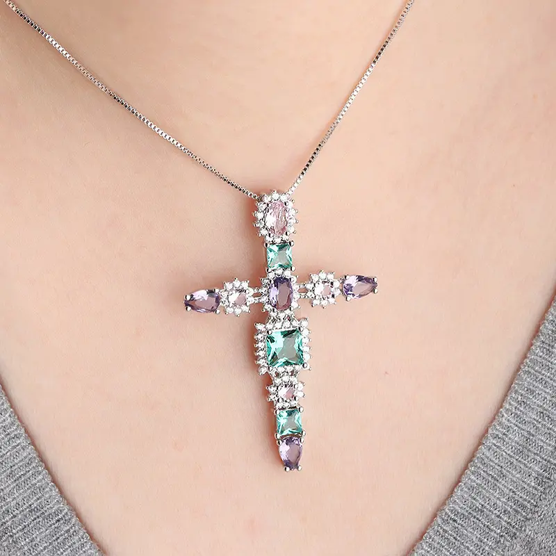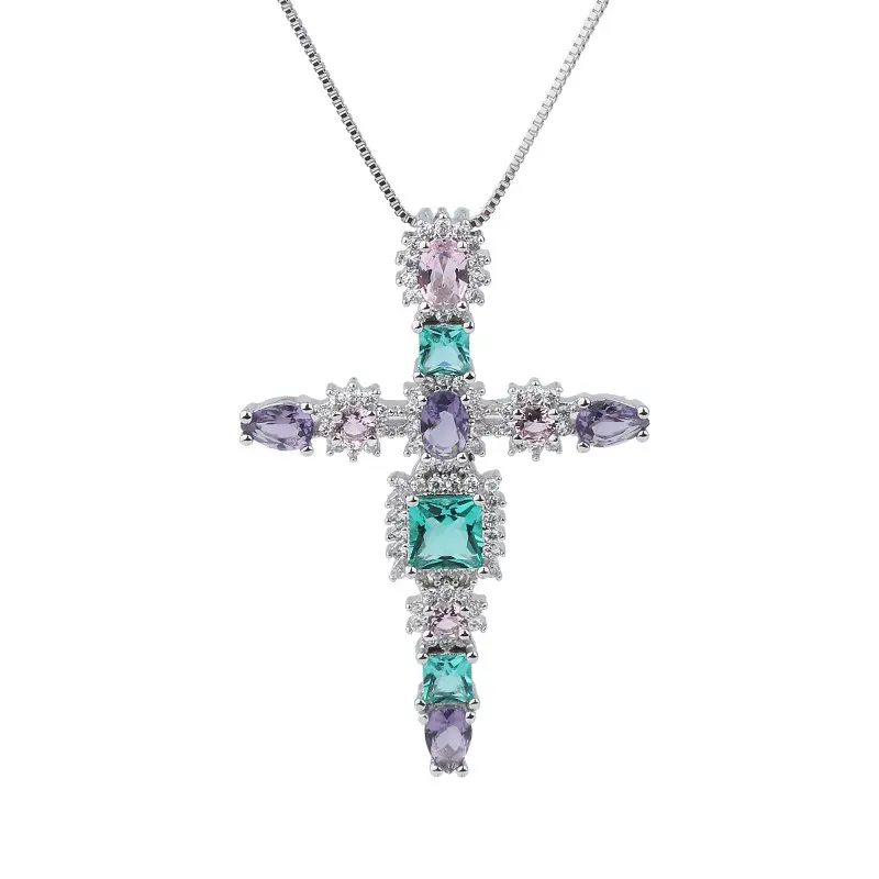 Colorful Cubic Zirconia Crystal Elegant Big Cross Pendant Necklace for Women Fashion Jewelry Accessories