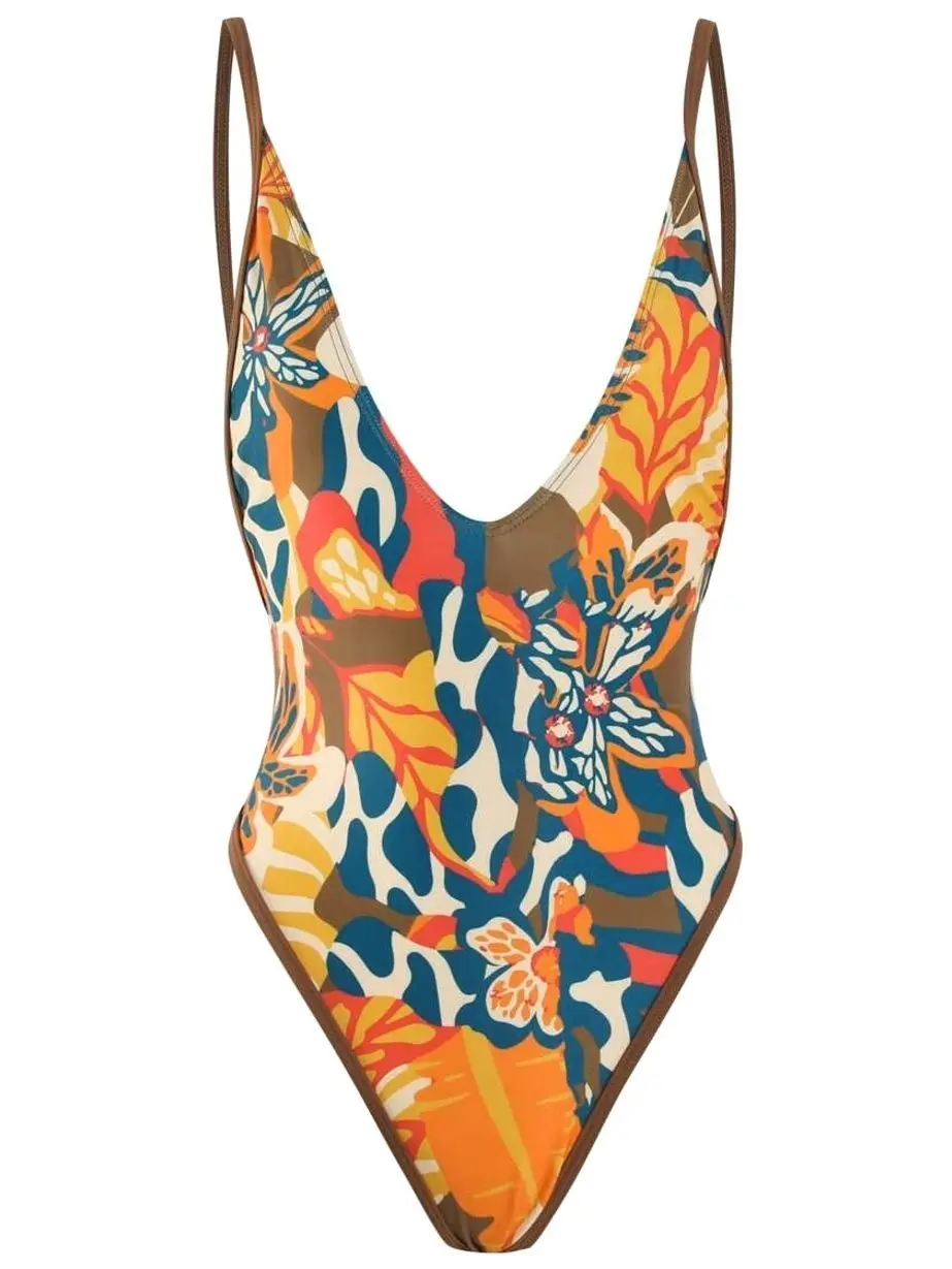 Swim SXY Women's Deep V-Neck Backless Bowknot Tie Floral Printed Sexy One-Piece Swimsuit, Summer Beach