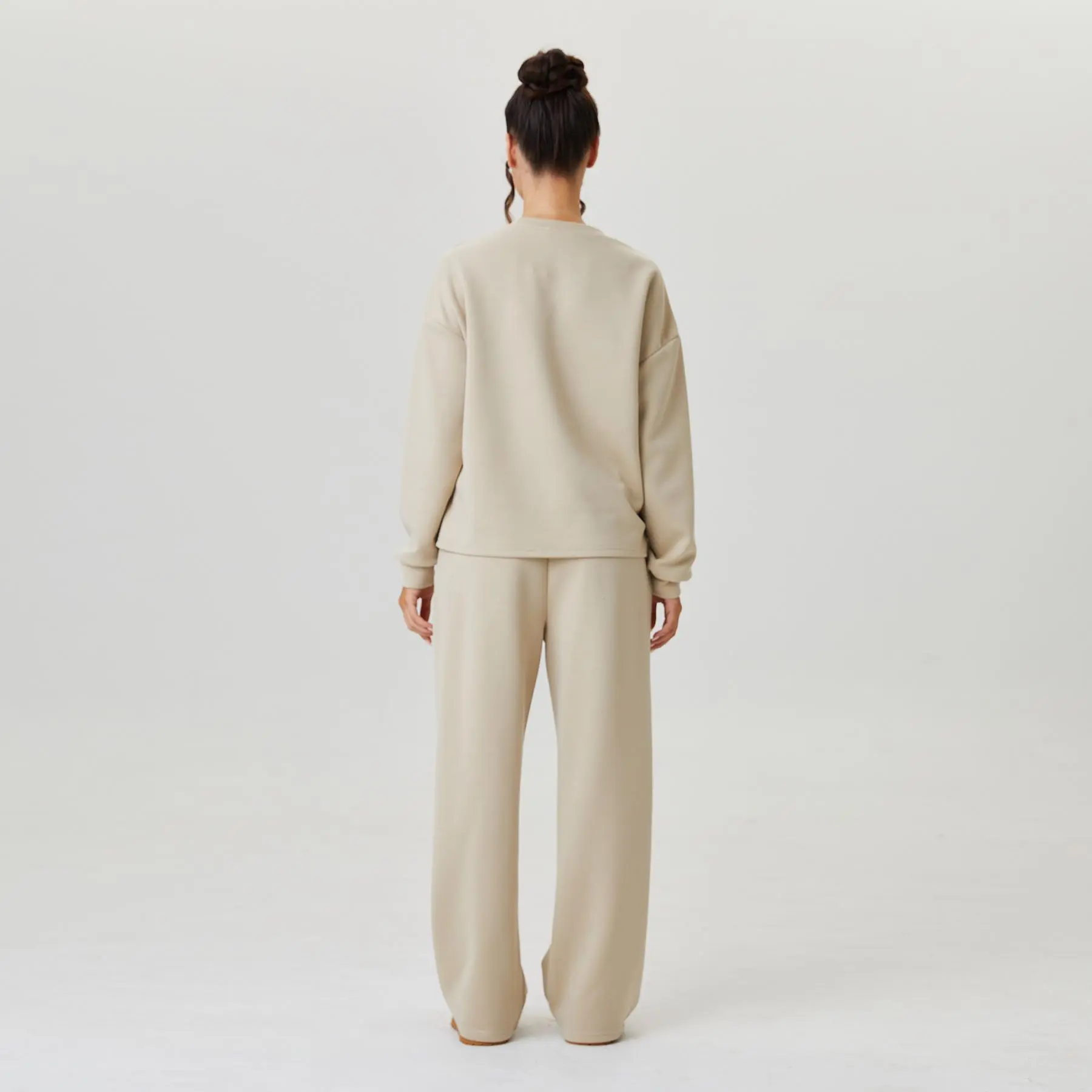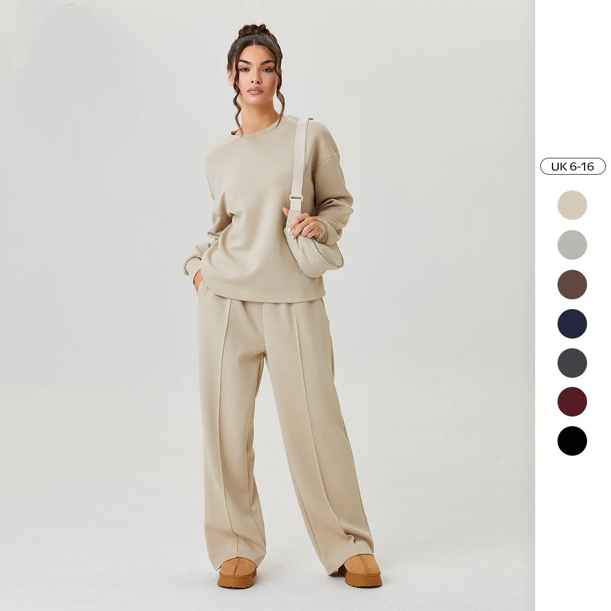 Women's Casual Solid Color Loose Long Sleeve Top & Exposed Stitches Trousers Co-ord