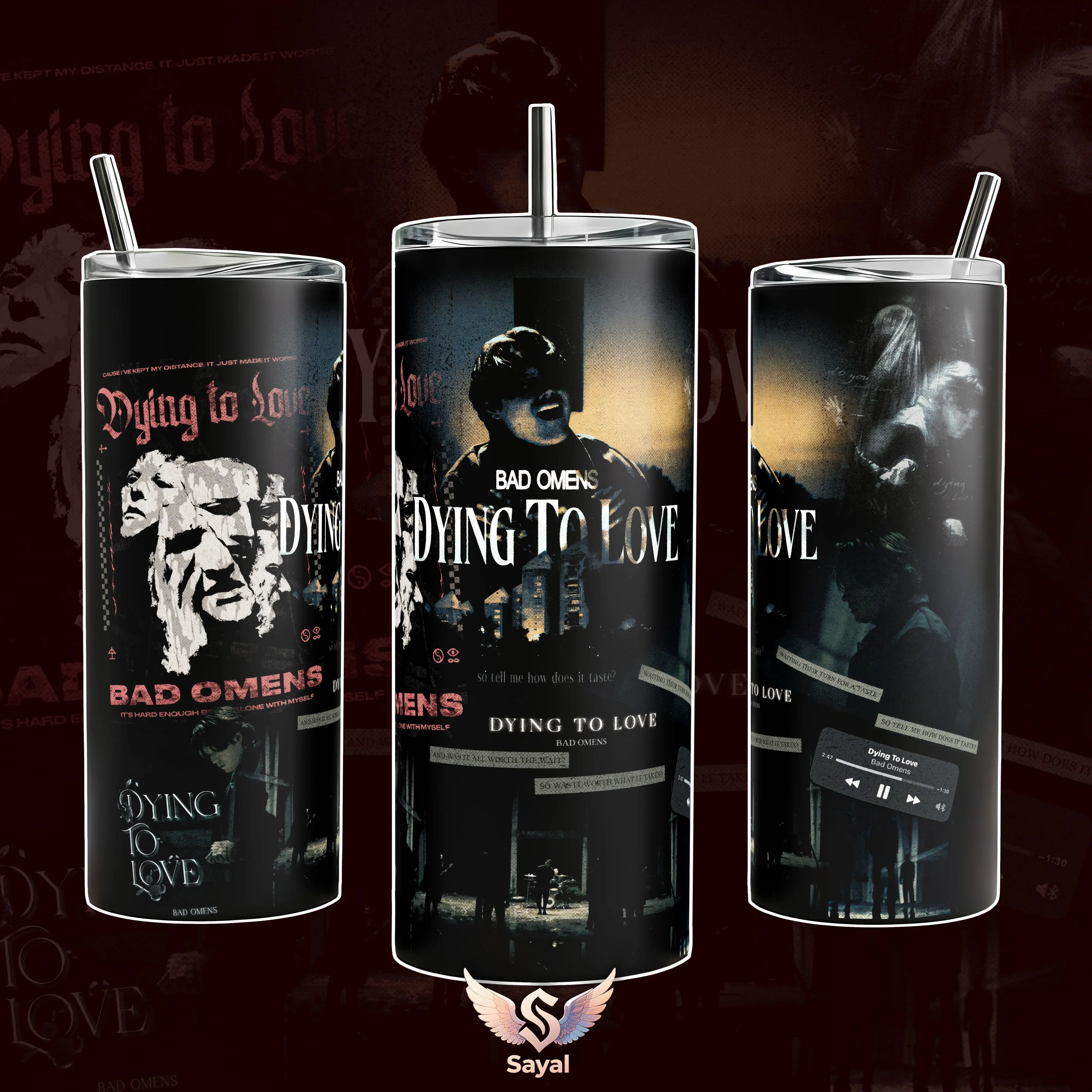 Dying To Love Bad Omens 40 oz Vacuum Insulated Tumbler with Handle & Straw Dark Blue Yellow Band Photo Graphic Keeps Drinks Hot/Cold 12H+ 18/8 Stainless Steel Travel Mug for Metal Fans Alternative Music Lovers Dark Aesthetic Merch Gift