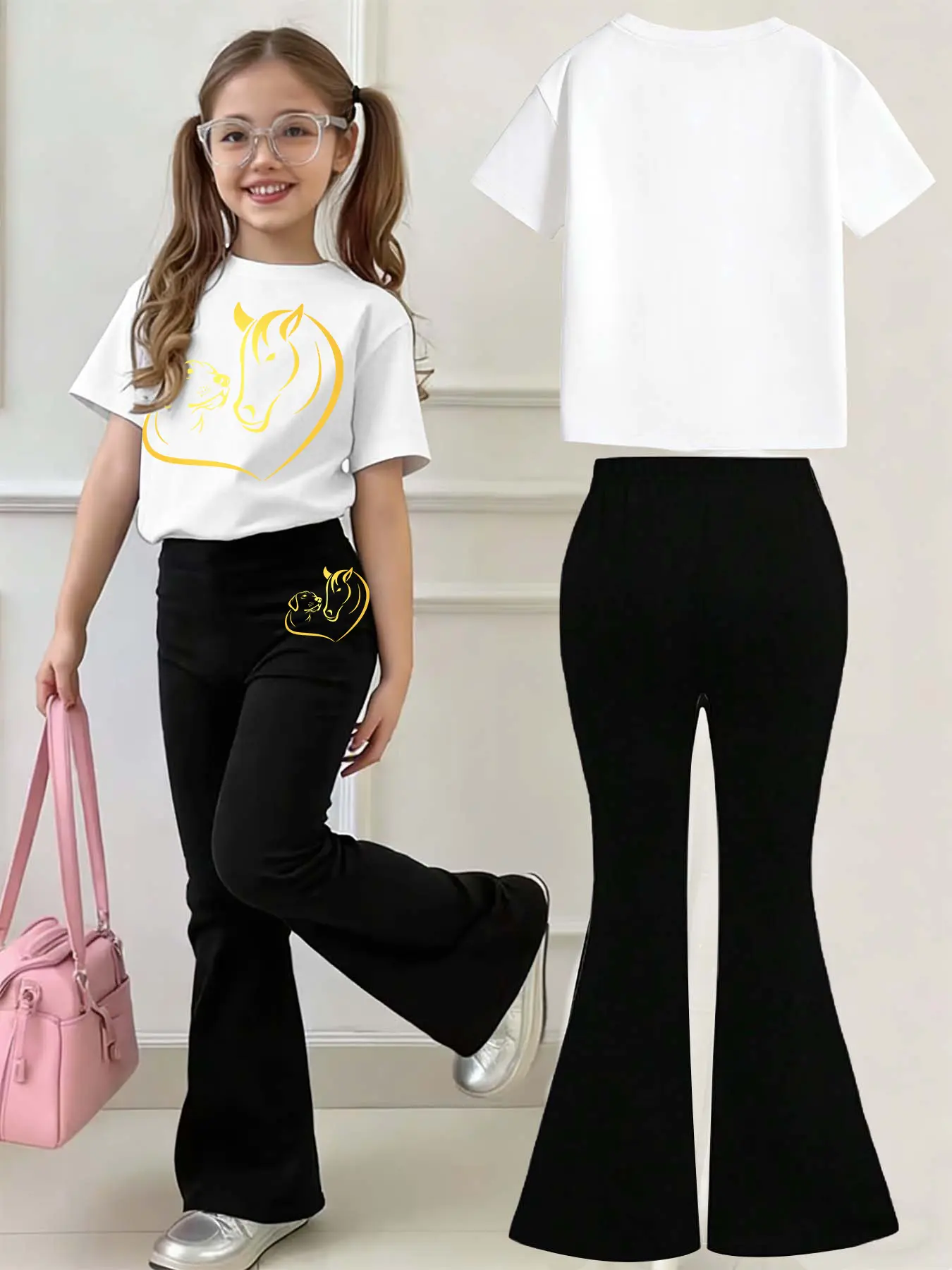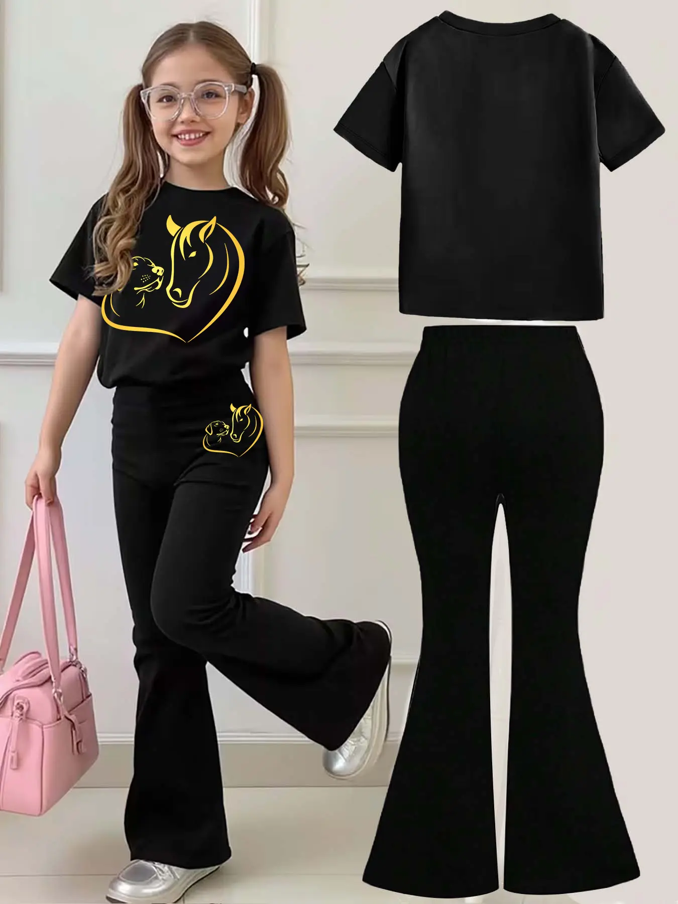 Kids' Casual Set, Horse & Dog Heart Animal Print, Multiple Colors, Machine Washable, Spring & Summer Top, Soft Skin-Friendly Fabric, Daily Wear, Fashion Design