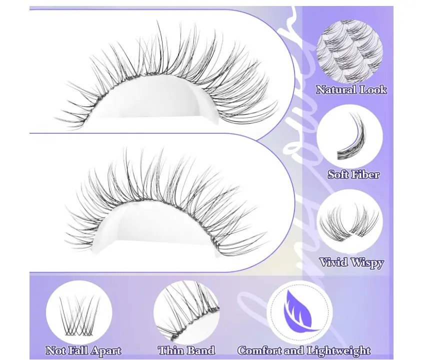 ·Soft & Lightweight Fiber: Made from premium wispy fiber, these thin band cluster eyelash extensions are incredibly soft and lightweight, making natural eyelash clusters suit for every makeup style and occasion.