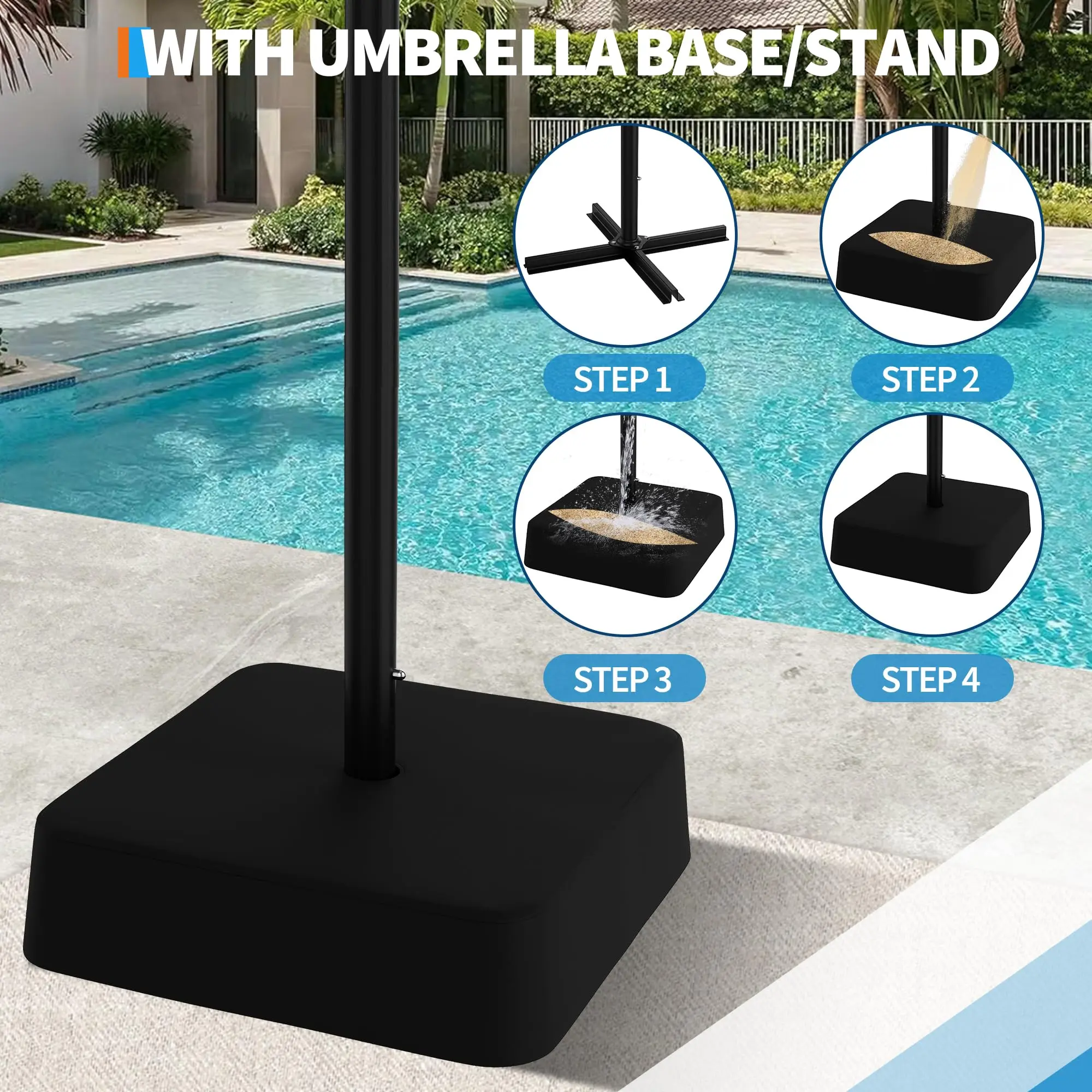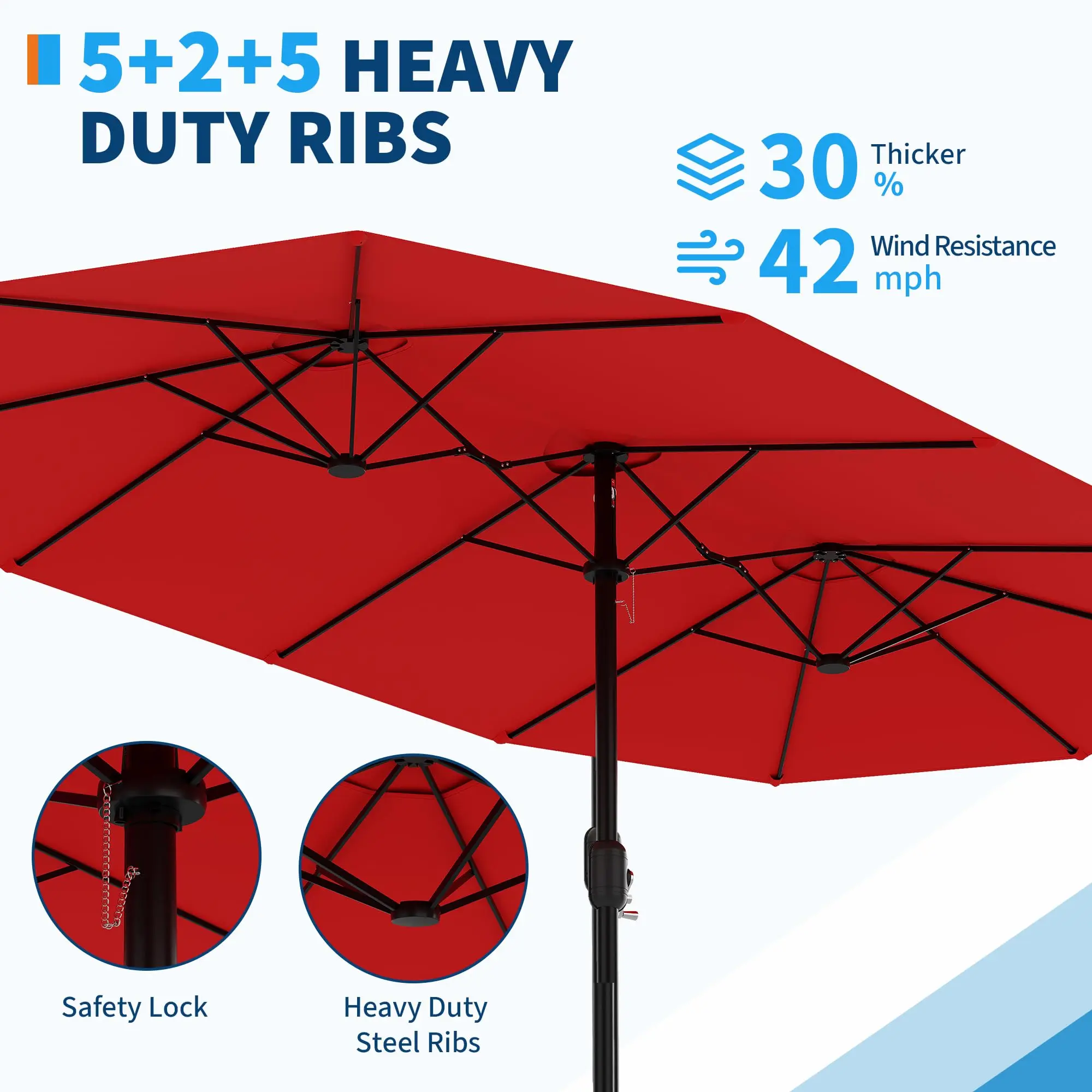 ·4.STURDY & DURABLE STRUCTURE - Constructed with 5+2+5 powder-coated steel ribs, the 15ft rectangular patio umbrella with base provides excellent support and rust resistance for outdoor use. A safety buckle at the frame top reinforces stability for large umbrellas
