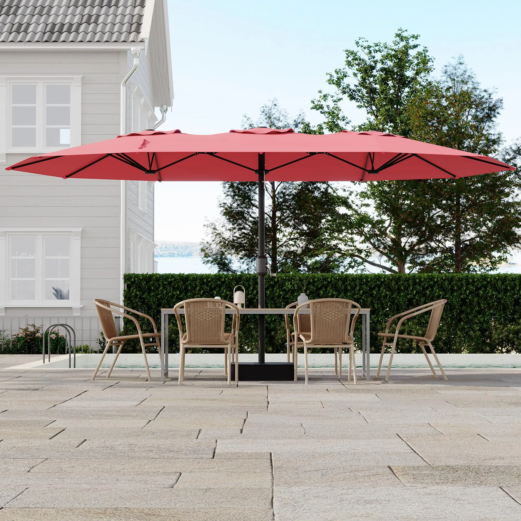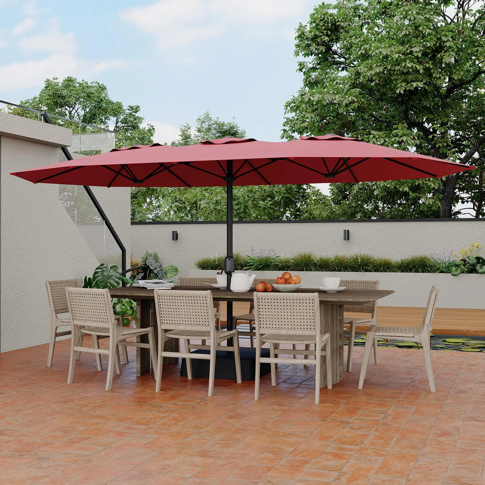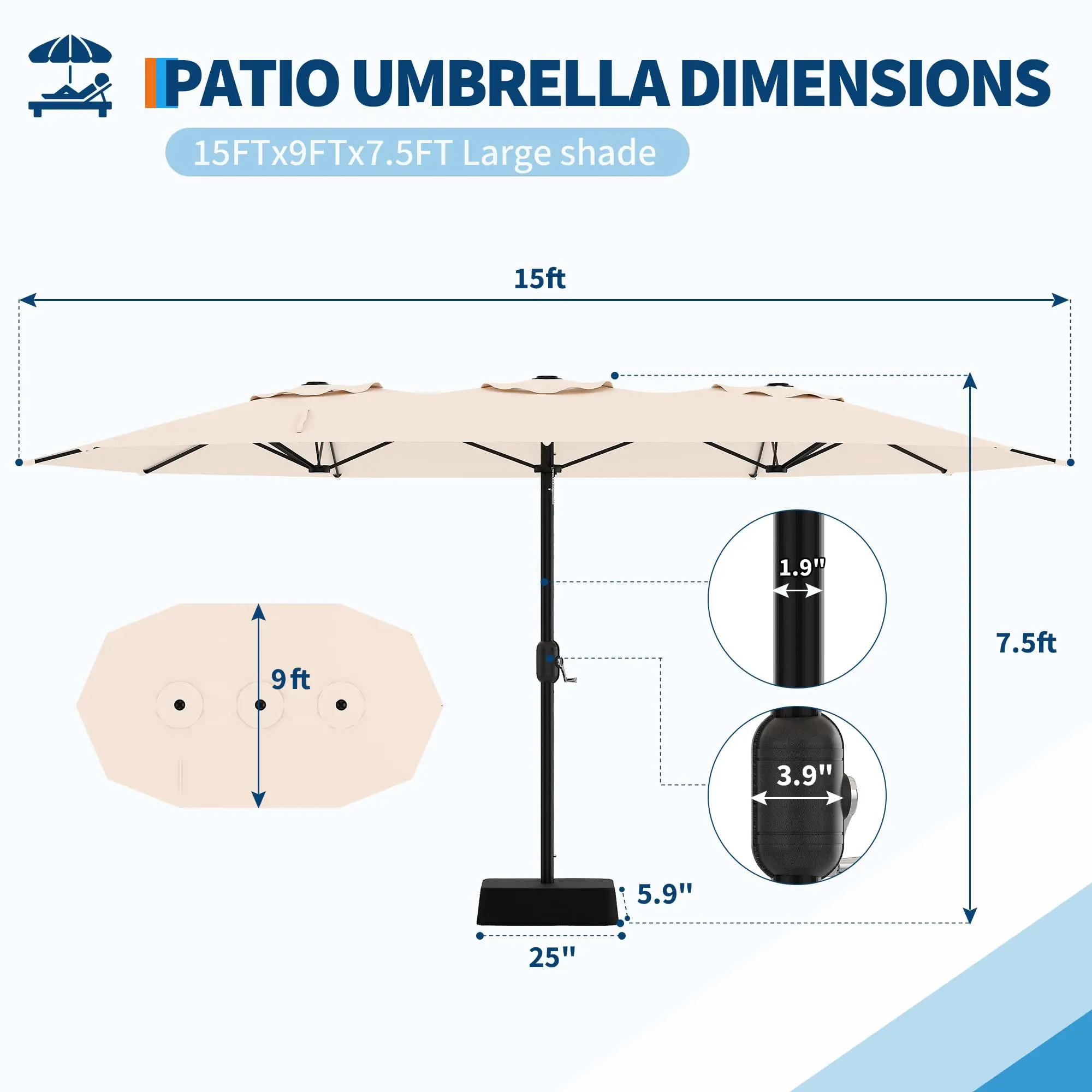 ·1.15FT LARGE PATIO UMBRELLA WITH BASE - Oversized Shade Area: The 15 ft x 9 ft outdoor umbrella offers up to 133 sq. ft. of shaded space when fully open, ideal for pairing with 4-6 person patio dining sets or outdoor furniture arrangements