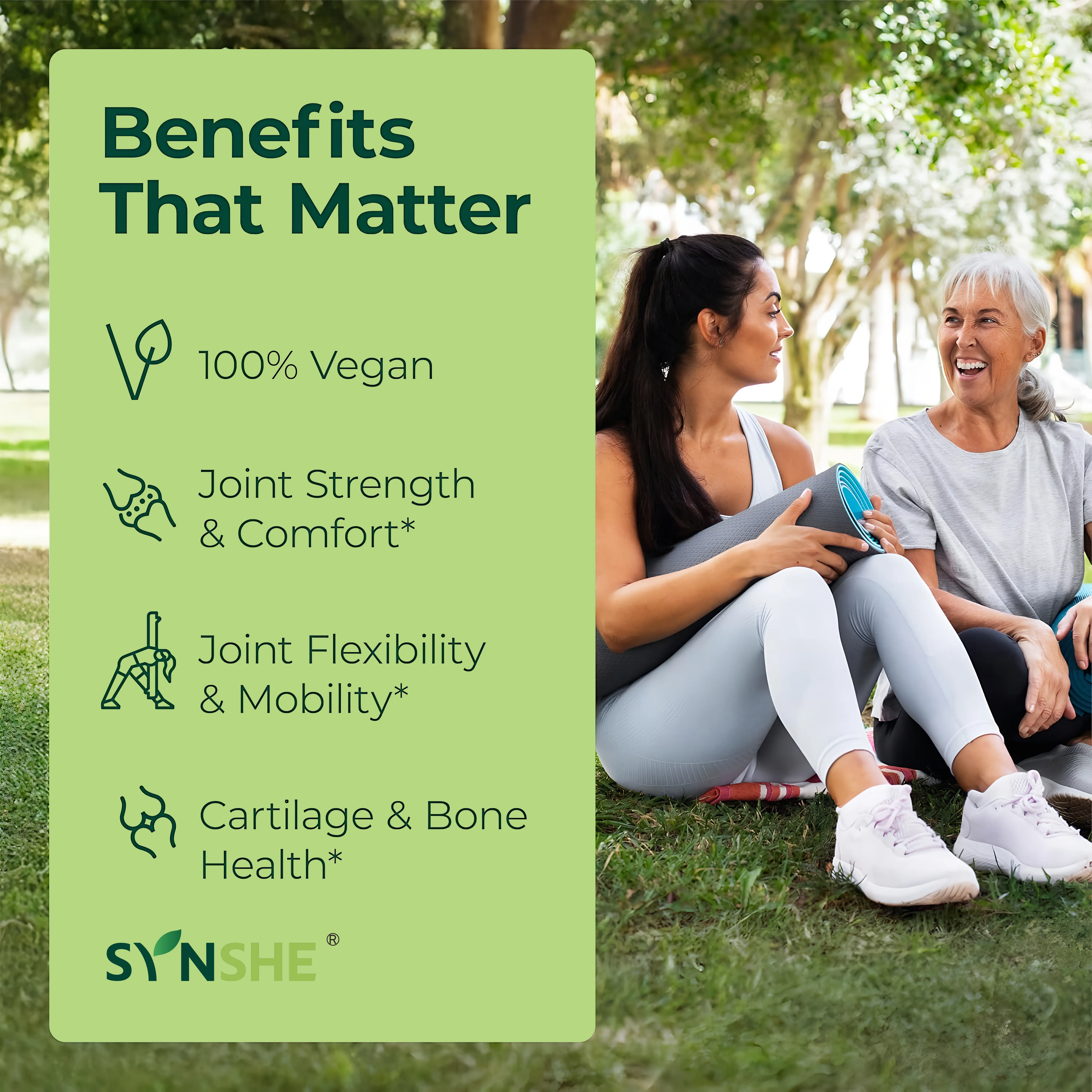 SYNSHE Glucosamine Chondroitin MSM is your daily solution for joint pain relief and long-term mobility. Our triple-strength formula combines 3 key ingredients to nourish, repair, and protect your joints: